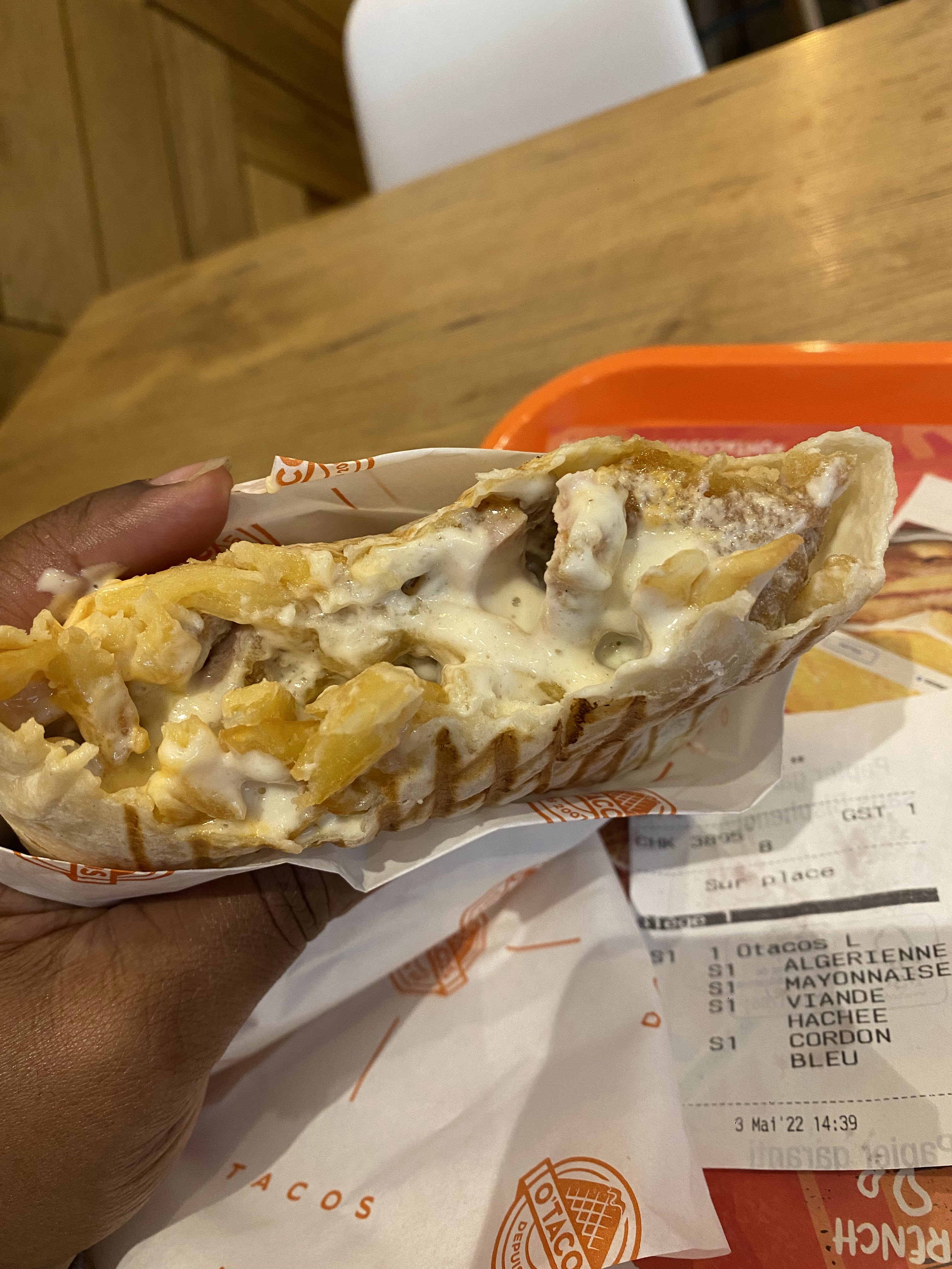 Le service est rapide, l’espace est propre mais pour un tacos viande hachée-cordon bleu, j’ai trouvé la viande hachée absente 😅.