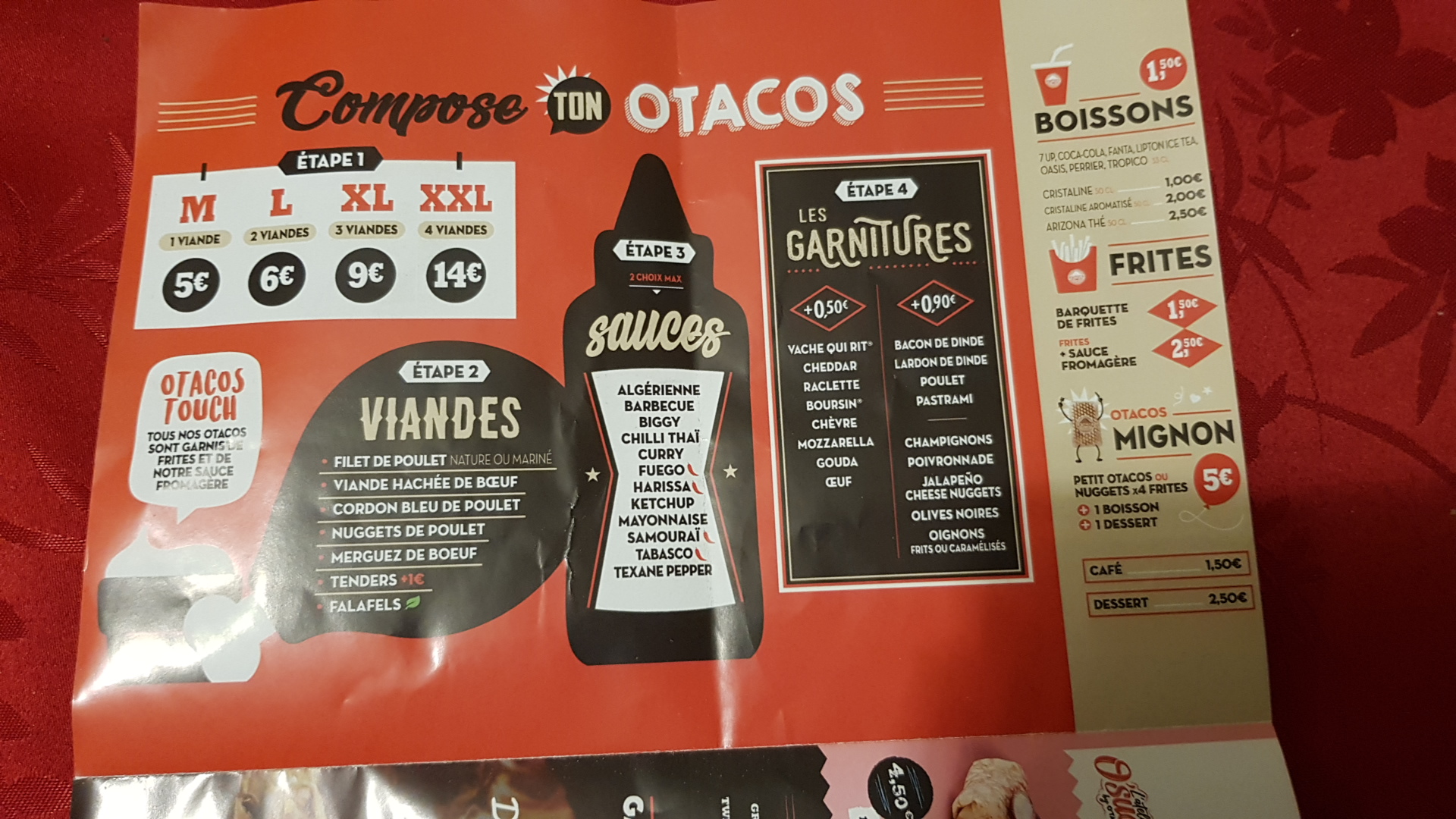 ils sont pas correct ! Je suis un bon client chez eux surtout a Chatelet et finalement ça c'est la deuxième fois que je commande un tacos L a emporter et quand je ouvre je trouve son arnaque ( ils m'ont mis le M au lieu de L et sans oublier le manque de fromage et viande par rapport a la taille du sandwish pourtant tous est bien précisé sur la commande. C'est honteux et Bye bye otacos Chatelet.