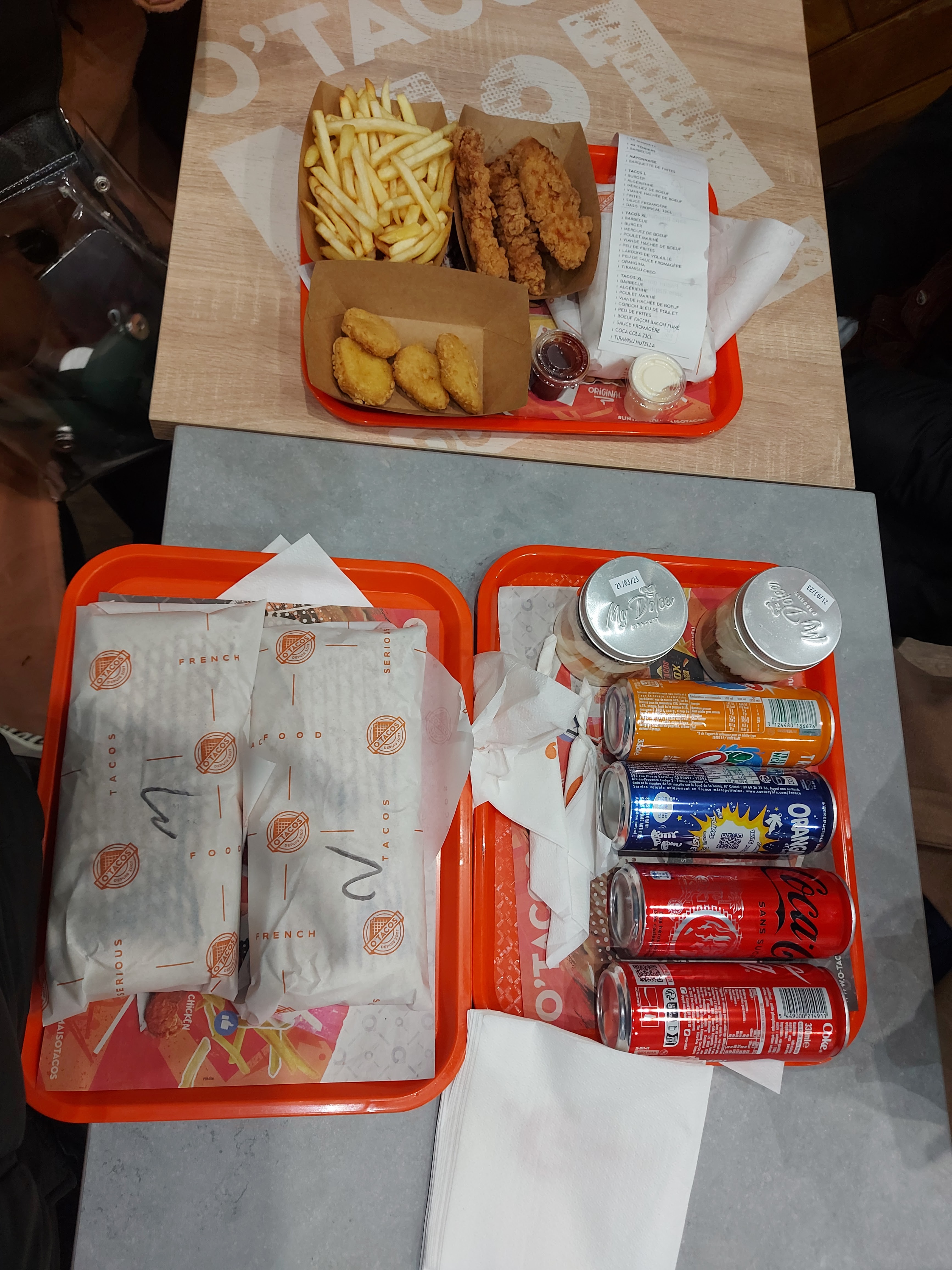 Tacos vraiment bon quantité de sauce correcte mais le cordon bleu il est juste pas comestible, toutes les 2 bouchés je trouve un fragement tout petit d'os, ça dégoûte à un moment (même problème avec les nuggets) sinon rien à dire sur les autres viandes (juste des fois un peu sèches mais bon)