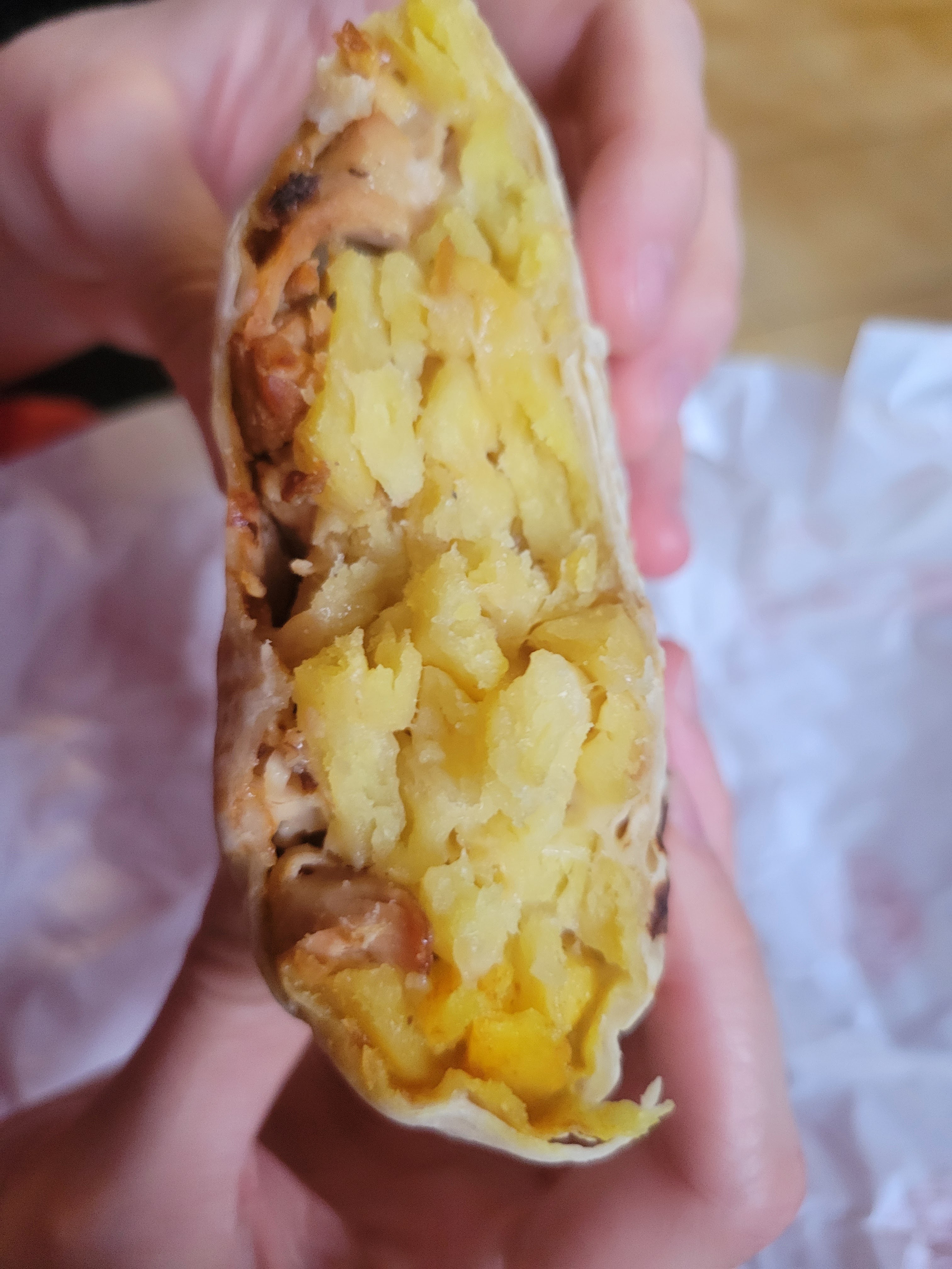 Une galette avec dedans des frites (surgelé) juste assez cuite, de la viande et une sauce fromagère. A la fin les frites avaient macéré dans la sauce, j'ai eu l'impression de manger une purée de frite avec un peu de viande dans une galette. Je n'ai même pas réussi à le finir.... Dommage, belle promesse au départ et grosse déception a arrivée