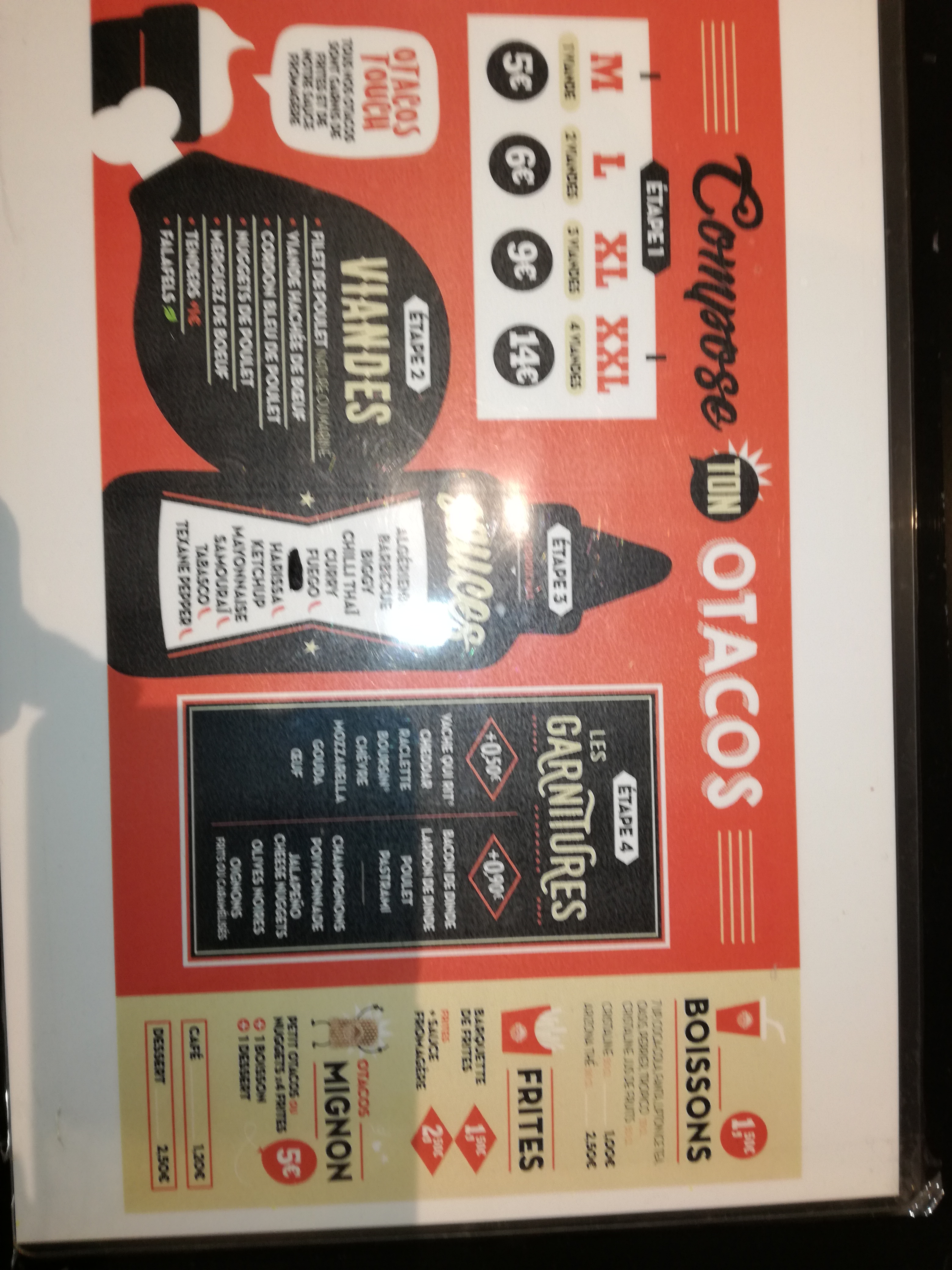 Pour ma part très très déçu. J'ai pris un tacos double galette trois viandes, il n'y avait pratiquement pas de sauces fromagère a l'intérieure, de plus la taille fesait pitié les deux galette était enrouler lune sur l'autre même pas espacée ... Même la viande kebab n'est pas disponible offre limité, Il n'y a pas de menu tout en supplément canette et barquette de frite ( les frites étaient toute môle, elles ont était recuite c'est une honte pour 1,5€ des frite réchauffer... ) que du marketing pour attirer les client c'est pire que le chamas si vous voulez des bon tacos plein de sauce fromagère allez au Taconam ou bien Hk tacos pour ma part c'était la première et dernière fois, je me fesait une joie de venir chez Otacos depuis le temps que j'en entendais parler mais la je suis pire que déçu après peut êtres que je suis tombez sur un mauvais jours ou un mauvais cuistot mais faut faire un truc !!!
