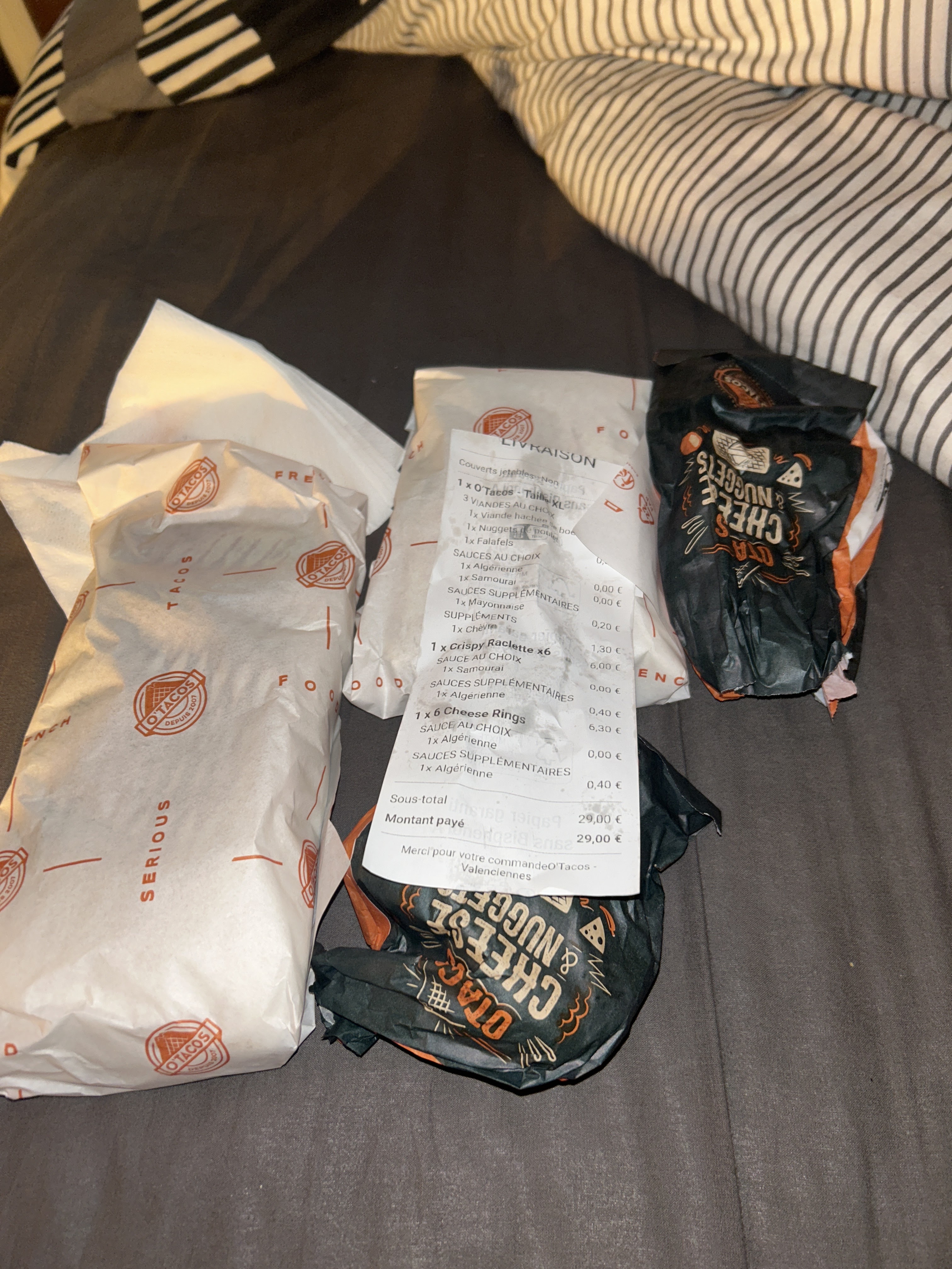 Plus jamais. Il y avait un moment que je n’étais plus allé à o’tacos Valenciennes car déçue de trop nombreuses fois, aussi bien pour des oublis, pour des erreurs de commandes (trop fréquentes), la mauvaise qualité des tacos (trop fréquente aussi) ou encore l’accueil, qui ne vous donne qu’une envie c’est de vous en aller ! J’ai réessayé aujourd’hui me disant qu’ils avaient sûrement rectifié les choses qui n’allaient pas… Au contraire ! Rien n’a changé. Morceaux de gras dans le tacos de mon copain, et tacos totalement incohérent avec le mien ! J’ai commandé un L tenders/escalope avec sauces, j’ai reçu un M merguez, sans sauces. Je n’y remettrai plus les pieds. Pour moins cher vous avez le frensh tacos qui est a 100m et qui est bien mieux sous tous les angles !