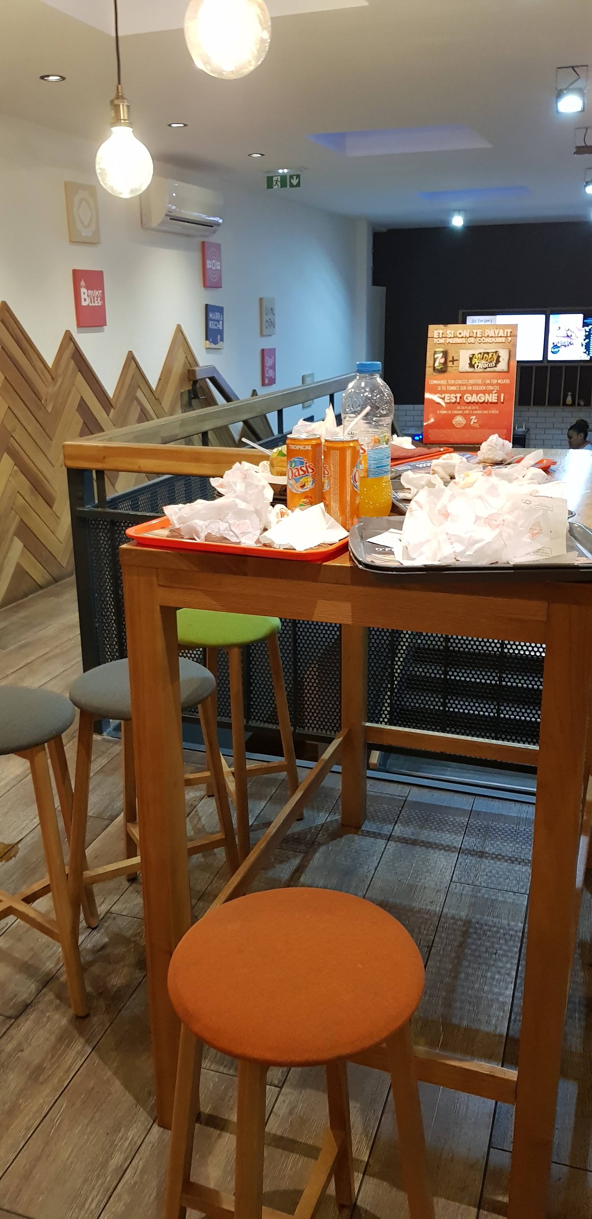 Oubli de sauce dans mon tacos donc tout sec, la dernière fois en octobre on m’a mit du poulet mariné a la place du falafel, les amis m’accompagnant ont aussi eu récemment des problèmes dans leur commande. C’est dommage car avant il y avait bcp moins de problème, c’est du gaspillage et des clients insatisfaits. Pour débarrasser son plateau tout est sale et plein de déchets, on ne voit pas ça dans les autres fast food je pense que cela peut être amélioré.