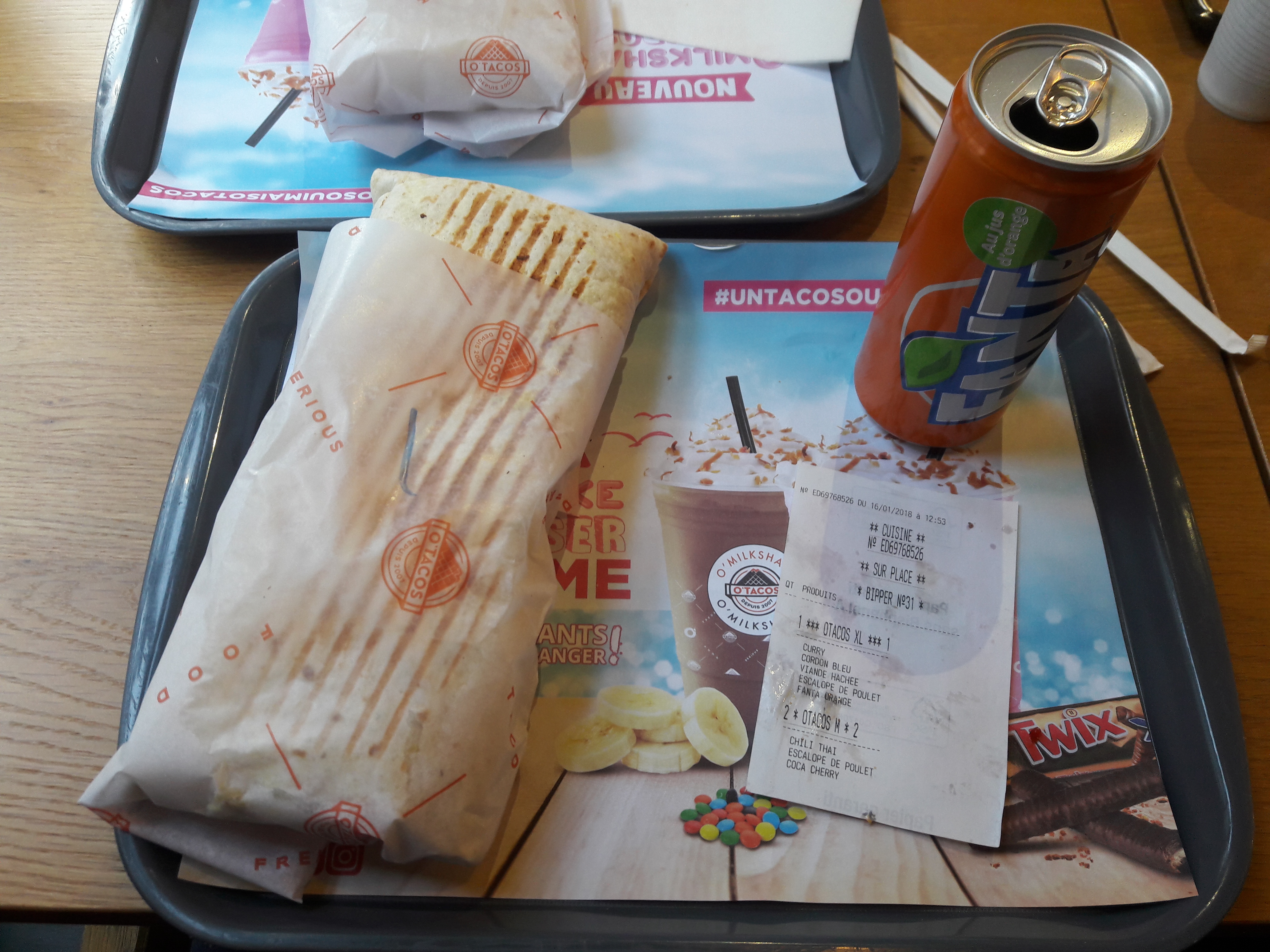 O'tacos, chaîne de fast-food française, propose un des plats mexicain les plus connus, mais d'une manière revisitée. Étant une chaîne de plus en plus connue, et appréciant la nourriture mexicaine, je me réjouissais à l'idée de la découvrir. En souhaitant commencer par les basiques, je prends donc une formule simple avec uniquement de la viande hachée (comme un tacos classique), avec juste un petit ajout de cheddar. À priori le menu est accompagné de frites. Quelle n'a pas été ma surprise : la viande (malgré être accompagnée de sauce) est insipide et sèche et n'a aucun goût, la sauce qui est plus proche d'une béchamel est très loin d'être savoureuse, et j'ai tout juste pu sentir des pointes de mayonnaise. D'ailleurs, je n'ai jamais pu me rendre compte où était mon ajout de cheddar. Ne parlons même pas des frites, qui sont d'ailleurs des frites industrielles). Contre toute attente elles sont à l'intérieur de cette brique, qui se retrouvent être complètement molle et contribue à donner l'impression d'un gloubiboulga général. Au final, on est loin de la dégustation et l'on a plus l'effet de se bourrer le ventre plutôt qu'autre chose.
