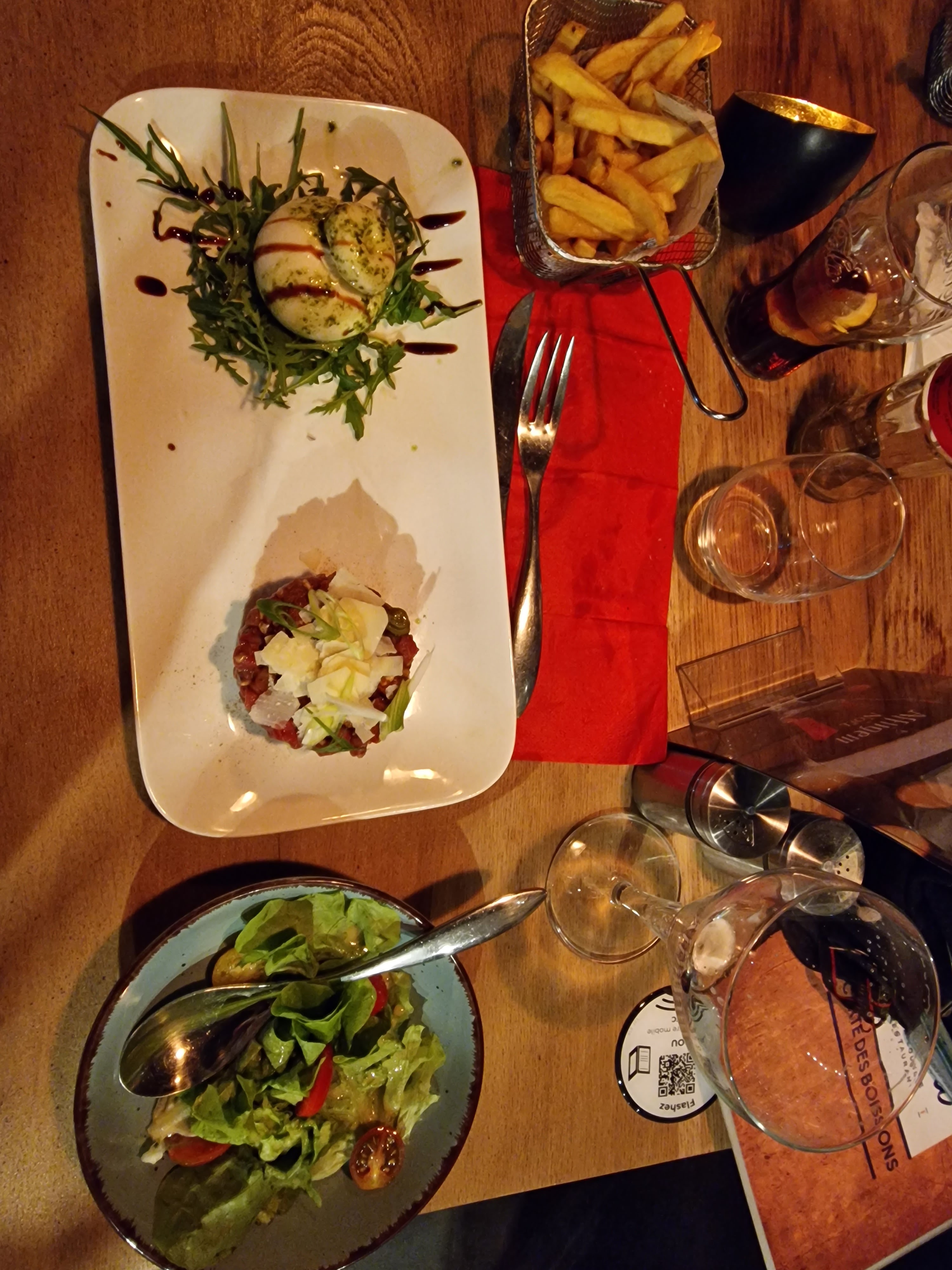 Dîner en couple le soir, salade de chèvre sans grande cuisine avec 4 feuille des salades, un bout de pain avec du chèvre et 3 tomate cerise coupée en deux avec une vinaigrette qui je pense toute faite. Monsieur une cotes de bœuf bien cuite qui revient saignante et sur redemande toujours plus que rosée. Un jarret de porc pour moi même, gras, noir et vraiment très petit. Des frites à partager ou il manque de la cuisson et des portions minim. Pris 3 profiteroles et bien plein plein plein de chantilly qui coule ( car bombe) et 3 choux sec avec 3 boule de glace dedans. Un service correct mais uniquement pour fred mais les demoiselles blonde laisse à déciree ! Pour résumer repas fade et minim. Un service bien mais reste ultra pro donc les sourires c’est pas l’endroit ! Je n’irai plus