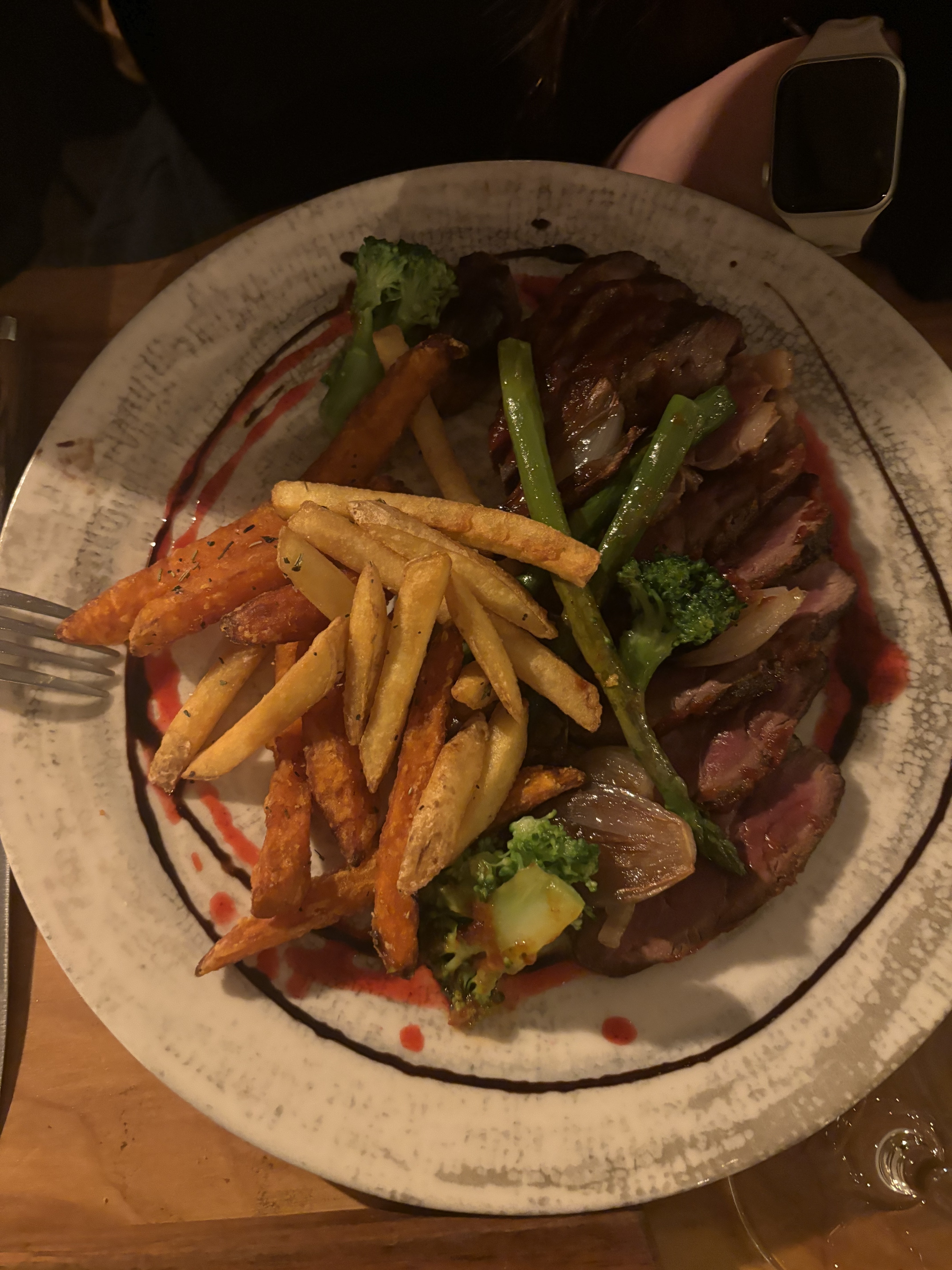 Copieux, mais subtil cornet de frite patates douces aux herbes de Provence. Planchas très belles. Personnel qui de plie en 4 et répond à nos souhaits et question. Prix correct. Je recommande.