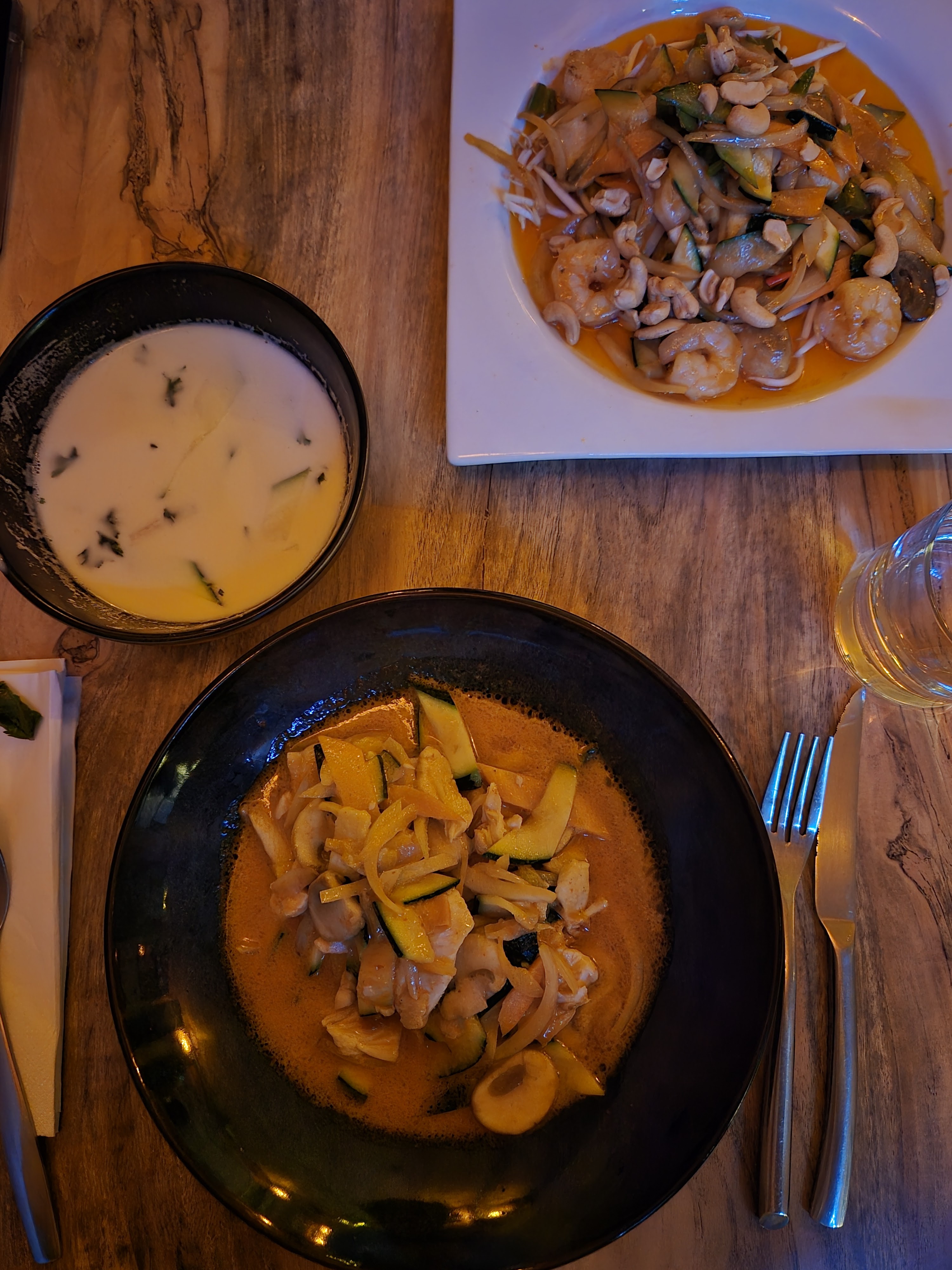 Nous avons passé un très bon moment. Nous avons apprécié la qualité de la nourriture et les quantités servies pour un prix raisonnable. La soupe est surprenante, très douce et fruitée. Le poulet curry rouge est épicé juste comme il faut, mais juste un peu trop salé à mon goût. Enfin la personne qui nous a accueilli et servi etait extrement gentille et agréable. We had a great time. We appreciated the quality of the food and the quantities served for a reasonable price. The soup is surprising, very sweet and fruity. The red chicken curry is spicy just right, but just a little too salty for my taste. Finally the person who welcomed and served us was extremely kind and pleasant.
