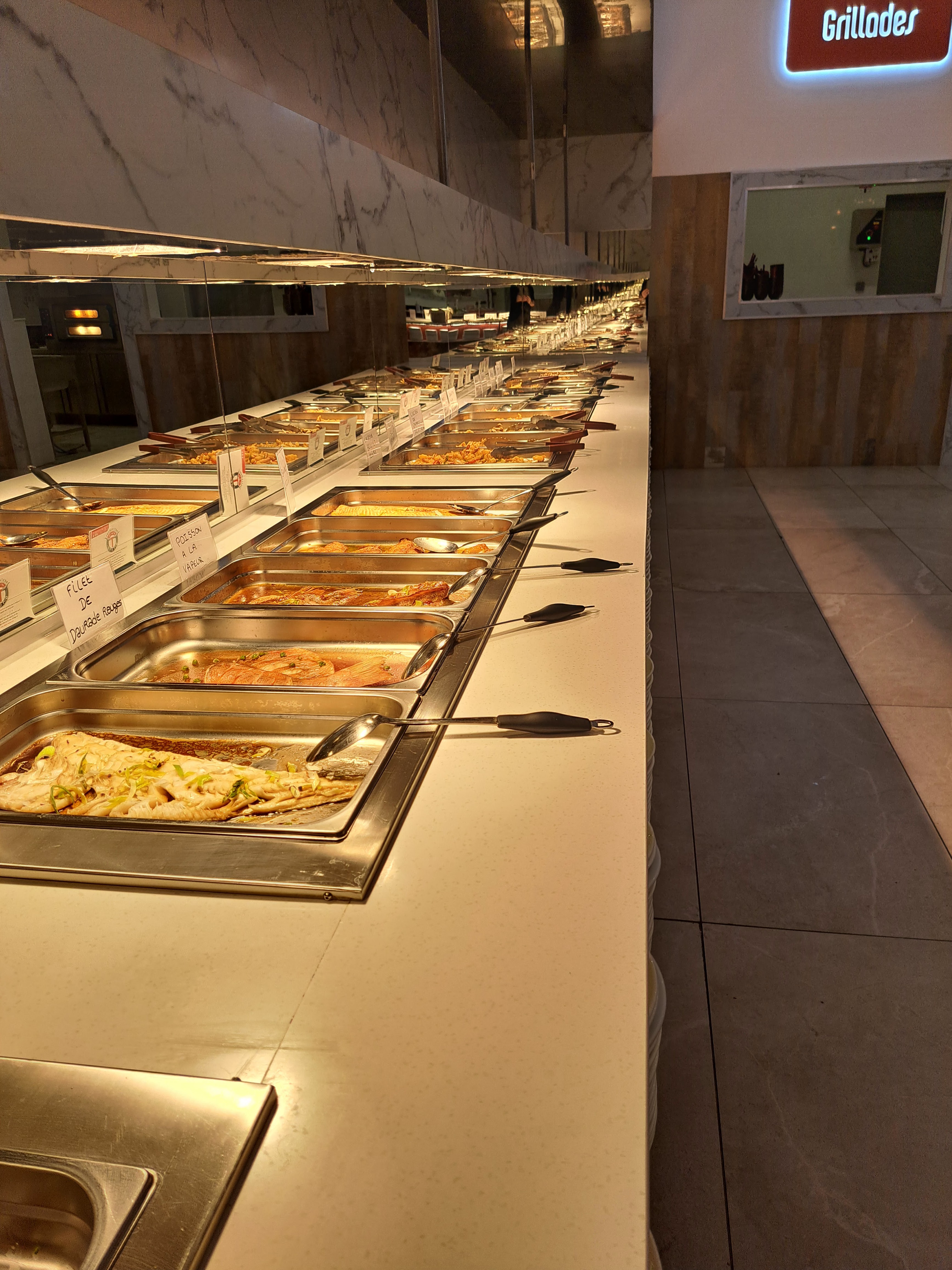 Bon restaurant qui fait un peu penser aux buffets des hôtels all inclusive en Espagne. Un immense choix en plats et desserts. Les gourmands seront ravis. Le seul bémol est qu il faudrait nettoyer plus régulièrement les vitres et les plaques numérotées qui se trouvent au dessus de certaines tables. Sinon, j ai été ravie.