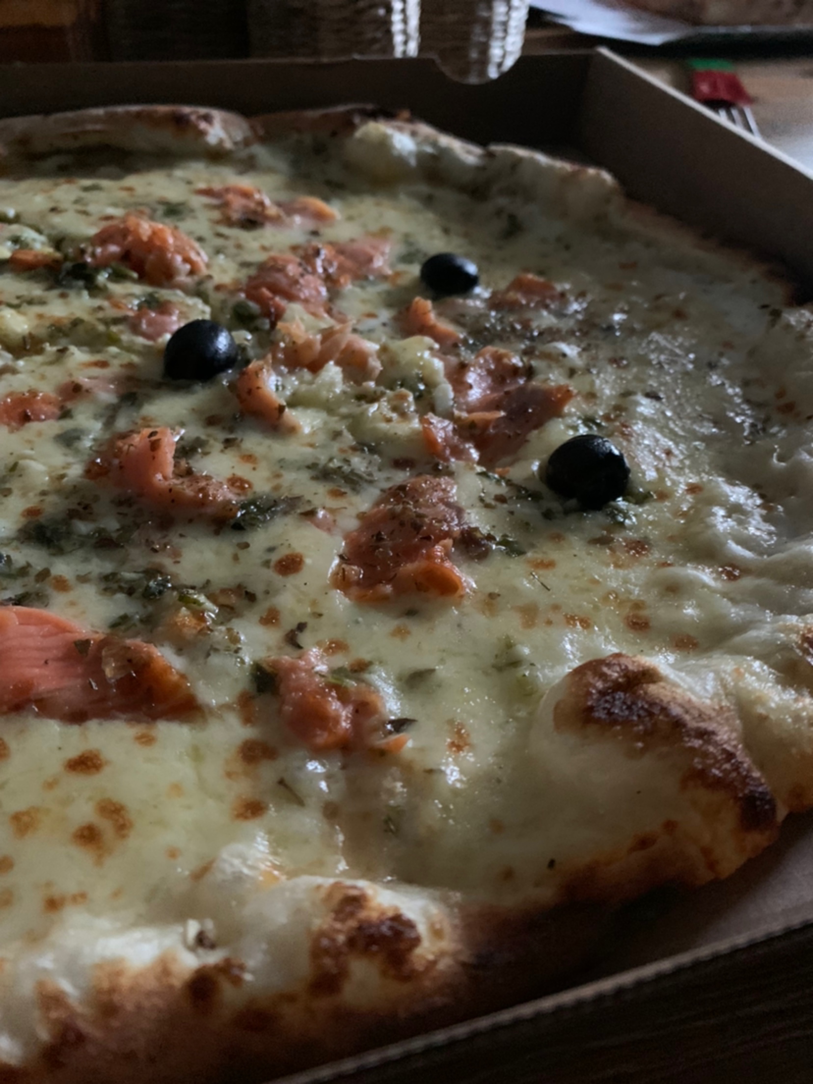 Trois bouts de saumon qui se balade dans la pizza !! Pas genereu du tout ! Une barquette de pates bolognaise a 12€ a peine pour rassasier un enfant ! Pizza aucun gout ..je deconseille