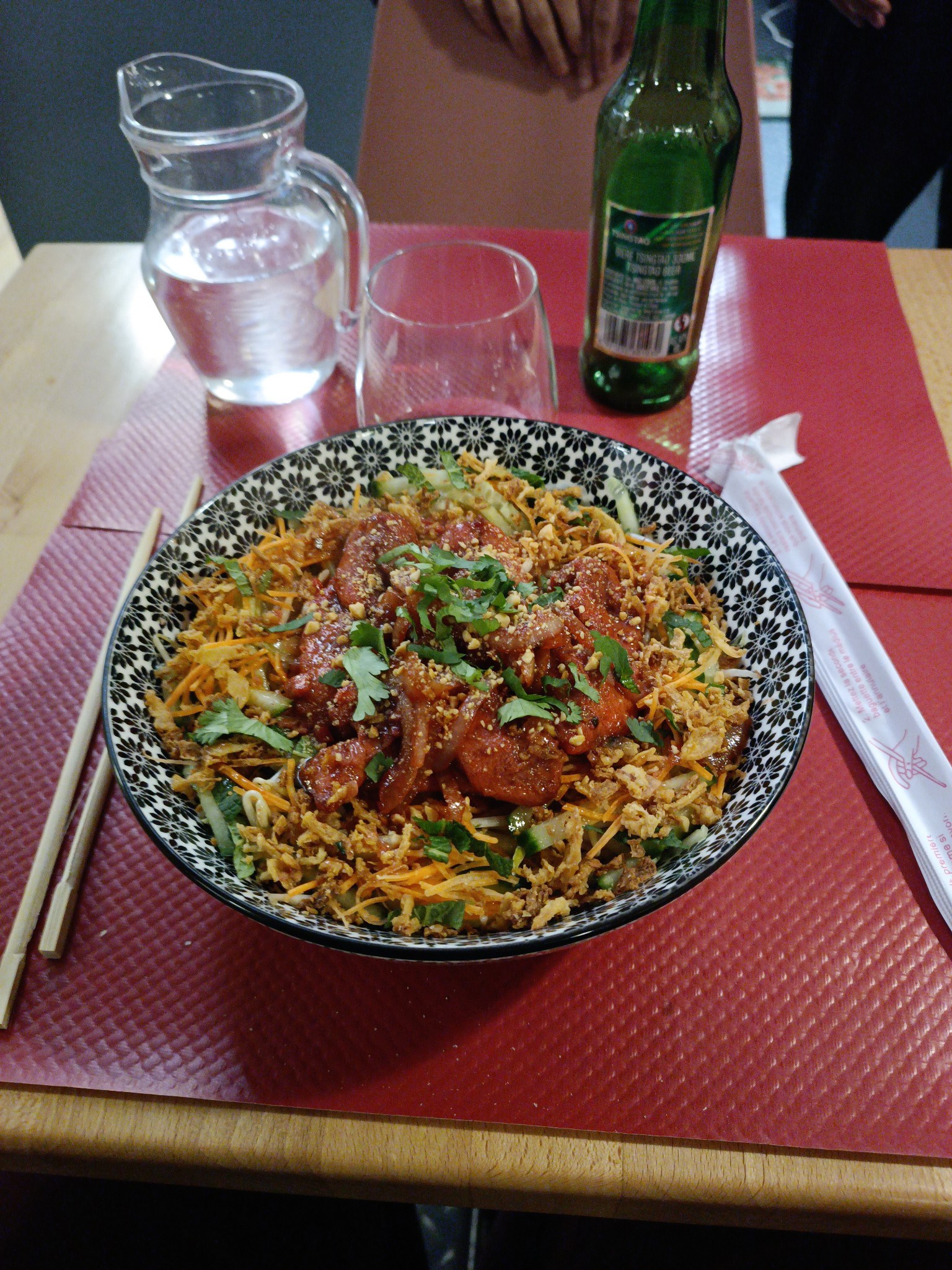 La nourriture était correcte mais pas spécialement enthousiasmante (Bo bun qui manque de parfum et de sentiment de fraîcheur). J'étais désolé de ne pas m'être régalé (ce n'était pas mauvais non plus), d'autant plus que c'est un restaurant familial comme on aimerait en voir +. Le patron m'a gêné à autant solliciter tout le temps qu'on aime sa nourriture : poussant trop souvent à répondre à ses questions vous aimez?, ou à noter son établissement sur Google, vantant sa cuisine comme s'il était un grand chef... Un peu plus d'humilité svp, couplée avec des progrès dans l'assiette ; et le succès viendra sans être lourd avec les clients. Merci !