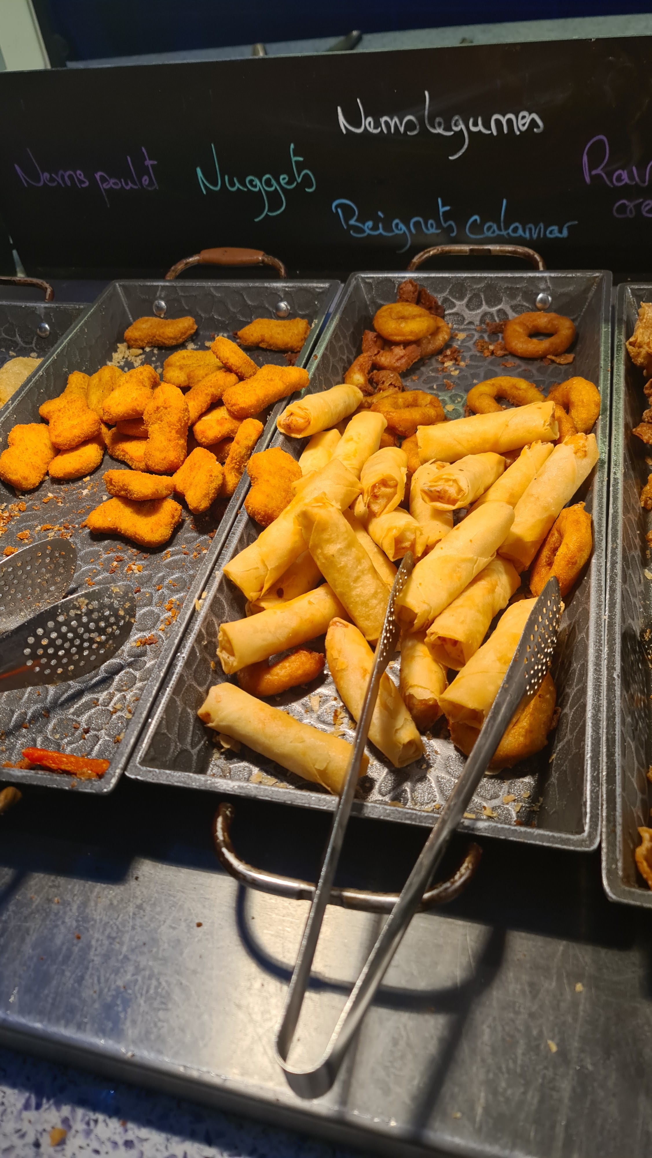 Vraiment beaucoup de choix, un buffet énorme et réapprovisionné régulièrement, japonais, chinois, grillages, fruits de mer, pizzas, fromages...pour les desserts je préférerais moins de choix mais de meilleure qualité. Rapport qualité prix très correct pour moi. Possibilité de vente a emporter très pratique, on paye 60cts pour tout c simple. Pour le enfants il y a une aire de jeux intérieure, assonorisee et transparente, vous pouvez manger tranquillement en les surveillants.