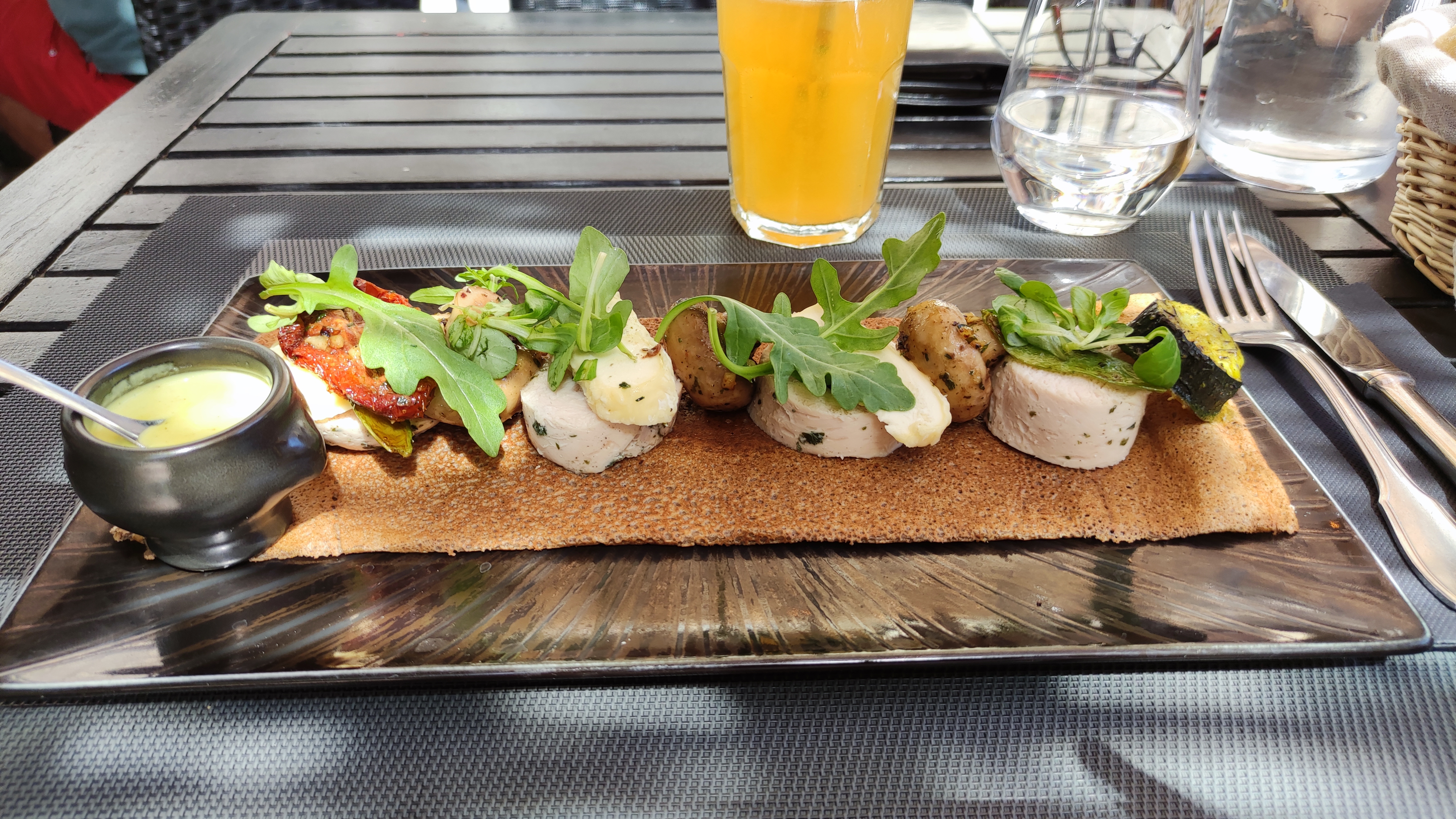 Repas délicieux pris en terrasse. Le service est parfait, la carte surprenante alliant crêpes et plats gastronomiques, mais quelles crêpes ! Fameuses et inventives... Belle présentation des assiettes et accords des mets parfaits (Veau mariné & Thon par exemple...) Bravo au chef