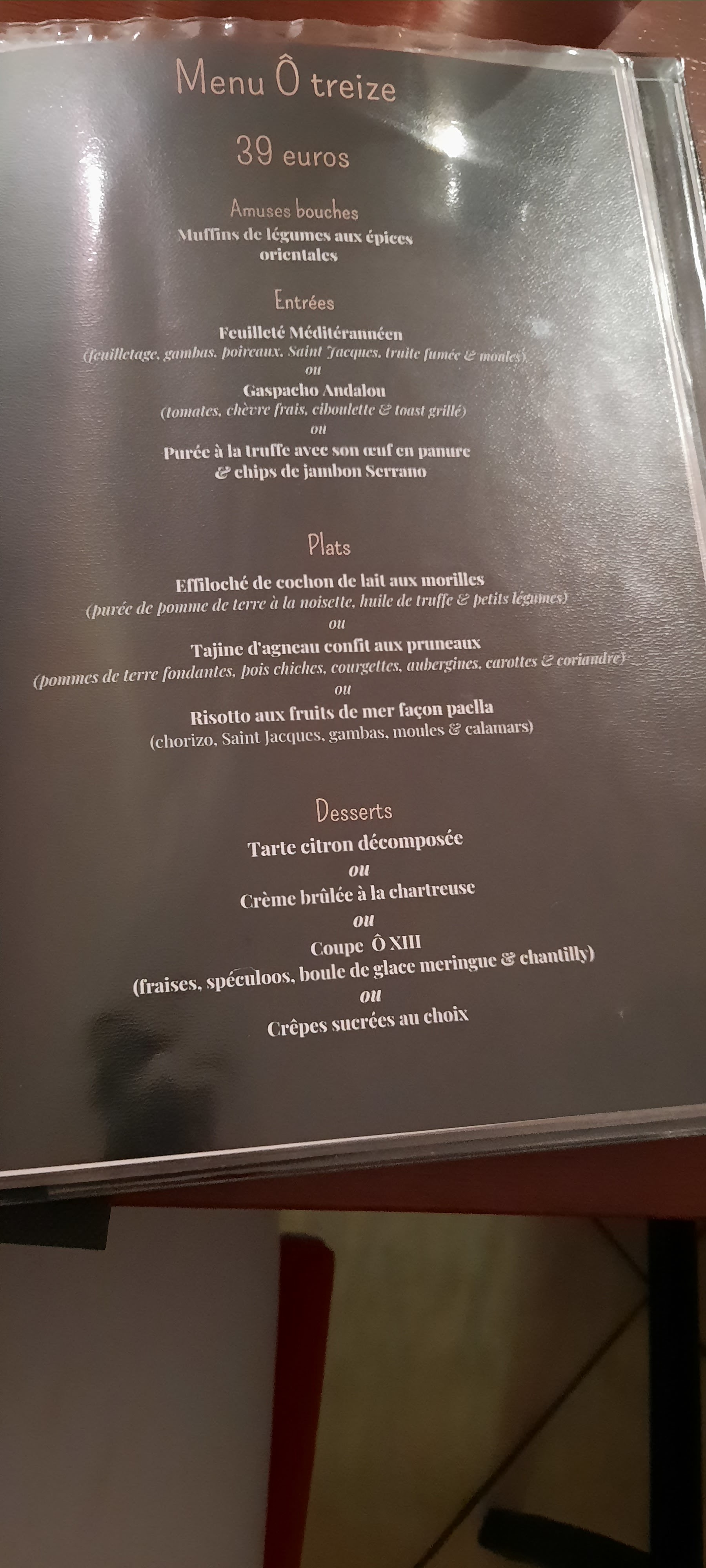 Ô XIII restaurant découvert pour la saint Valentin et qui a ravis nos papilles. Dans un cadre intimiste le service est efficace et sérieux toujours avec le sourire et de la bienveillance. Quant à la cuisine, juste parfaite, une présentation soignée un régal pour les papilles et réalise avec des produits frais qui sont travaillés. Je recommande à 200%