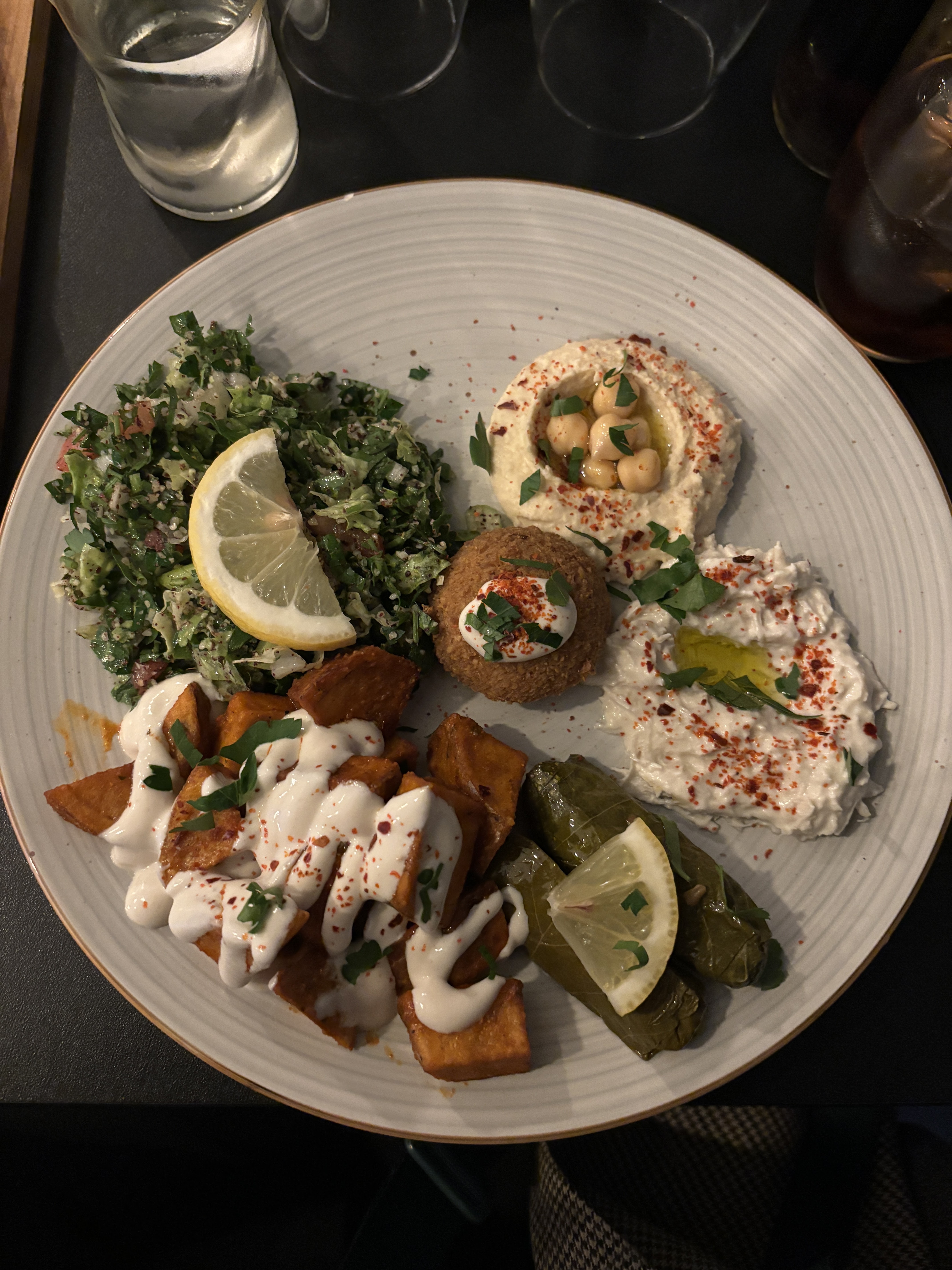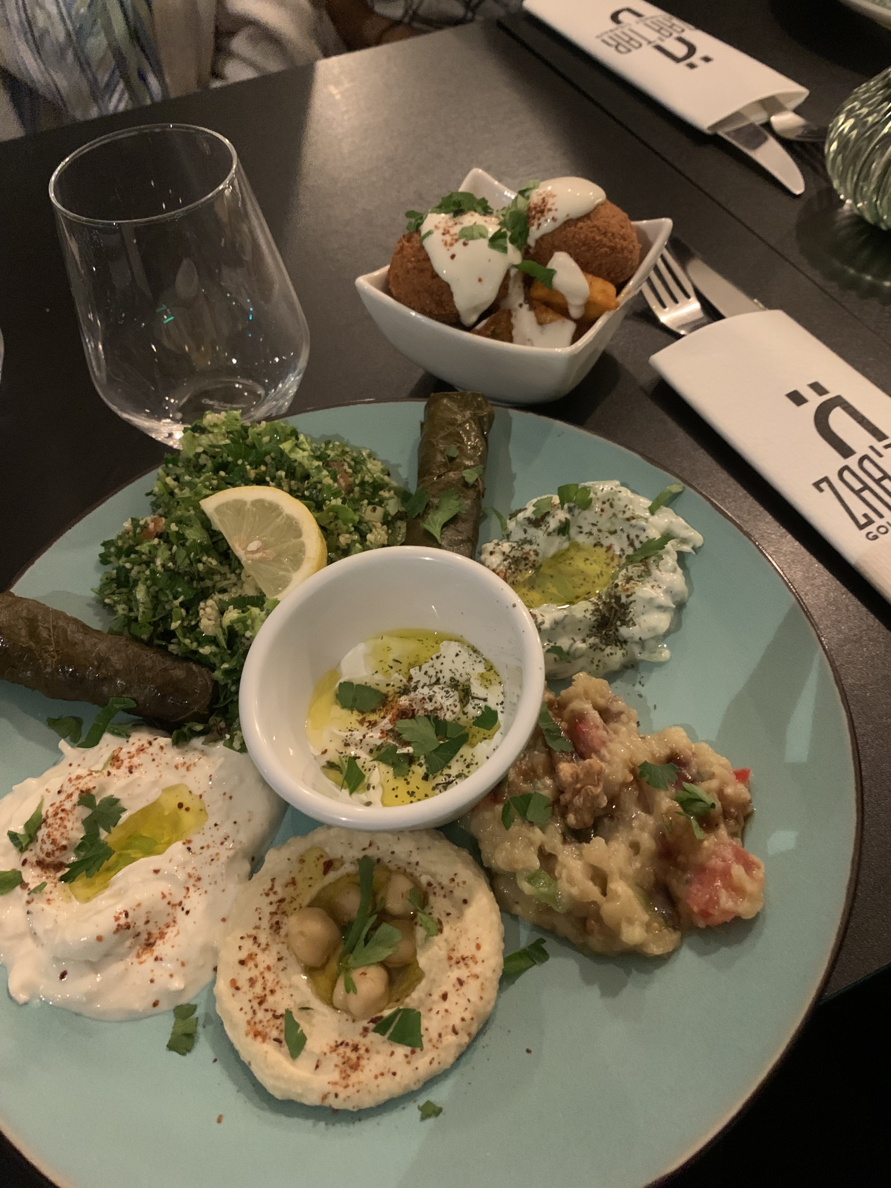Petit restaurant libanais par le nombre de tables, excellent pour les saveurs et le service J'ai pris un assortiment de mezzanine et desserts. Mes amis ont choisis quelques mezzes. C'était excellent.