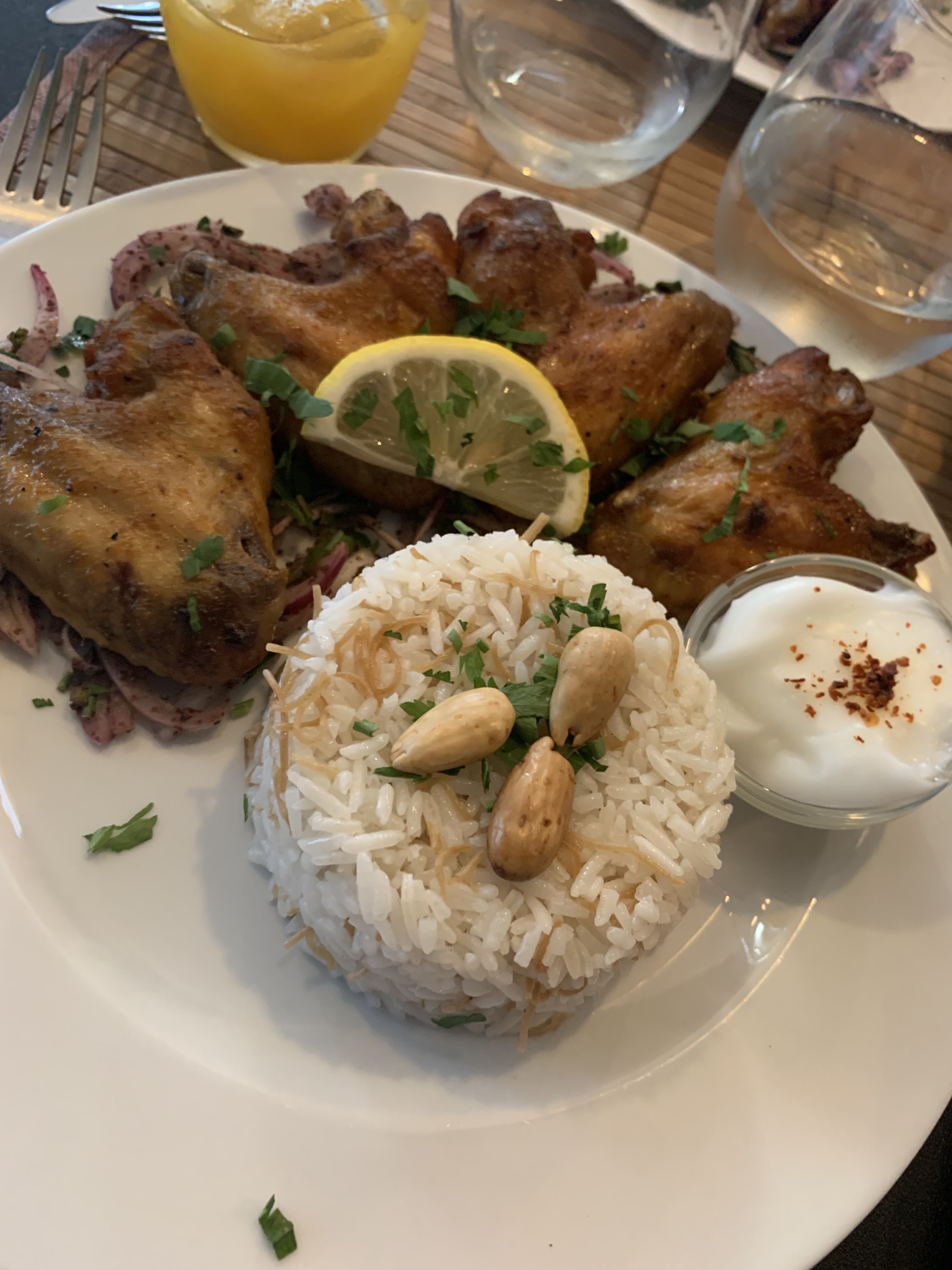 Tout simplement excellent! Tant le service que l'accueil et la qualité des plats servis. Ne passez pas à cote du café gourmand, les meilleurs baklava et mahmoul sont là! Notre bébé de 10 mois s'est senti chez lui (un peu trop même, désolé pour les miettes par terre!). Nous avons pris une formule déjeuner avec 6 mezzes choisis par le chef et des ails de poulet avec un riz aux amandes succulent + café gourmand! A très bientôt!