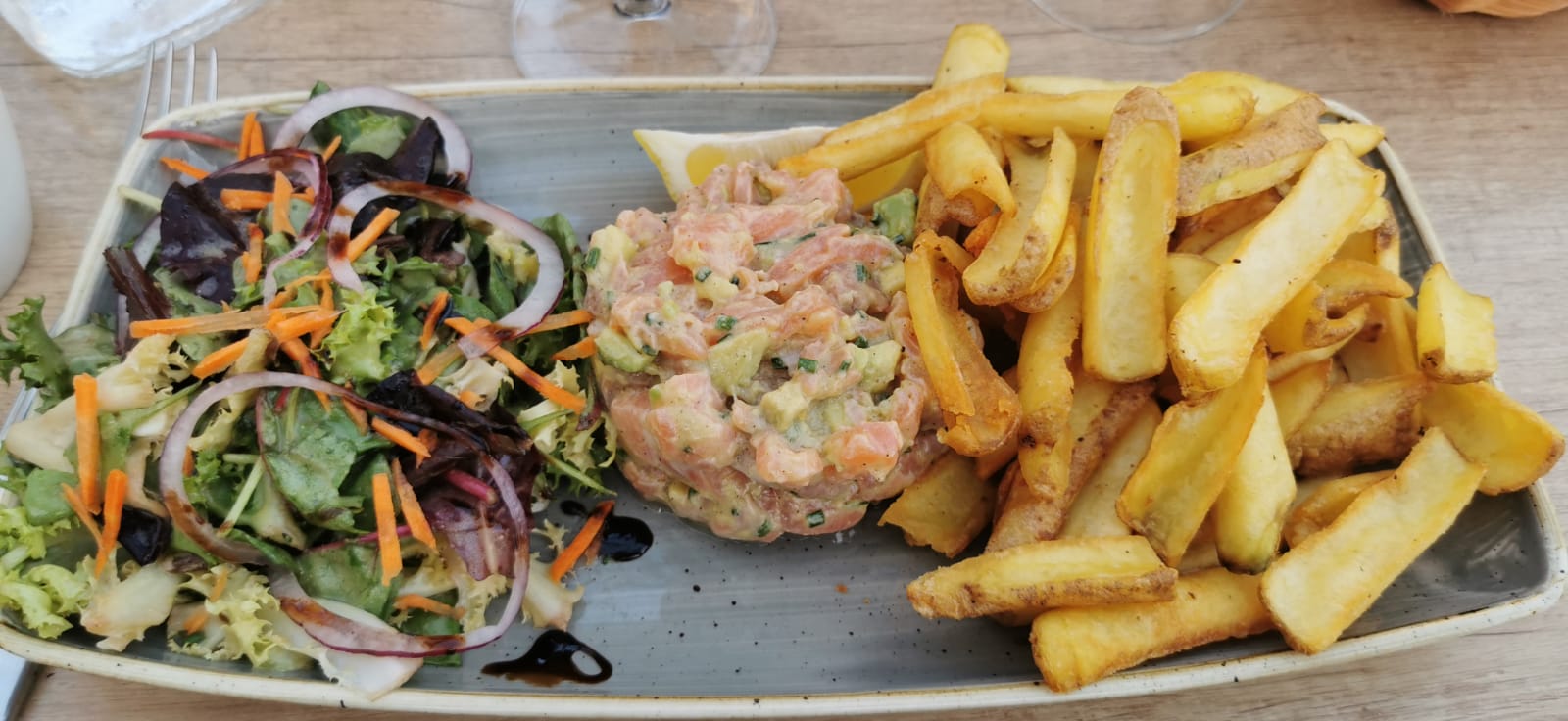 Hormis un acceuil chaleureux du personnel efficace serviable et souriant ... je ne vois pas quoi dire .. A lire les commentaires je suis sûrement mal tombé ou j ai mal choisi.. un festival de surgelé du début à la fin. Pourtant à voir les tables environnantes nous n avons rien choisie d extraordinaire une assiette de tapas à partager en guise d entrée et deux tartares ! Les tapas sont surgelés, les frites aussi, la salade n est pas fraîche et la vinaigrette est industrielle ! Rien dans l assiette ne vaut le détour. Et au regard de la prestation je trouve l addition assez salé.