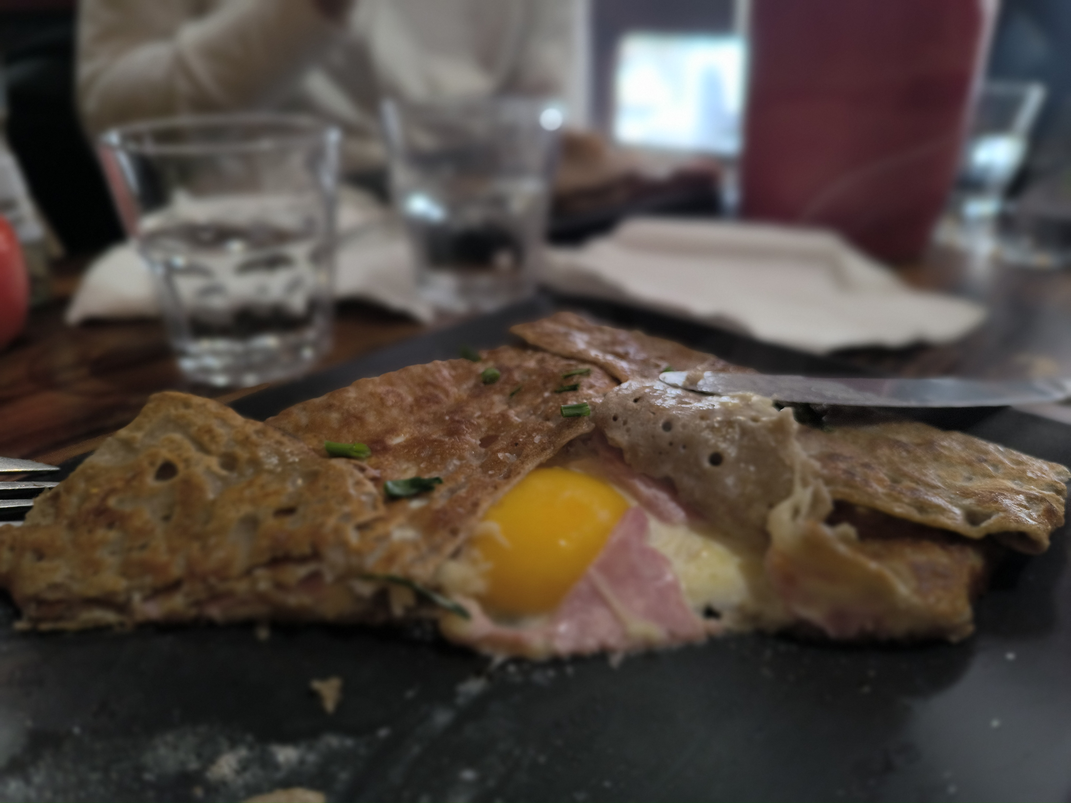 Un endroit charmant pour déjeuner, prendre un café et une gallette accompagnée de quelques légumes verts. Une crêpe de bonne taille.