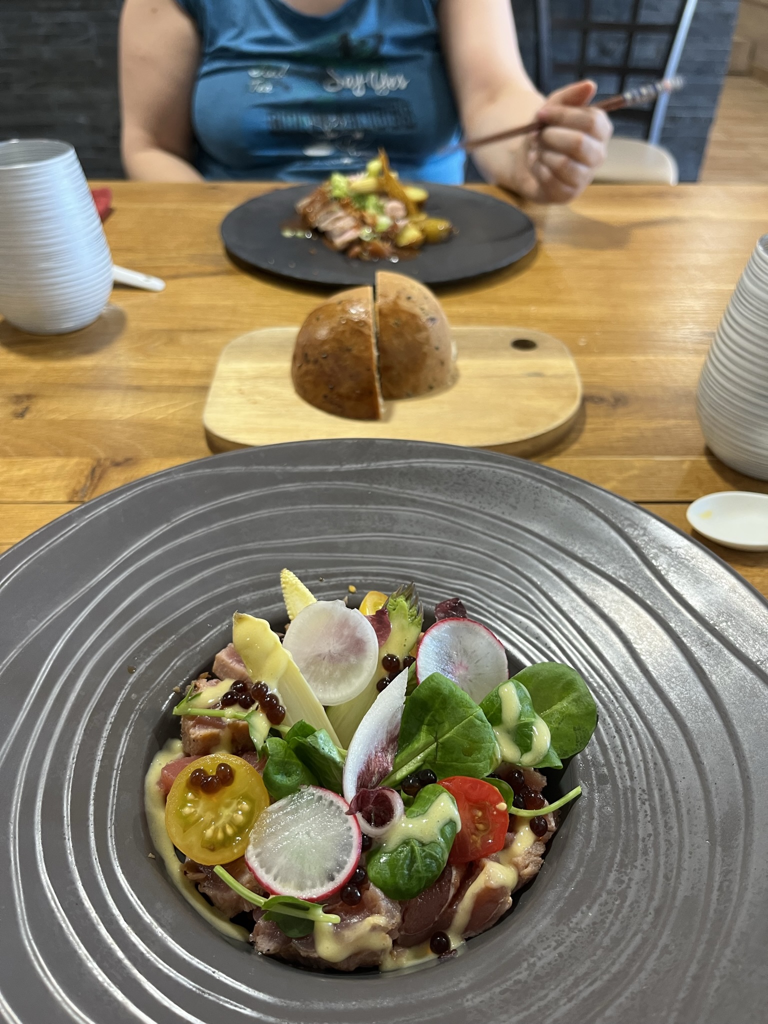 Nous sommes allés deux fois à ce restaurant. La première fois à l'été 2022, nous avons beaucoup aimé le déjeuner bien que un peu cher Nous avons trouvé le serveur un peu envahissant (le patron ?). Nous y sommes retournés en février 2023 et nous avons trouvé l'endroit sale: des poussières, des miettes sur les banquettes, sur le sol, les tables mal nettoyées. Le même serveur nonchalant et trop bavard à notre goût. Aussi, les bouchées au poulpe étaient encore congelées au milieu. Bref, nourriture moins fine que l'été dernier et expérience globalement désagréable avec le serveur.