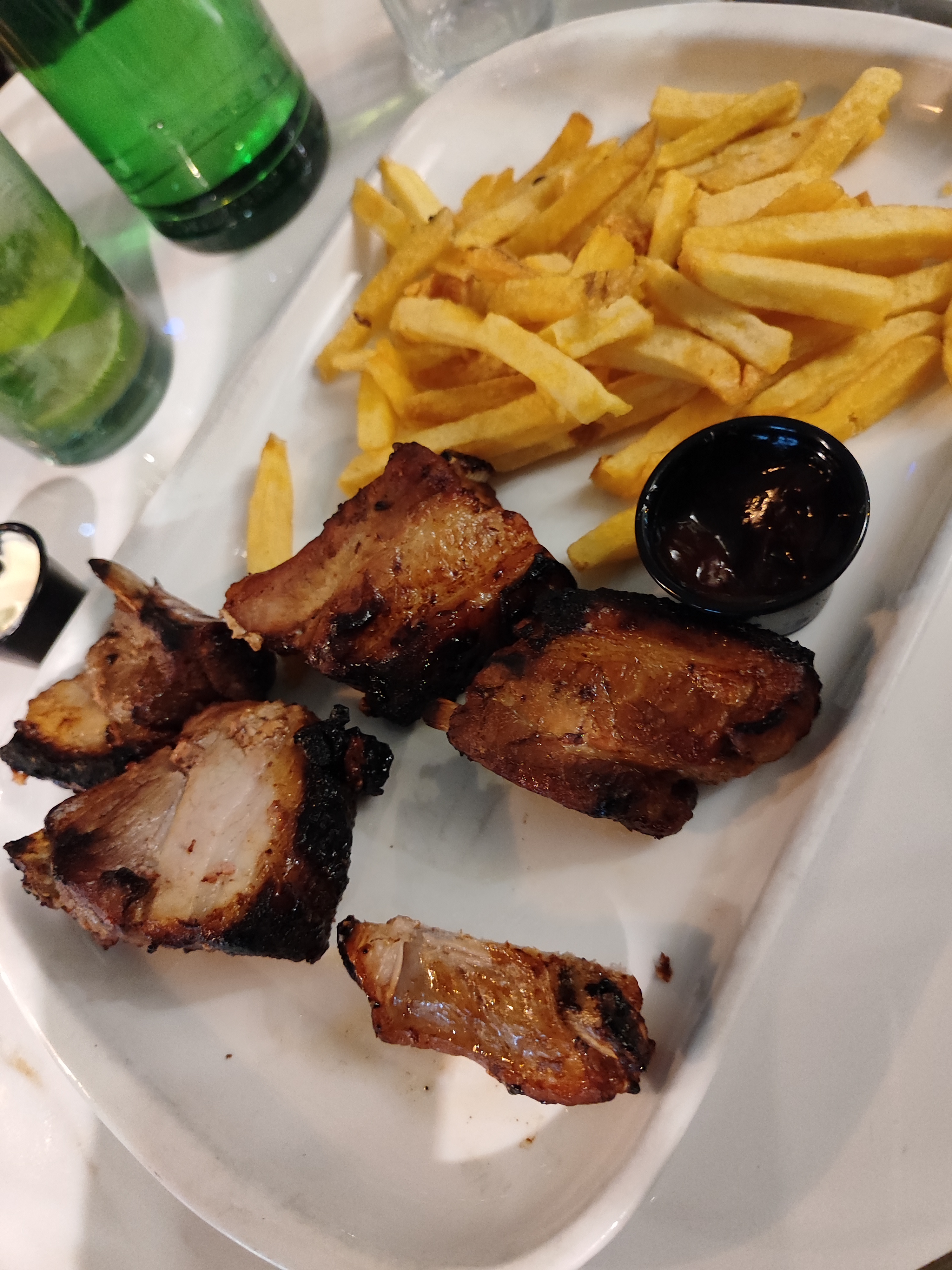 Avis aux amateurs de viande type latino, c est le bon endroit. La brochette est succulente, la côte de veau extra. Petit bémol: l'apéritif est servi sans cacahouète ou autre snack salés. Ils nous ont qd même donné des frites à la place. Je recommande
