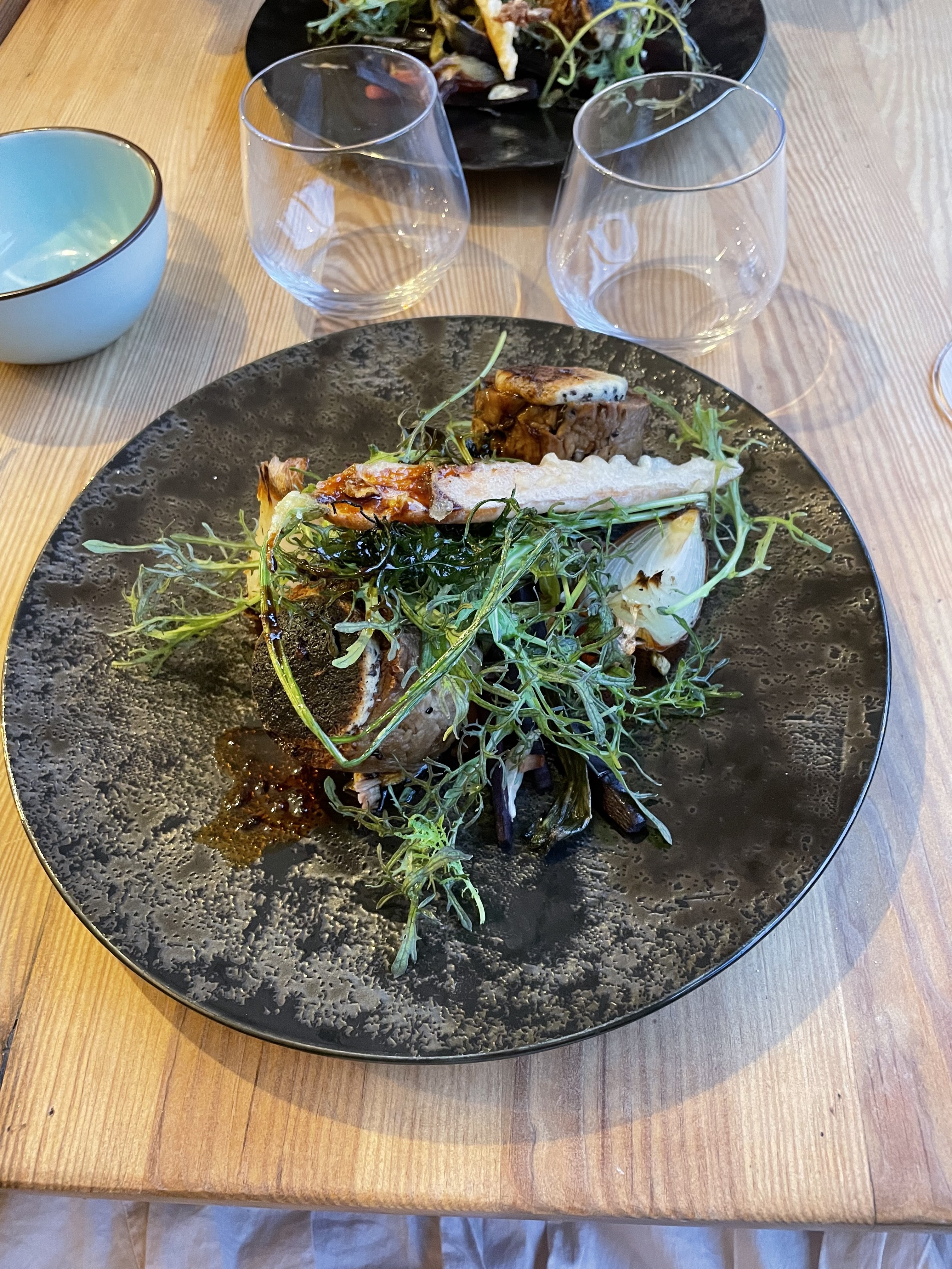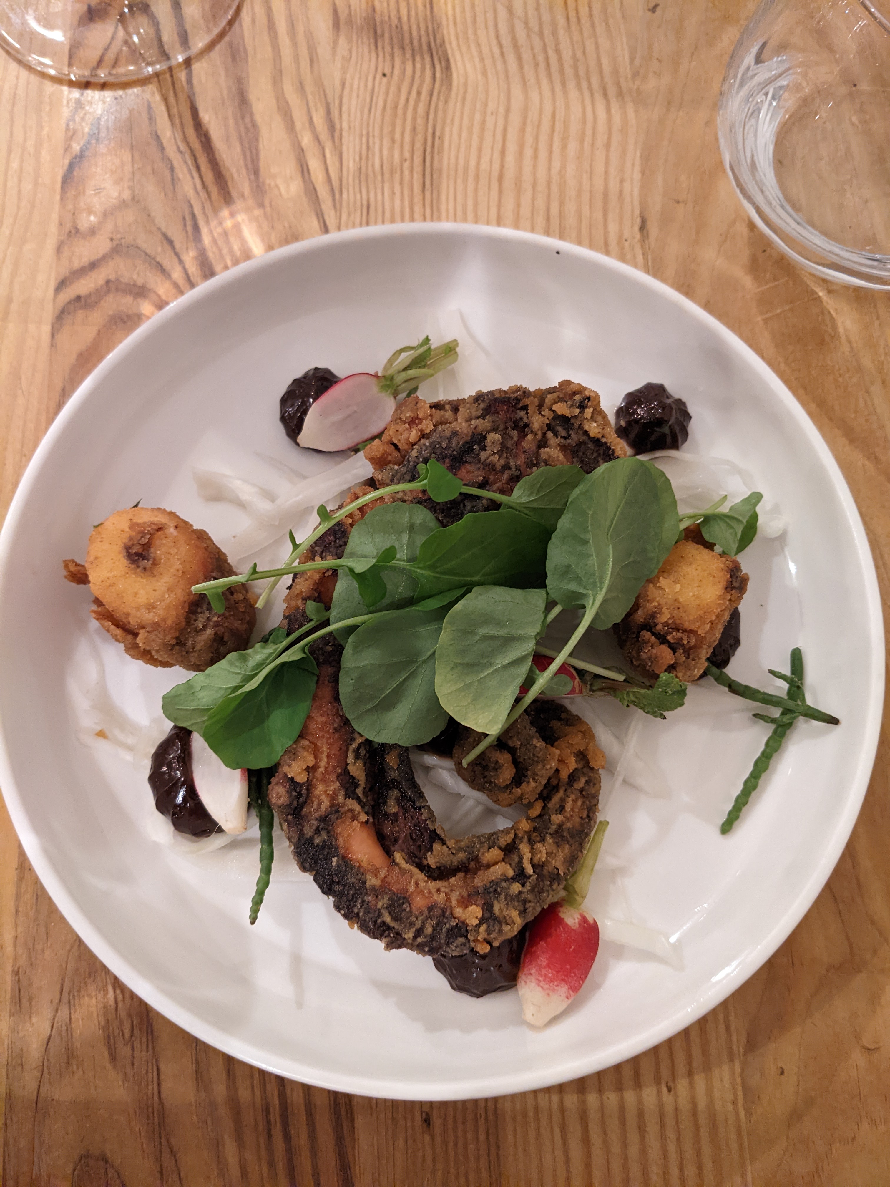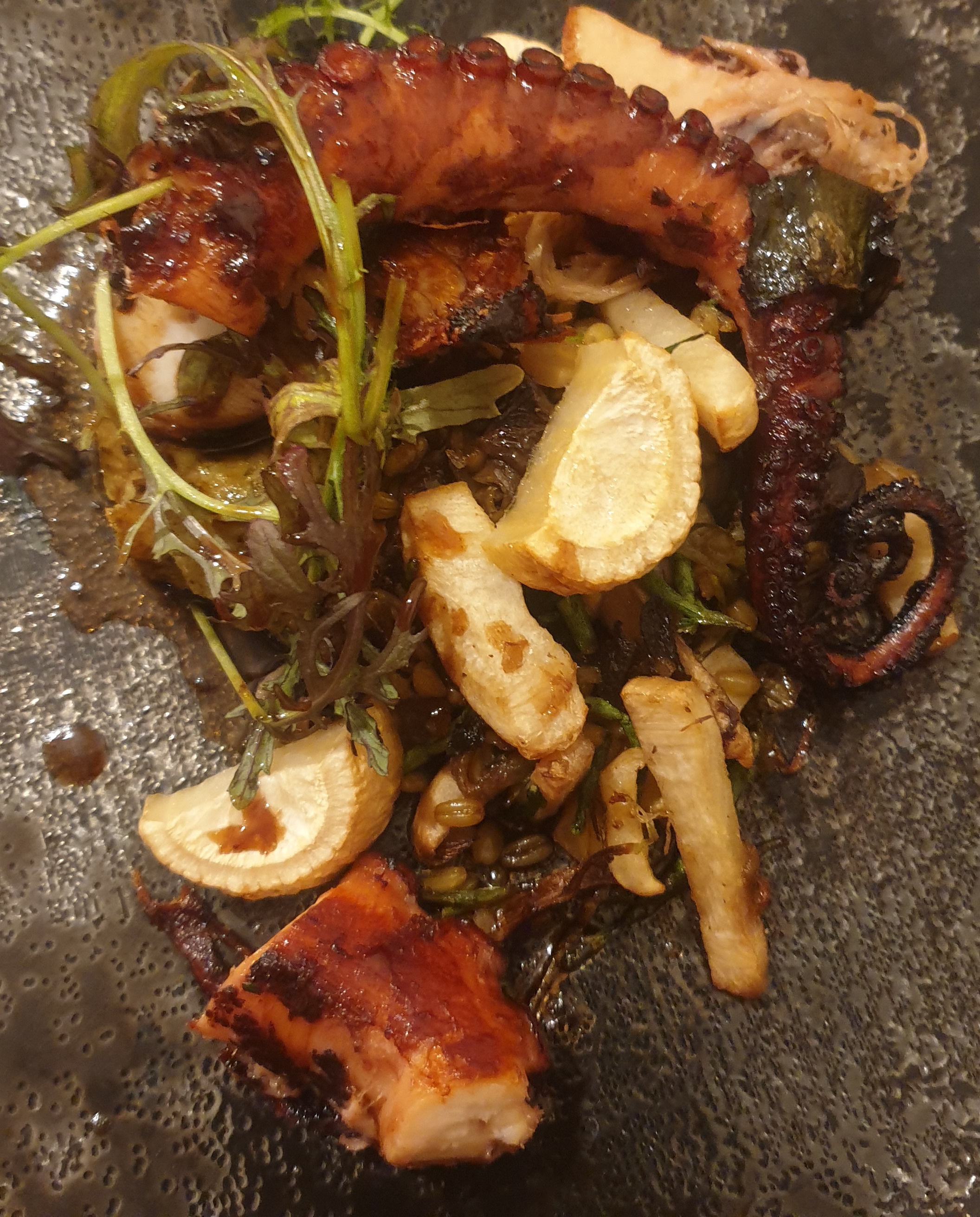 Nous avons dîner hier. A la carte. Autour du Poulpe. Le principe du restaurant. Une cuisson du poulpe remarquable avec pour lancer l apéritif le Poulpe crispy et une mayonnaise à l Ail noir. Des lamelles de bonite façon lard. Parfait. Suivi par du haddock et betterave dans une assiette complexe avec plein de petits secrets à découvrir. Le poulpe grillé ne demandait qu à se laisser fondre en bouche. Enfin une meringue presentée comme un nid refermant des cerises mi pochées mi confites avec une crème au thé Macha. Parfait. Arrosé d un Blanc naturel surprenant: le Brise Cailloux de Matthieu Barret. 2019. Allez y sans fermer les yeux.
