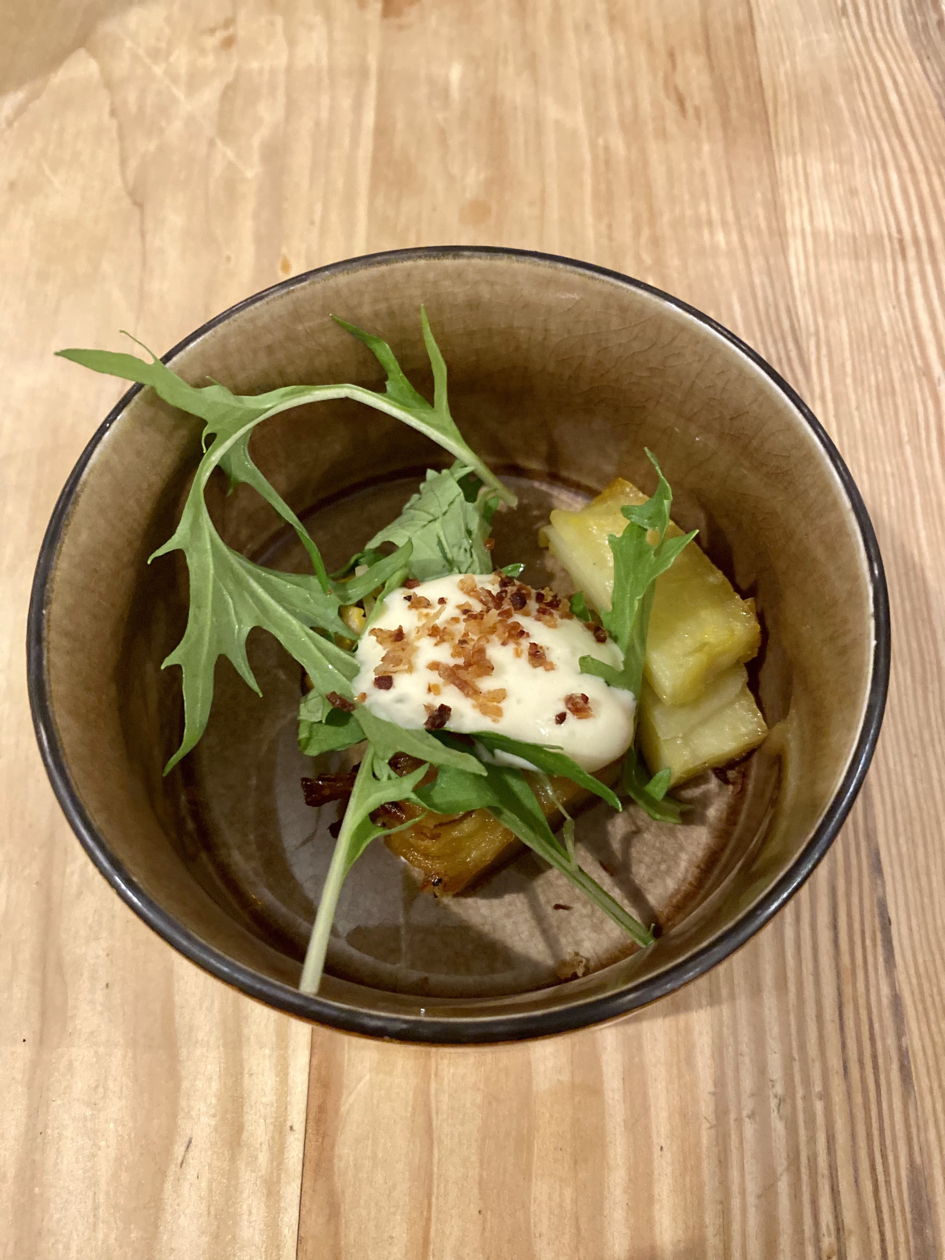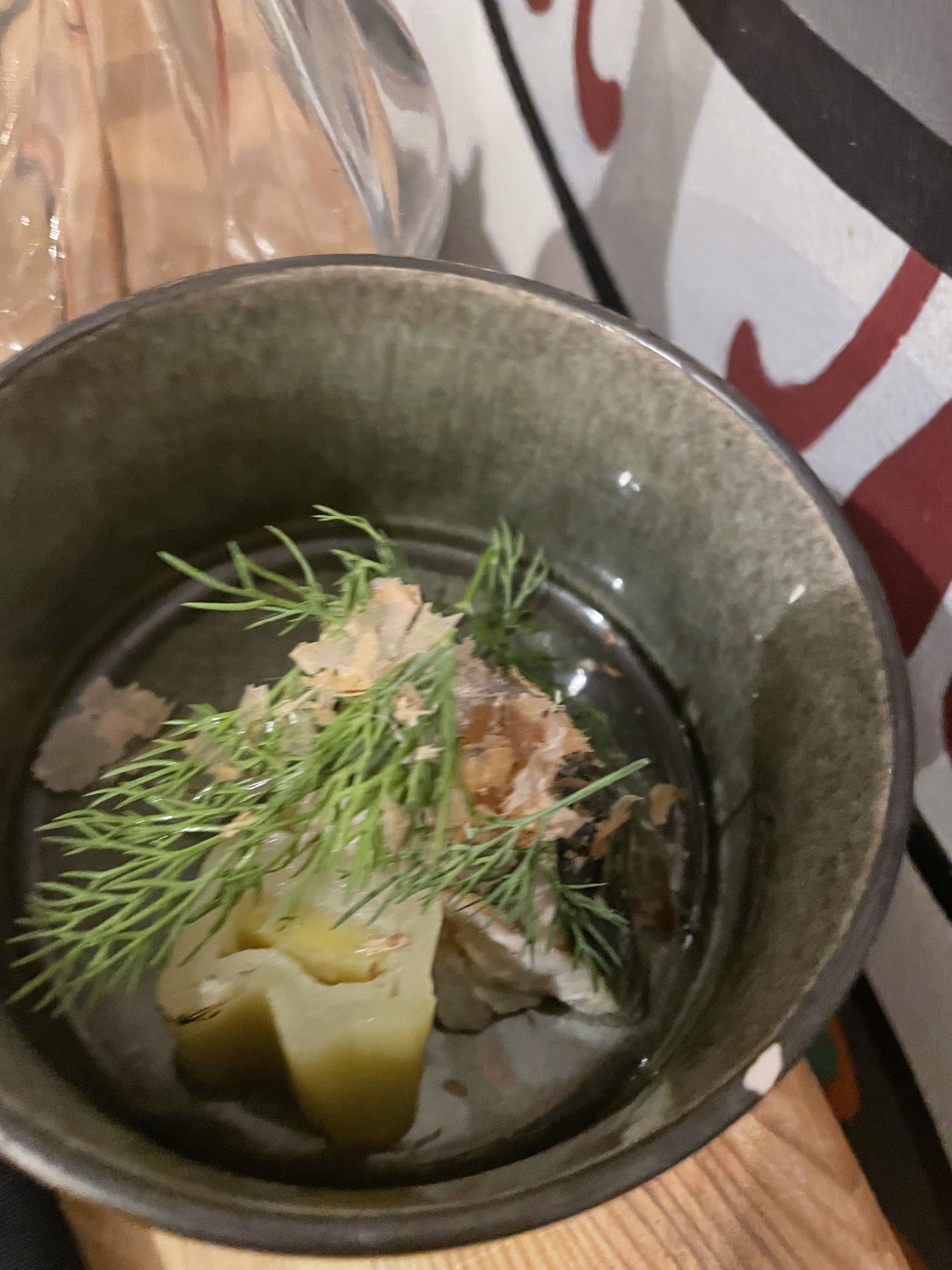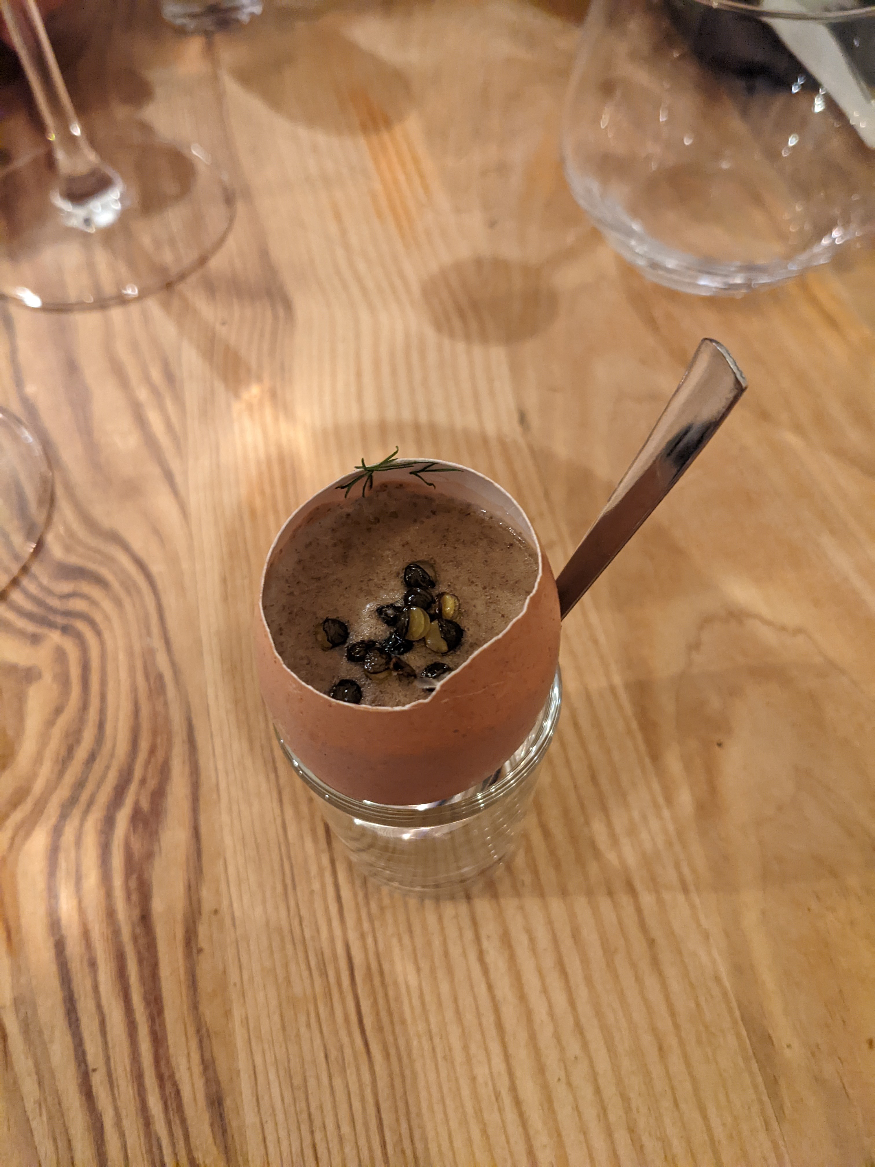 Nous avons dîner hier. A la carte. Autour du Poulpe. Le principe du restaurant. Une cuisson du poulpe remarquable avec pour lancer l apéritif le Poulpe crispy et une mayonnaise à l Ail noir. Des lamelles de bonite façon lard. Parfait. Suivi par du haddock et betterave dans une assiette complexe avec plein de petits secrets à découvrir. Le poulpe grillé ne demandait qu à se laisser fondre en bouche. Enfin une meringue presentée comme un nid refermant des cerises mi pochées mi confites avec une crème au thé Macha. Parfait. Arrosé d un Blanc naturel surprenant: le Brise Cailloux de Matthieu Barret. 2019. Allez y sans fermer les yeux.
