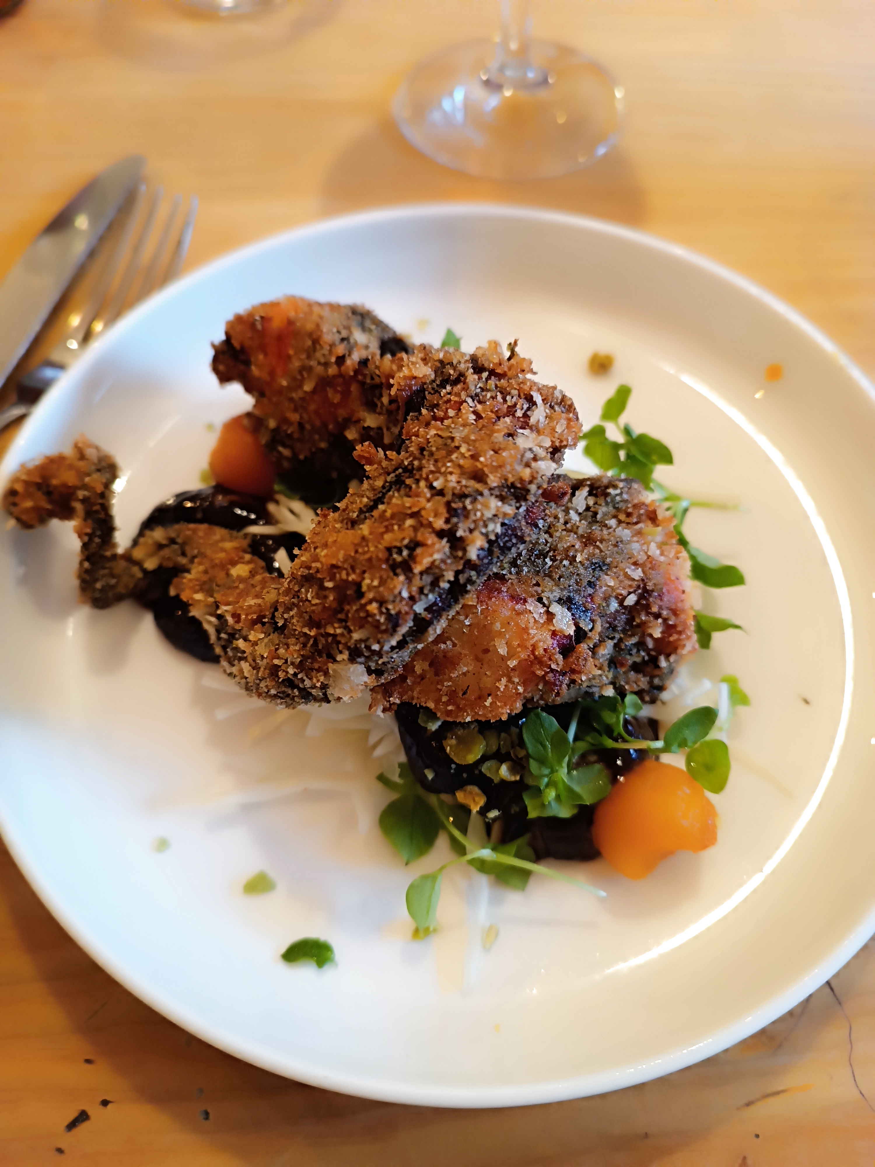 L’entrée de poulpe crispy super, le dessert excellent mais le plat de suprême de pintade était décevant. la viande était sèche et dure et les légumes difficiles à identifier.