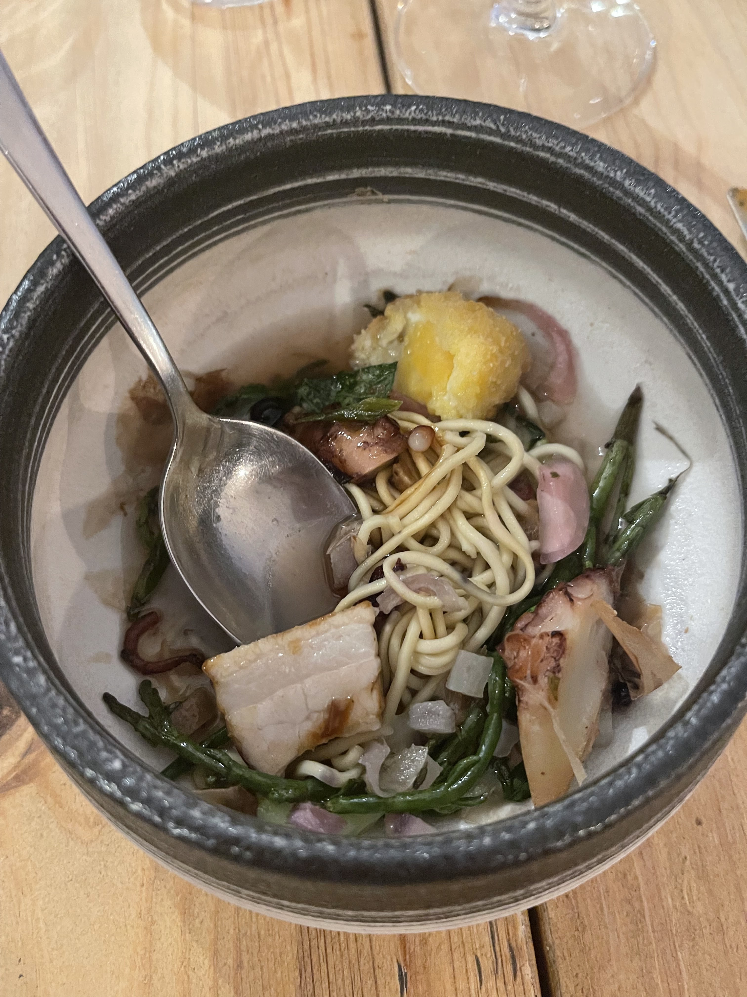 On est définitivement conquis. L’addition était plus importante qu’à l’accoutumée pour un menu dégustation autour du poulpe avec cinq envois. Nous avons prolongé le plaisir de la table avec les boissons de l’apéritif au café sans regret aucun. La patronne est toujours de bon conseil pour trouver le vin adapté à chaque situation. Un instant savoureux à partager en couple, entre amis ou en famille. Mon coup de coeur va cette fois au ramen de poulpe particulièrement tendre et raffiné.