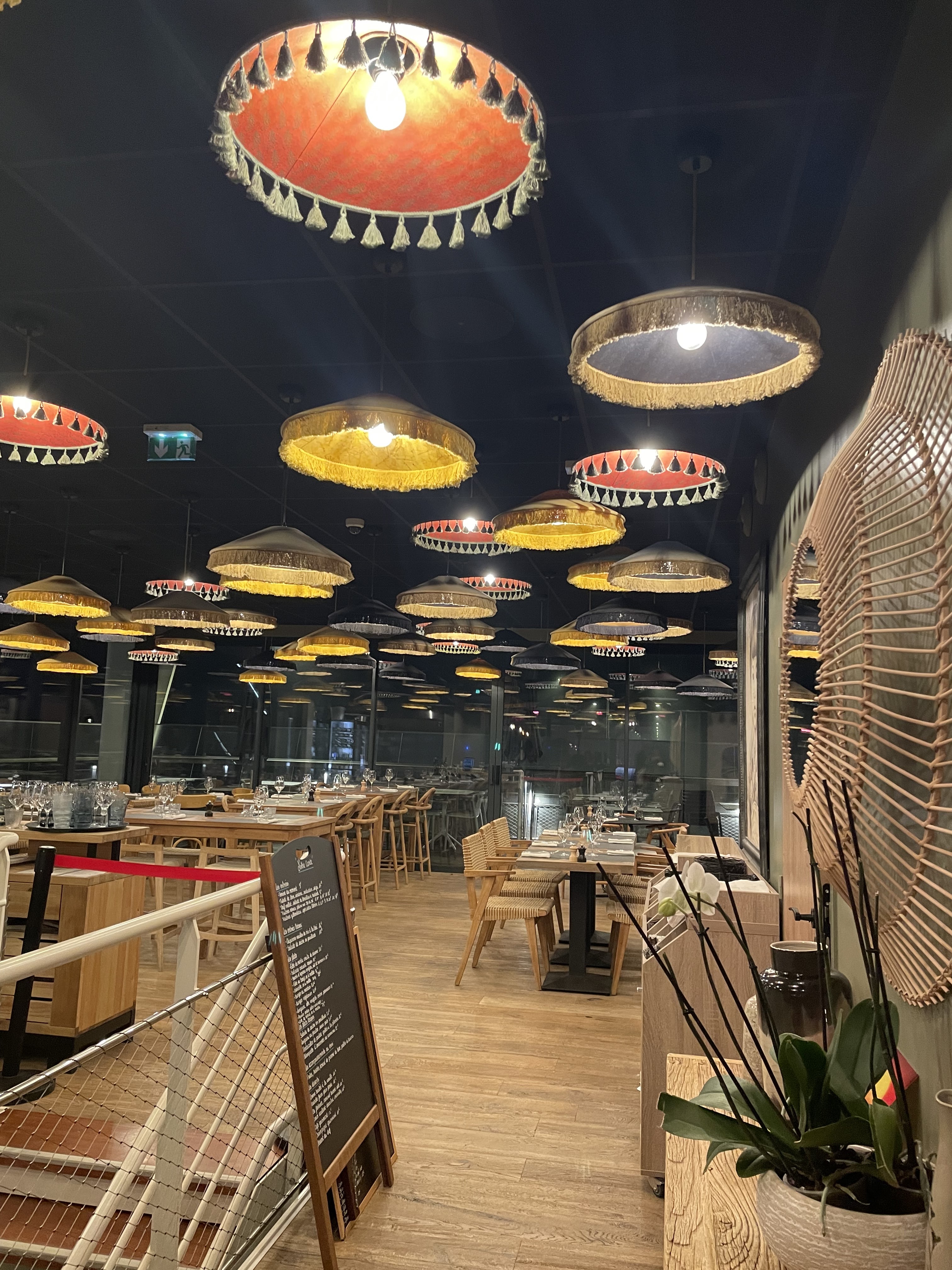 La cuisine est correcte, les tables sont un peu serrées. Les vins sont abordables. J'ai apprécié le plafond en plantes synthétiques qui sont un plus pour l'ambiance et peut-être pour l'atténuation des bruits.