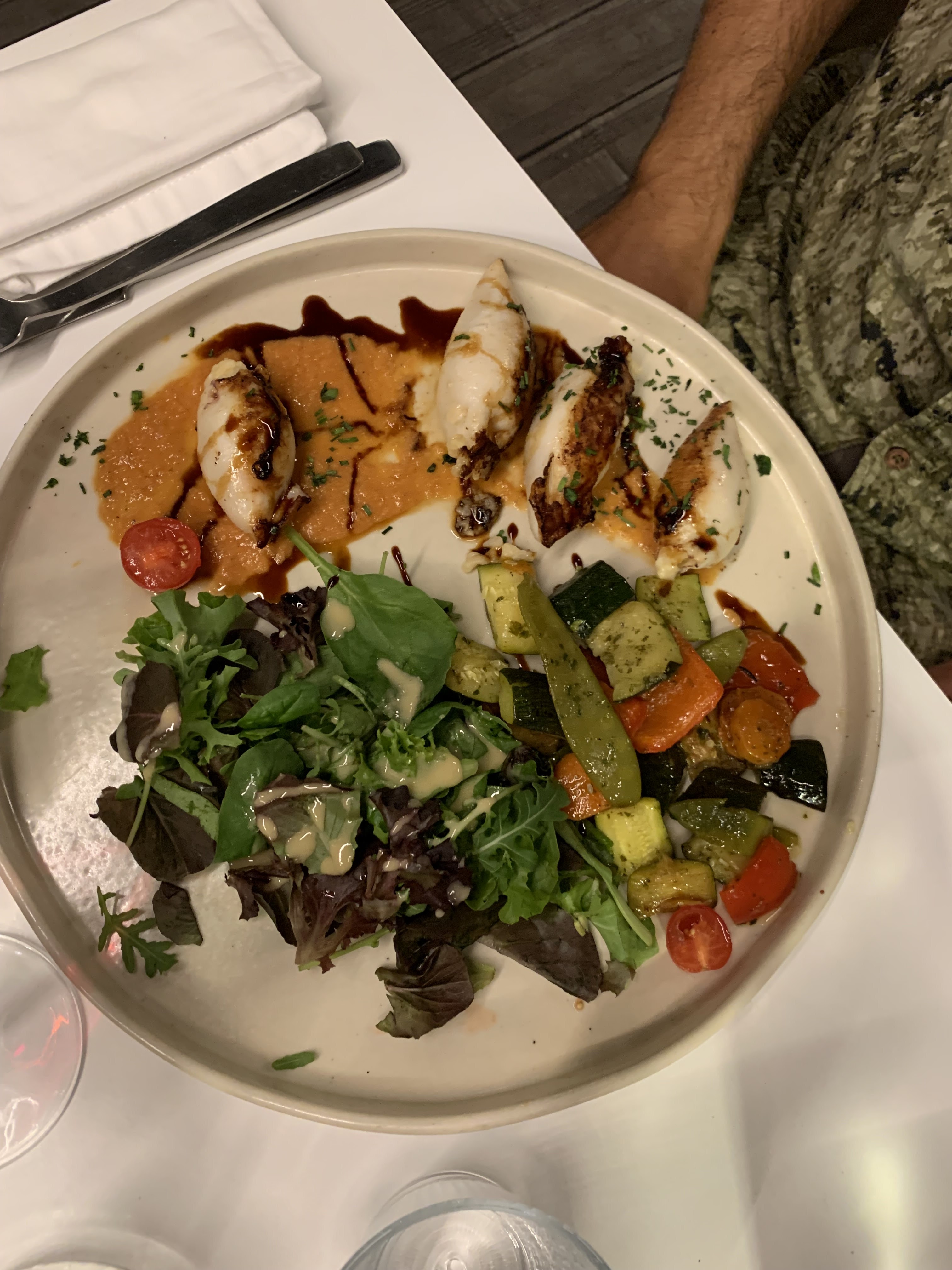 Cadre très plaisant. Service stressé (par la gérante hyper pressante sur ses employés). Les plats nous ont été apportés alors que nous étions encore aux cocktails. Cuisine pas mal : poisson très bien cuit mais très huilé, ratatouille ratée car pas assez mijotée … c’est quand même compliqué de rater une ratatouille. Sommelier de bon conseils.