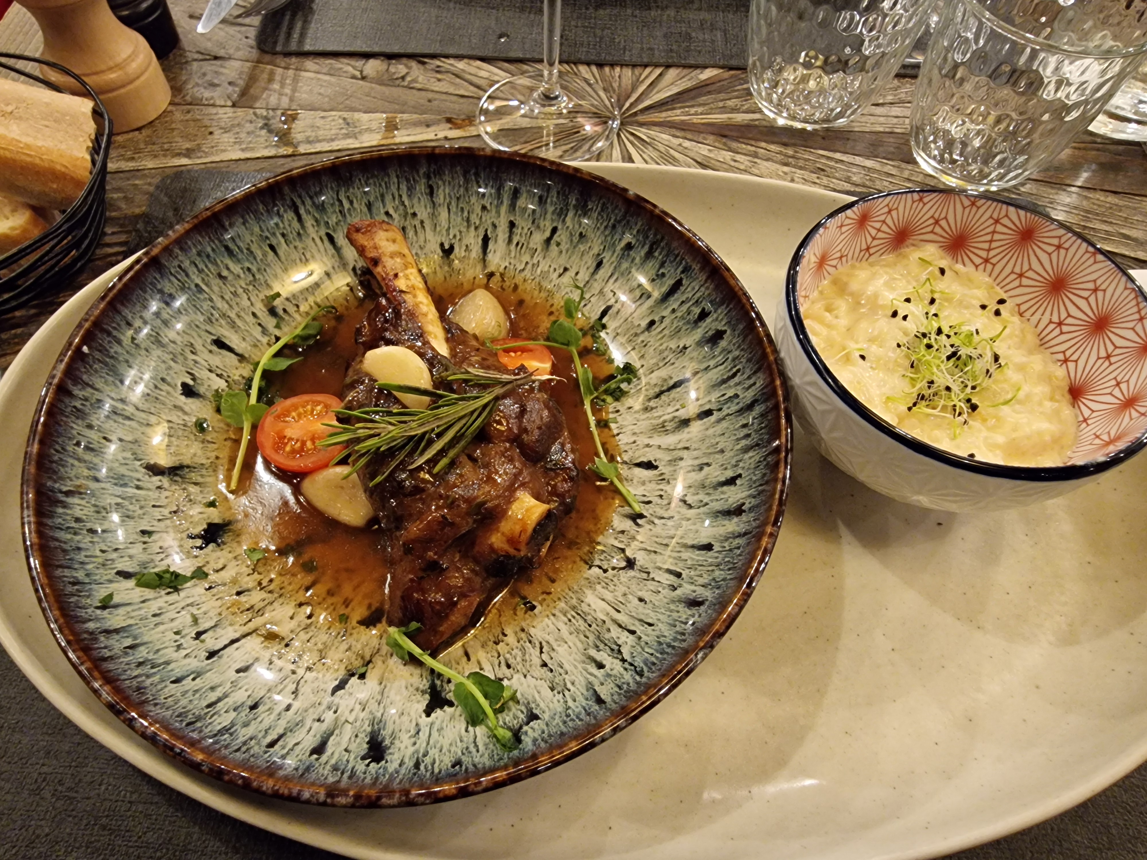 Le cadre est vraiment agréable. Sinon, le spritz s’est noyé dans l’eau. L’’entrecôte commandée bleue arrive cuite à point. Elle est aussi épaisse qu’une tranche de jambon, heureusement l’os à moelle en supplément (+4€) est bon. Pas possible de changer l’accompagnement d’un plat (« c’est pas moi qui fait les règles » nous répond la serveuse !). Pour finir brioches façon pain perdue au caramel fleur de sel à 12€ (on cherche encore le caramel) tellement honteuse que l’on nous les offre pour nous faire avaler tout cela. Vraiment dommage ! On aura essayé