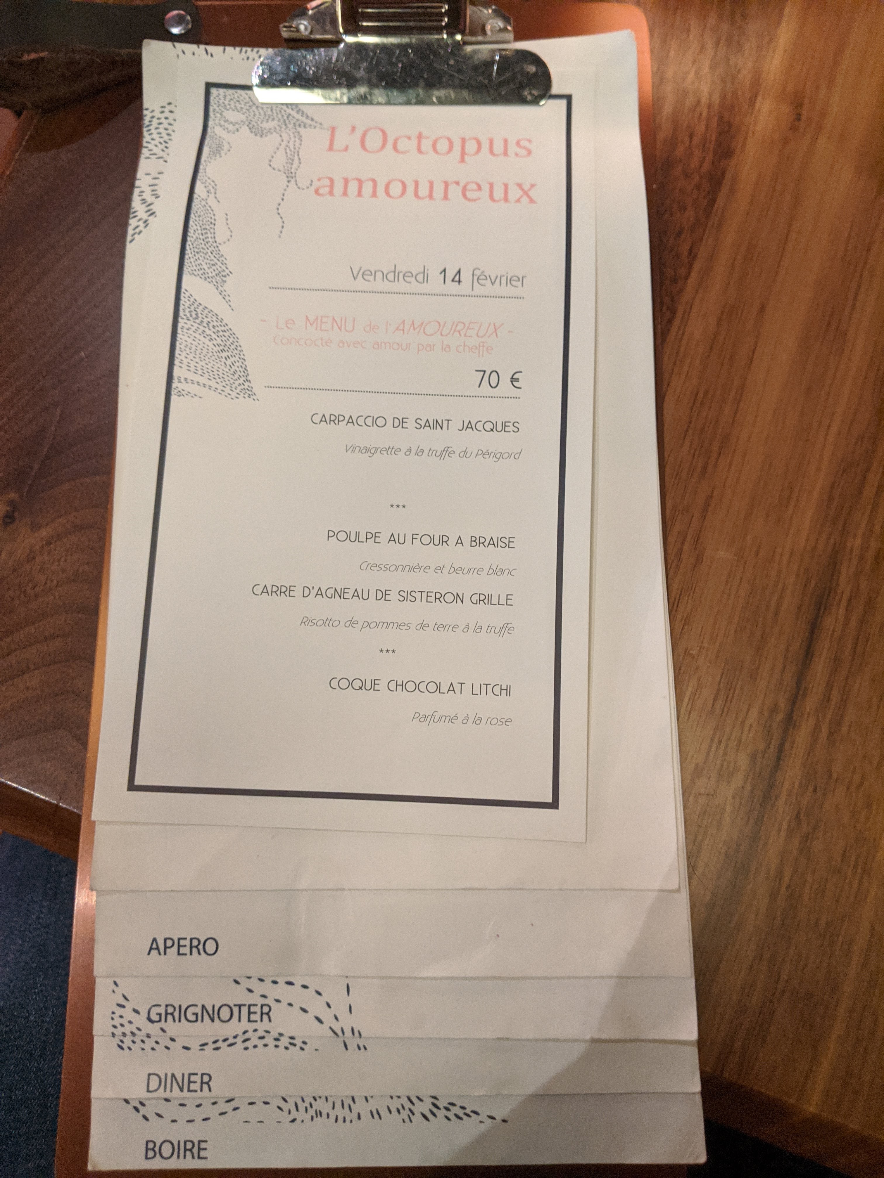 Bonjour Avant tous je voulais remercier toute l'équipe de l 'octopus pour leur réactivité nous étions 9 personnes sans réservation dans un restaurant qui était bien remplit a notre arriver de la prise de commande a l'arrivée des entrées des plats au desserts un vrai voyage de saveur ou le poulpe est servie sous différentes façons