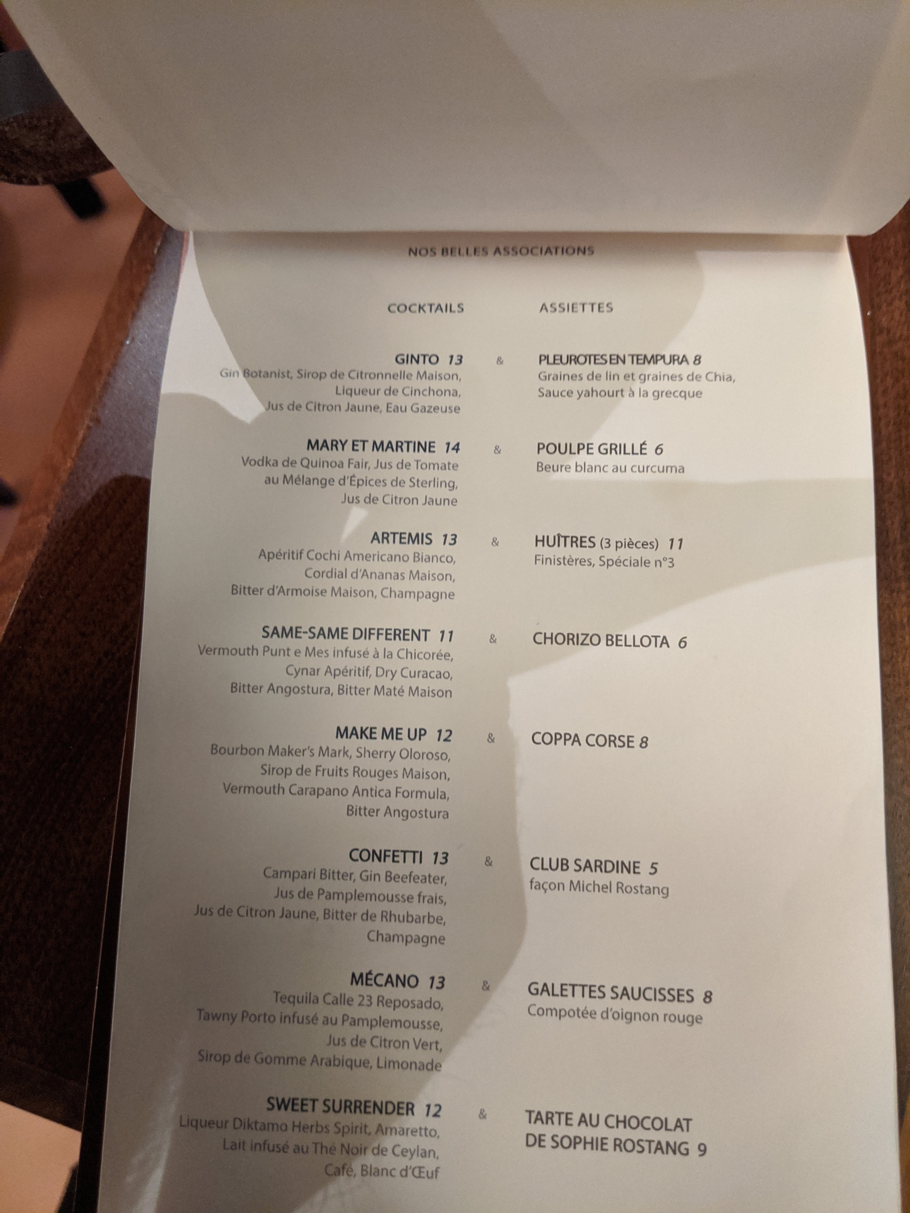 La cuisine est correcte mais les prix sont élevés, ça donne pas envie de venir à Paris et consommer en restaurant. Service laborieux, des oublis, les salariés ont l'air perdu Les cocktail : un cosmo a 14 euros dans un petit verre à vin, il était transparent, plus d'eau qu'autre chose. Très déçue. Et vouloir faire payer 3 euros une demande de carafe d'eau alors que nous consommons c'est quelque peu abusif, notamment avec la dernière loi en vigueur.... Donc je ne reviendrais pas.