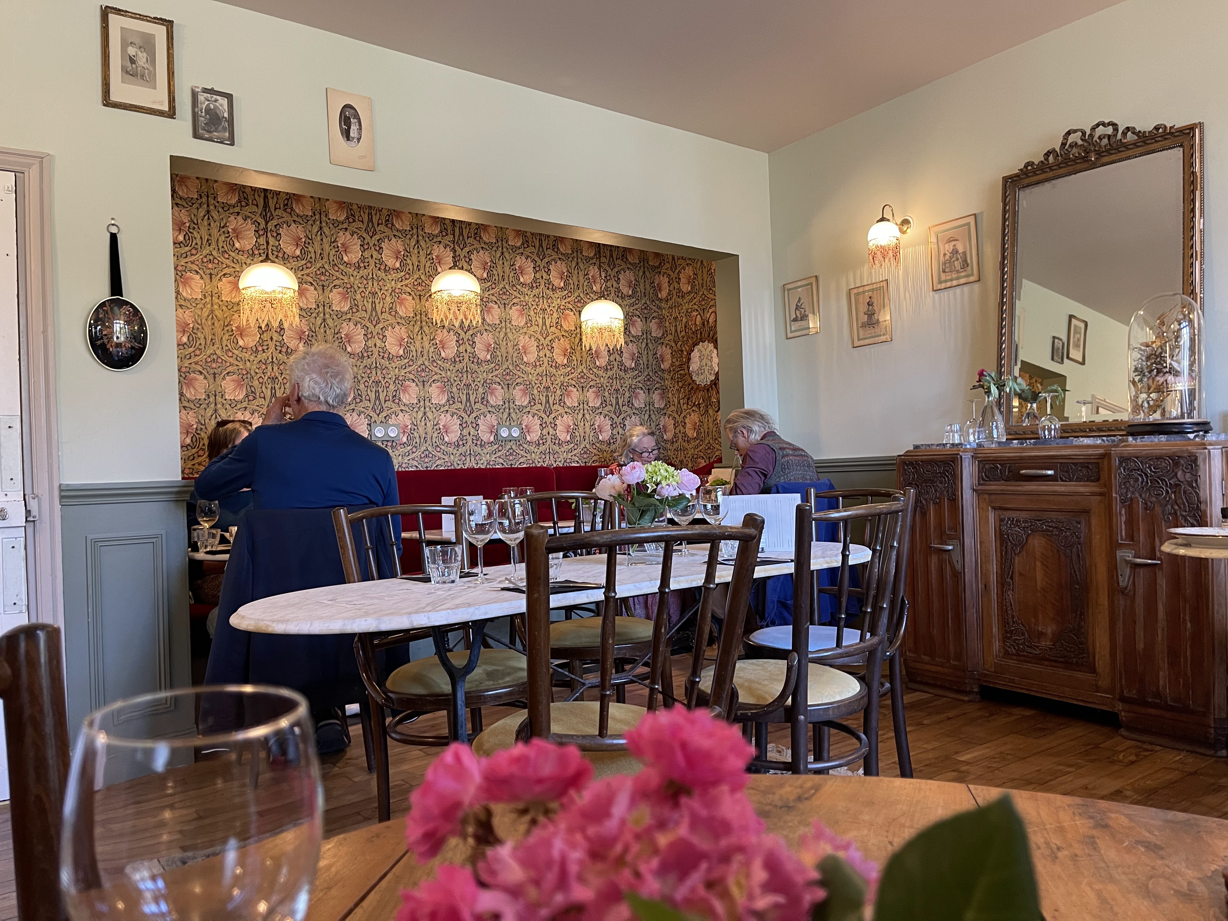 Cadre rétro comme j'aime, personnel souriant, efficace et attentionné. Nous avons pris le menu : un peu déçus, la salade contient Beaucoup de salade verte, desserts très bons, vins un peu chers au verre. Je reviendrai pour un brunch qui m'a fait envie. Attention, sur le site il est indiqué que c'est fermé le mercredi, or, nous y sommes allés un mercredi. Et le répondeur doit être mis à jour car indiqué que le restaurant est fermé et que l'équipe reviendra fin juin.. Nous sommes en août. A bientôt pour in the / gâteau ou brunch 😁