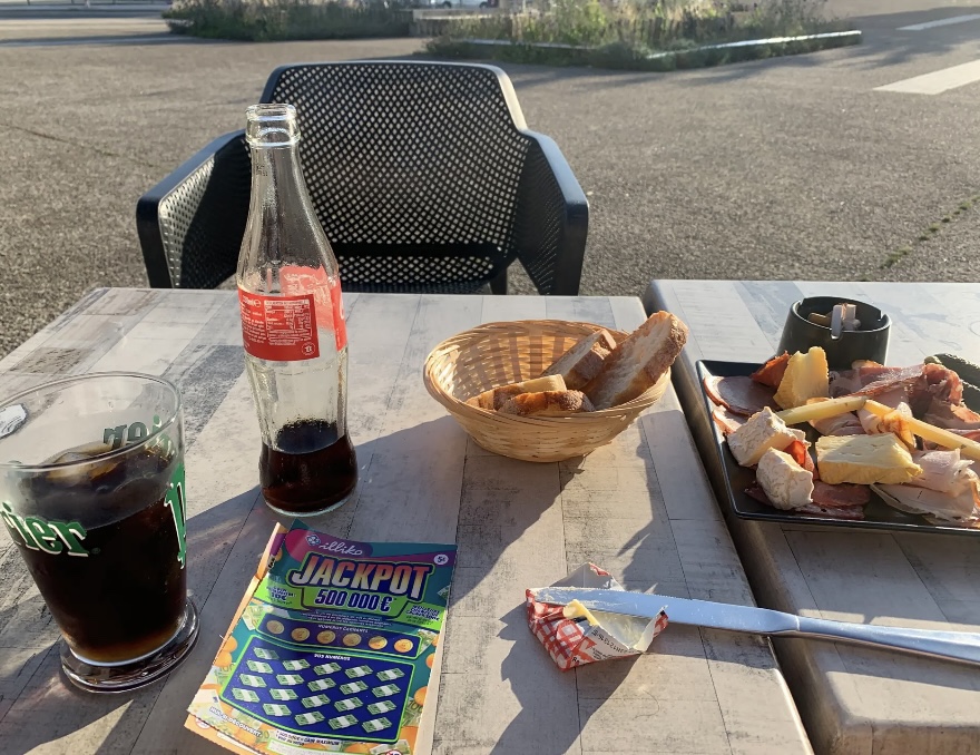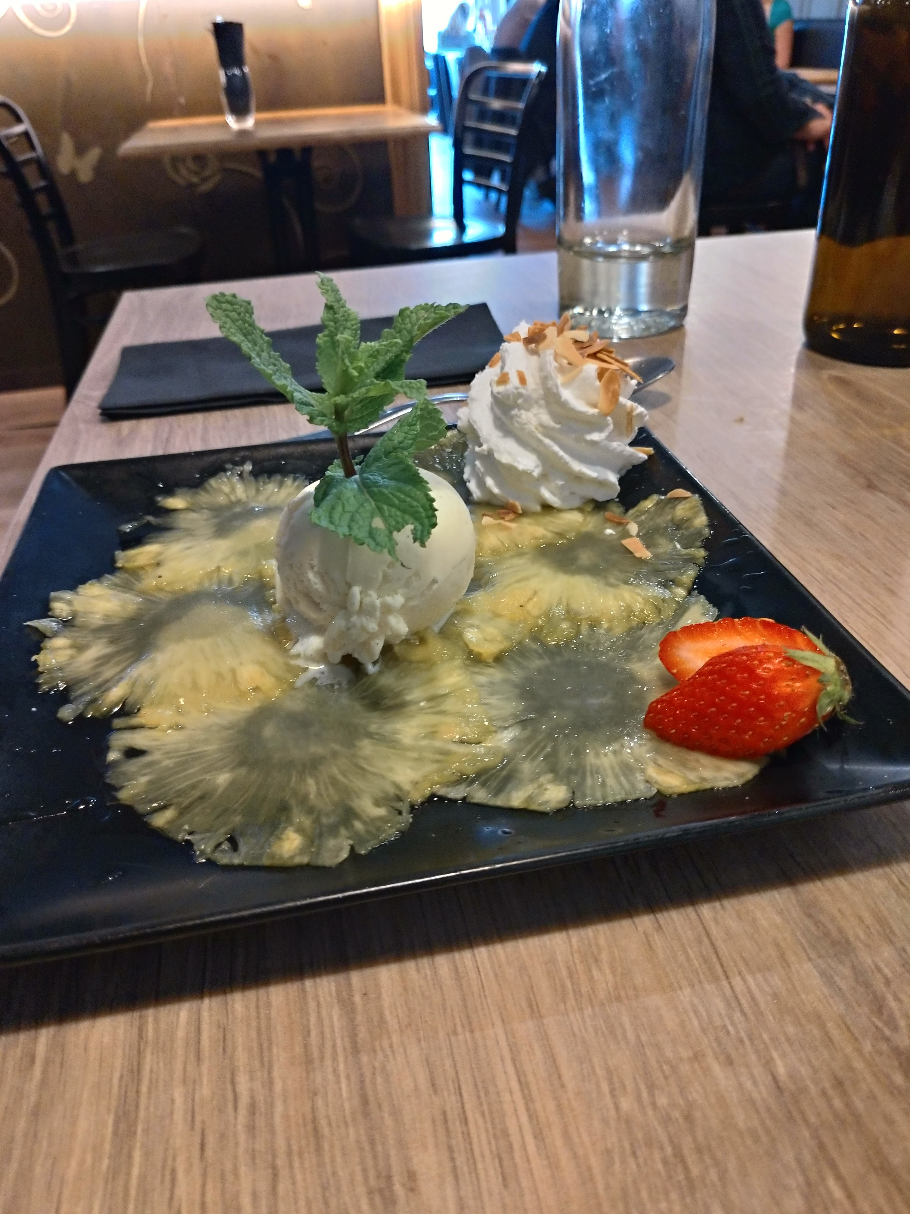 Un peu de déçu de l’expérience. Nous sommes deux et l’apéro met bien 20 minutes pour arriver. Avec une des deux boissons qui n’est pas celle commandée. J’ai pris des moules. Elles ne sont pas très chaudes et beaucoup sont encore fermées. Au fond de la casserole, pas un seul légume attendu dans une moule marinière : ni oignon, céleri ou carotte. Mon épouse a une salade vege qui pourrait passer pour une salade de fruits : melon et pastèque non épluchés qui rende la préparation difficile dans l’assiette. C’était pas mauvais, mais tout est perfectible.