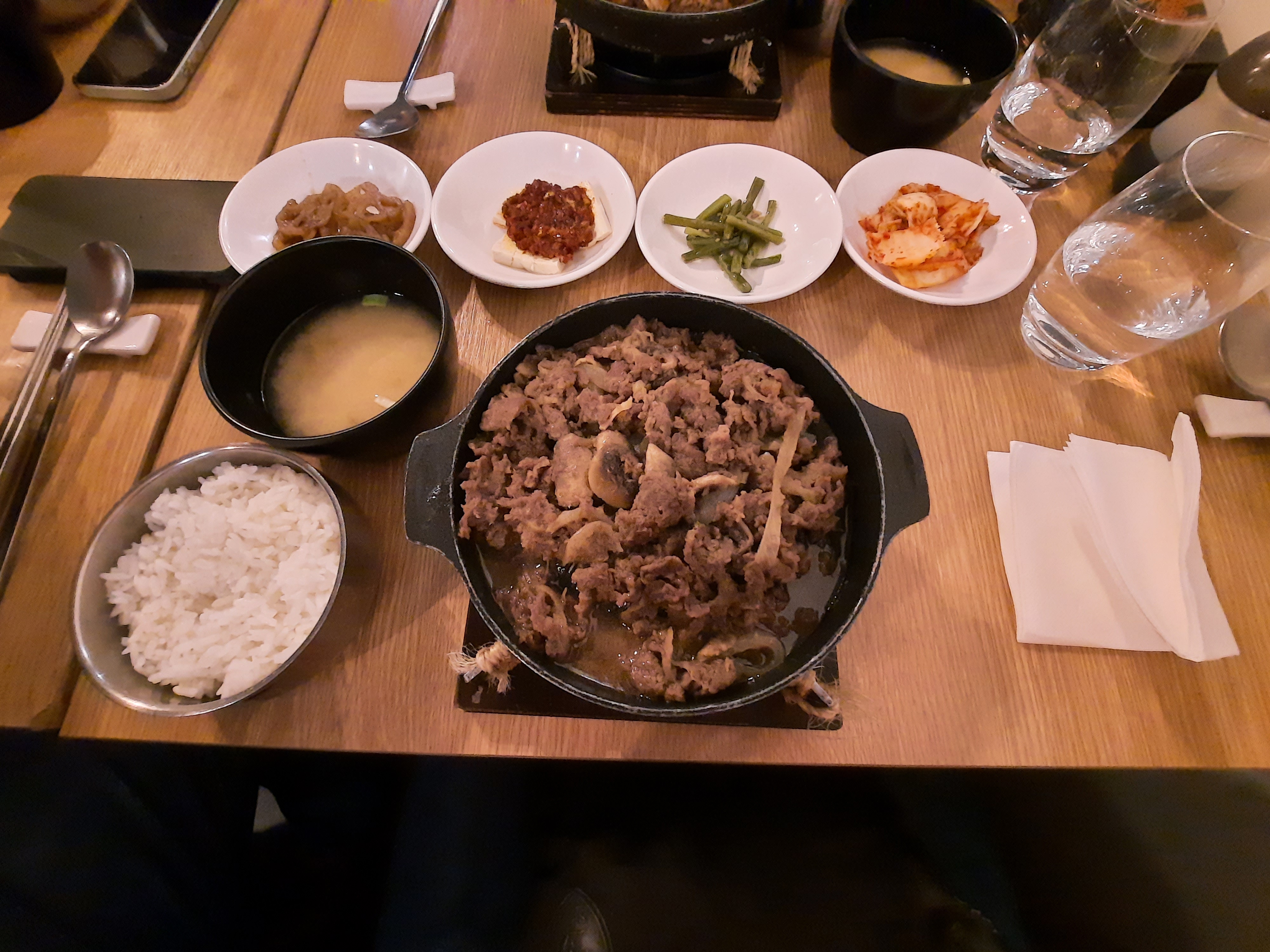Les plats étaient bon, mais trop salé lors de notre passage, que ce soit le plat principal, la soupe miso ou le japchae. Les prix sont un peu élevés également.