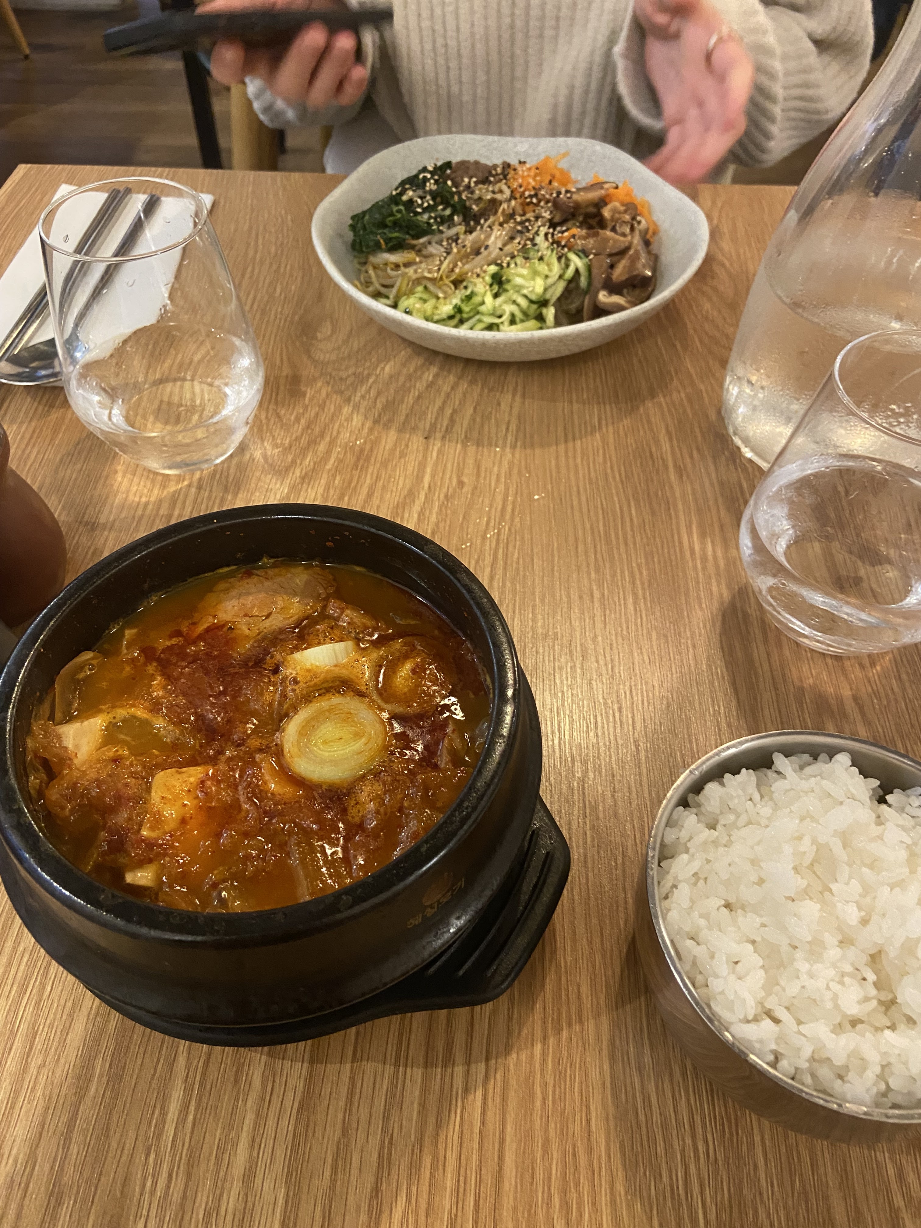 Nous étions chez vous le 20 août 2019. La serveuse ne nous paraissait pas partulierem t indisposée et discutait avec un copain au lieu de s'intéresser aux clients. Je persiste : le kimshi est lepain coréen. J'ai vécu plusieurs années à Séoul, je sais !!! Quand à la knack, saucisse bien française qui n'a rien a faire dans un plat coréen.