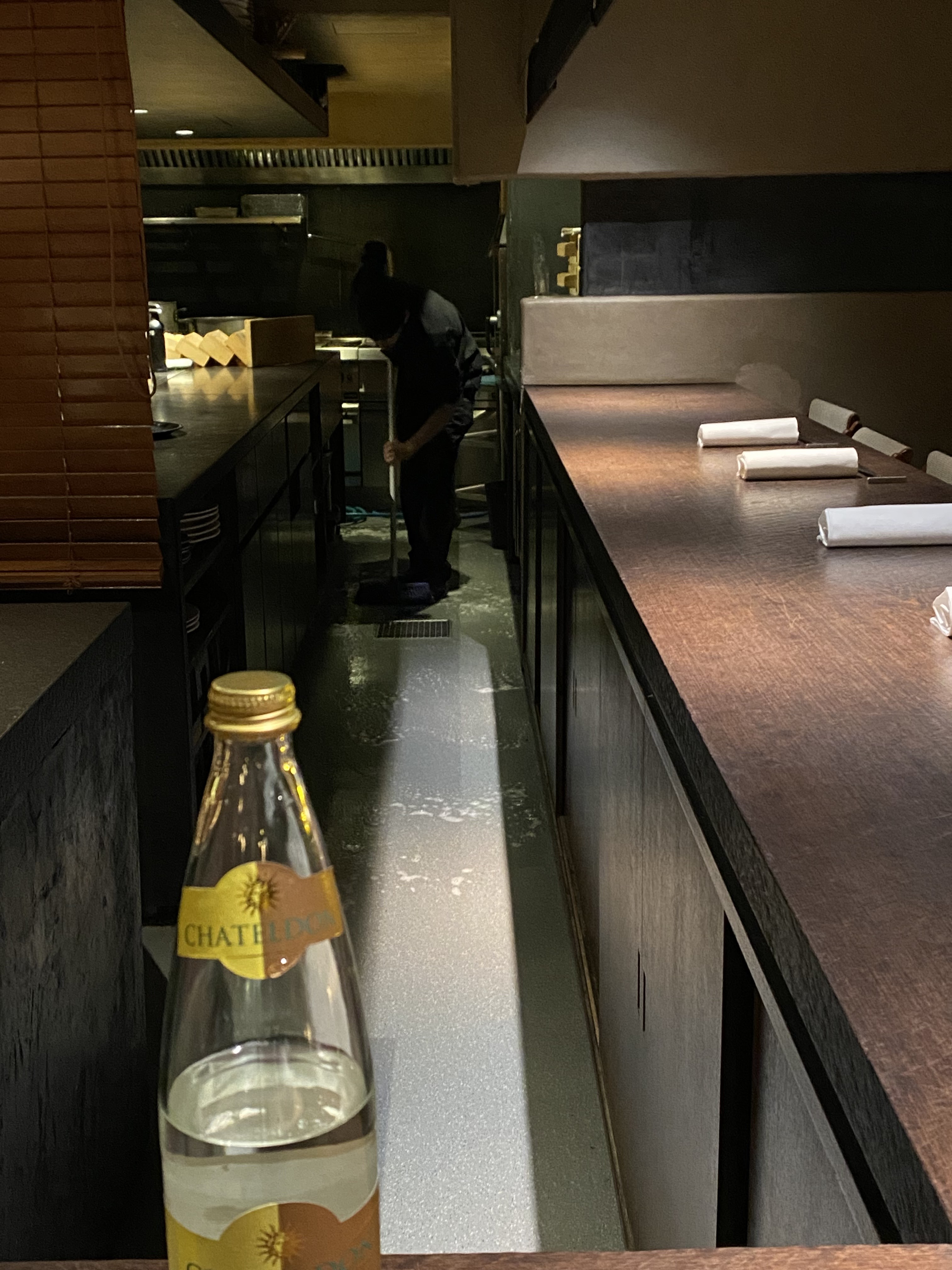 Mais quelle déception … mon conjoint avait réservé des places au comptoir car nous apprécions beaucoup ce côté là dans les restaurants japonais. Erreur! Toute la soirée l’agitation en cuisine était à son maximum, le personnel défile non stop devant vous, fait du bruit, puis vers 21h30 décide de nettoyer la cuisine alors que les clients ne sont pas partis: le plan de travail devant nous est savonné (cf photo), les poubelles vidées, la vaisselle empilée bruyamment. En terme de plat, tout est absolument fade et rien n’est marquant, le visuel n’est clairement pas là non plus. Le vin et le champagne sont servis à l’arrache, plein de gouttes sur le comptoir. La vaisselle est mal choisie, comment voulez-vous manger une dorade avec une cuillère en plastique et une boule de glace sur une assiette plus petite que la boule 🙄. Bref je me suis demandée comment Michelin avait pu accorder une étoile, à part pour le lieu qui est en effet magnifique.