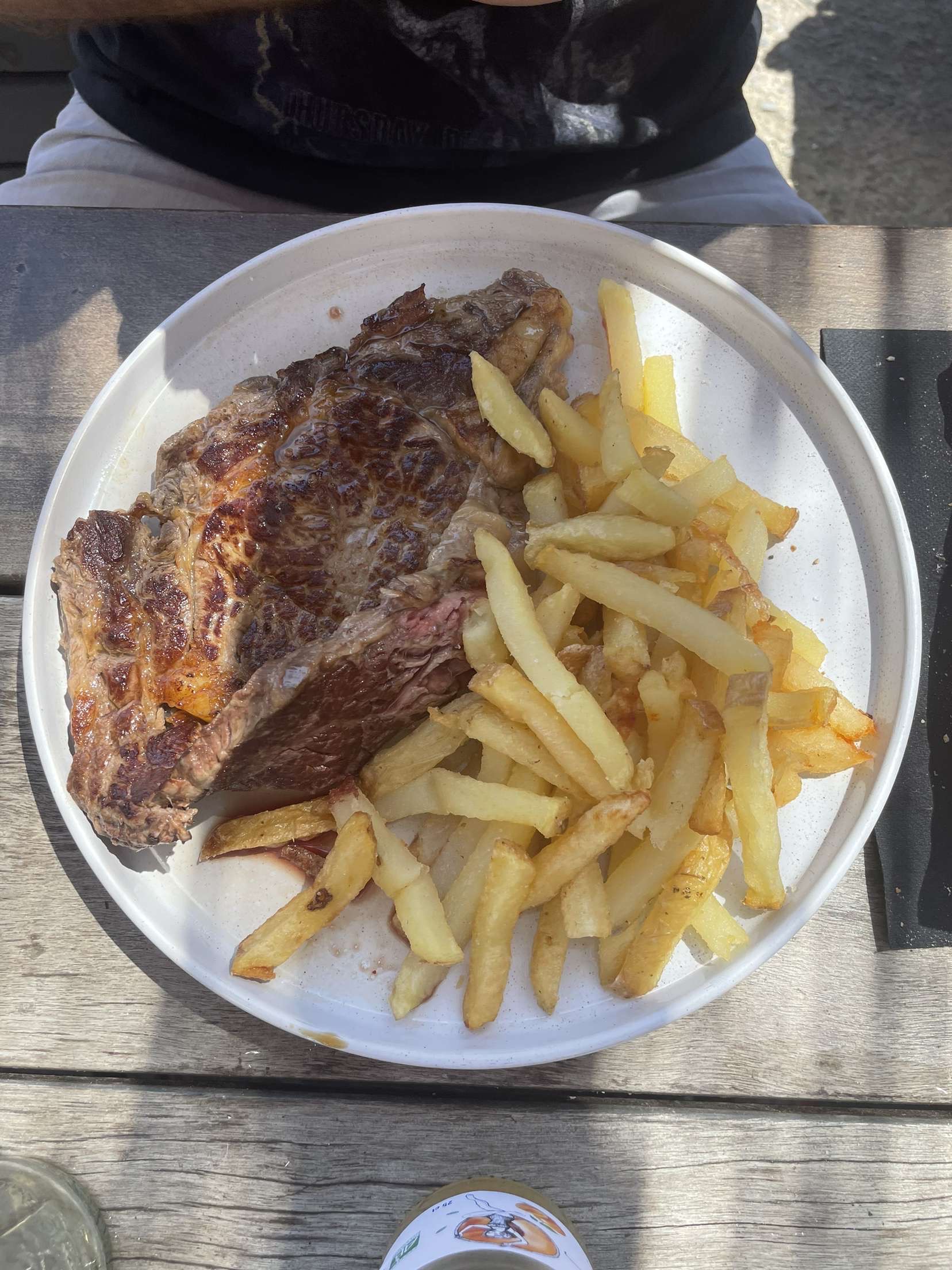 frites délicieuses par contre l'entrecôte que j'ai choisie saignante et qui arrive à point-bien cuit, pas top... UPDATE: j'ai demandé à avoir un autre plat 3x mais le serveur avait l'air totalement perdu donc j'ai fini par accepter.. D'ailleurs l'arrivée des desserts à 15min d'intervalle, pas top non plus