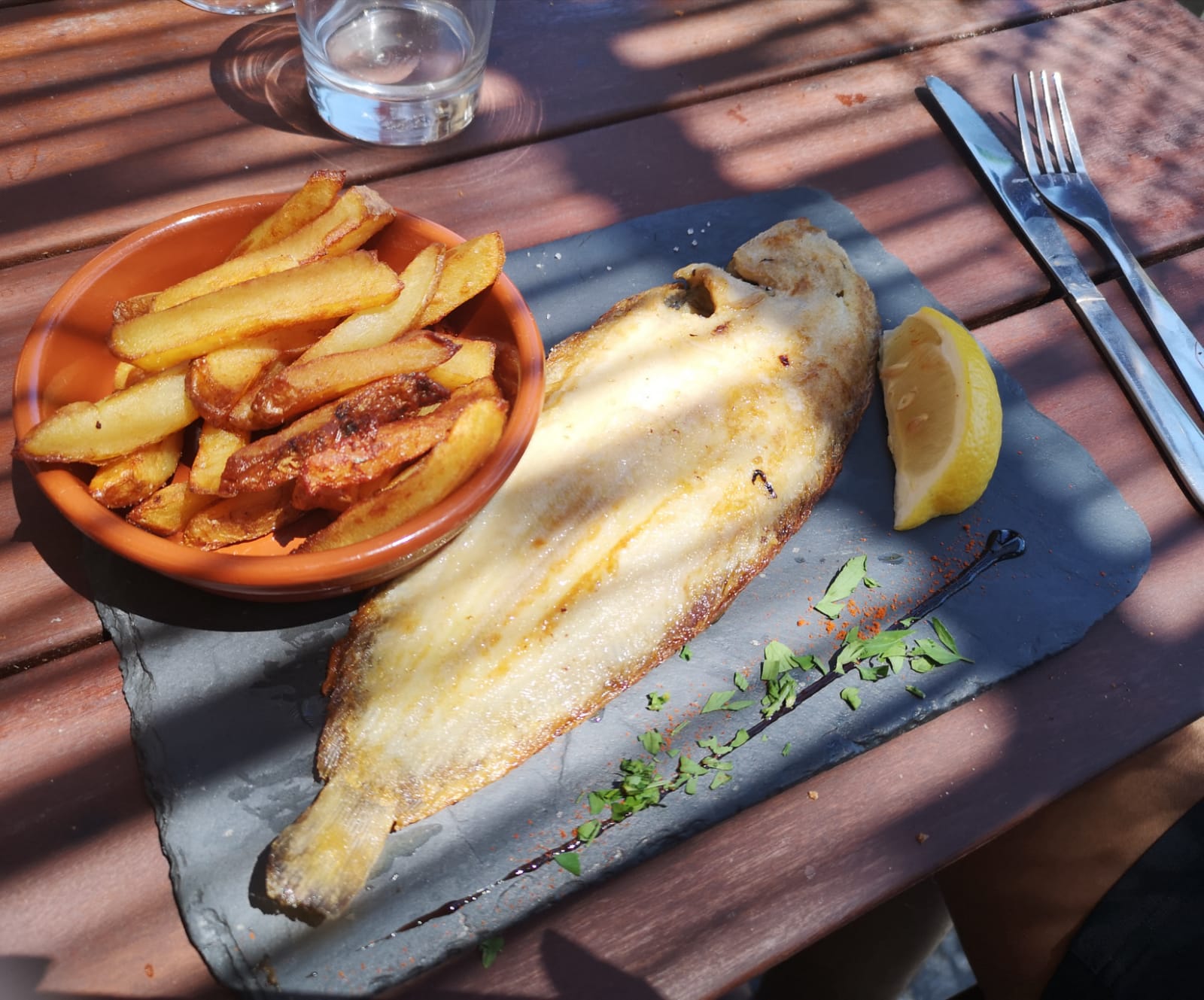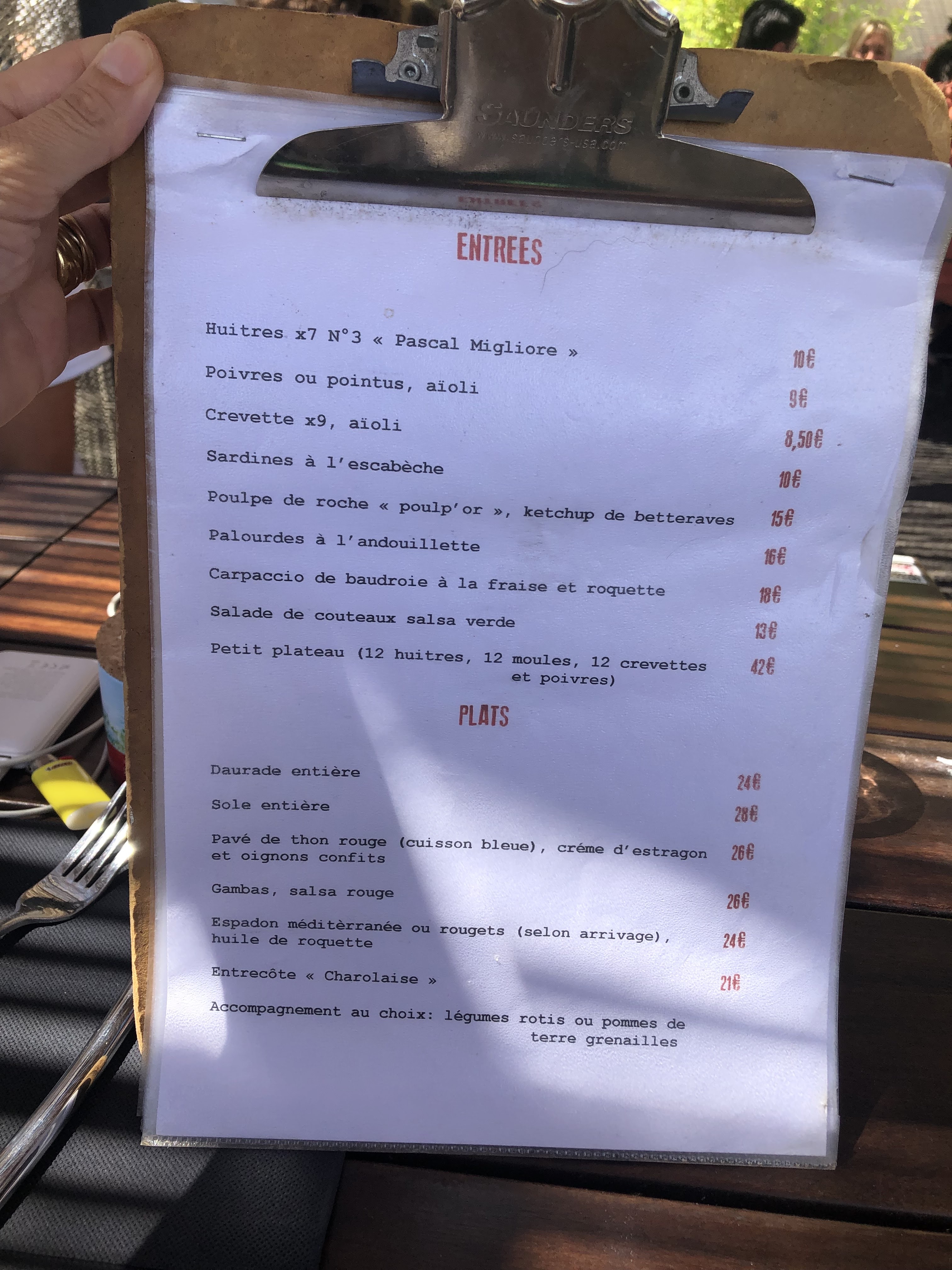 Petite carte mais efficace ! Poisson bien sûr mais aussi frites maison excellentes et vin blanc (sauvignon pour moi) très frais… et parfait !! Je recommande 😊