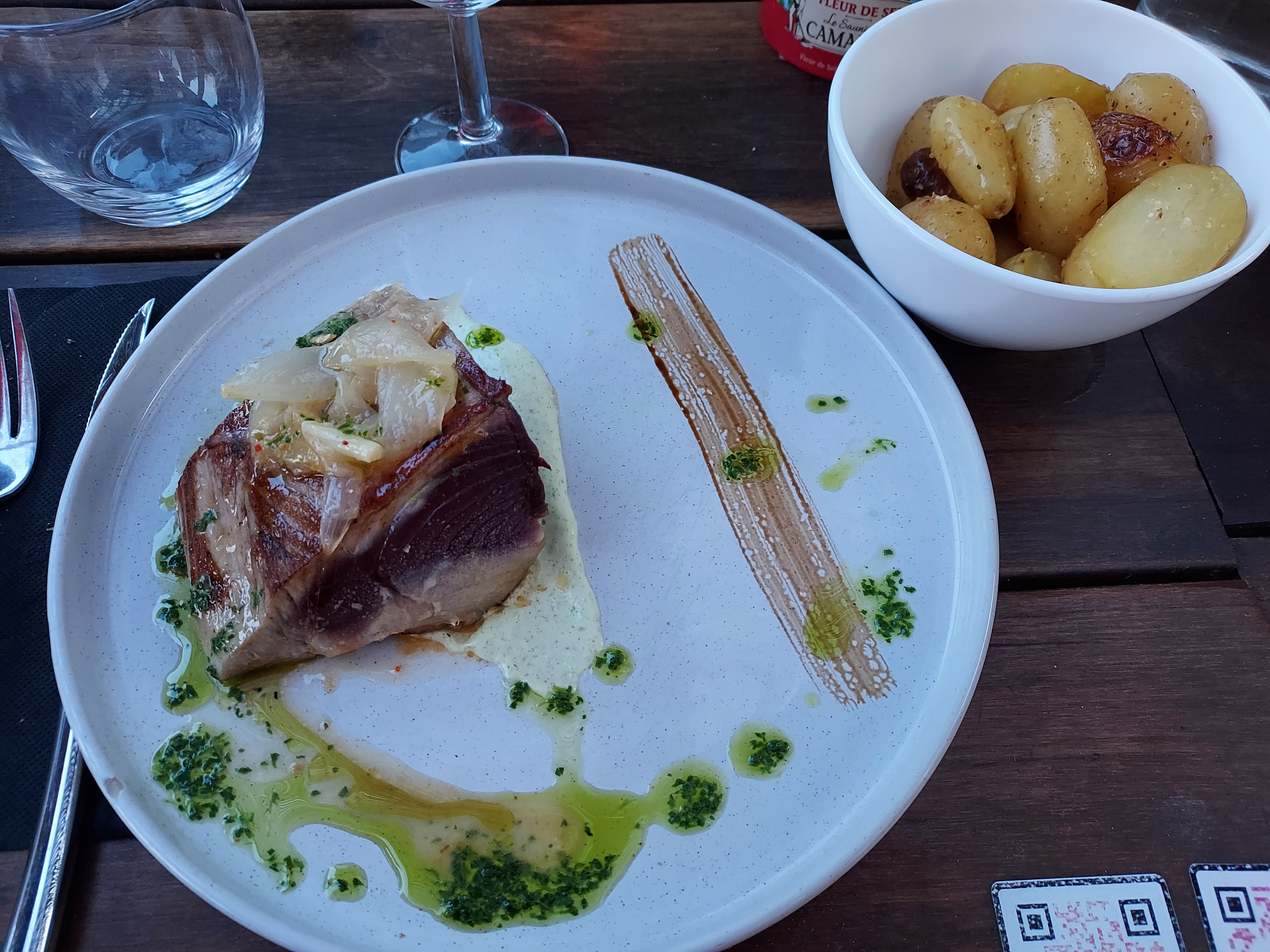 Décevant!!! Personnel quelque peu dépassé mais accueillant. Terrasse sur le quai quelconque. Plat de thon rouge (28 euros). Parties filandreuses ou nerveuses non mangeables. Assiette végétarienne correcte.