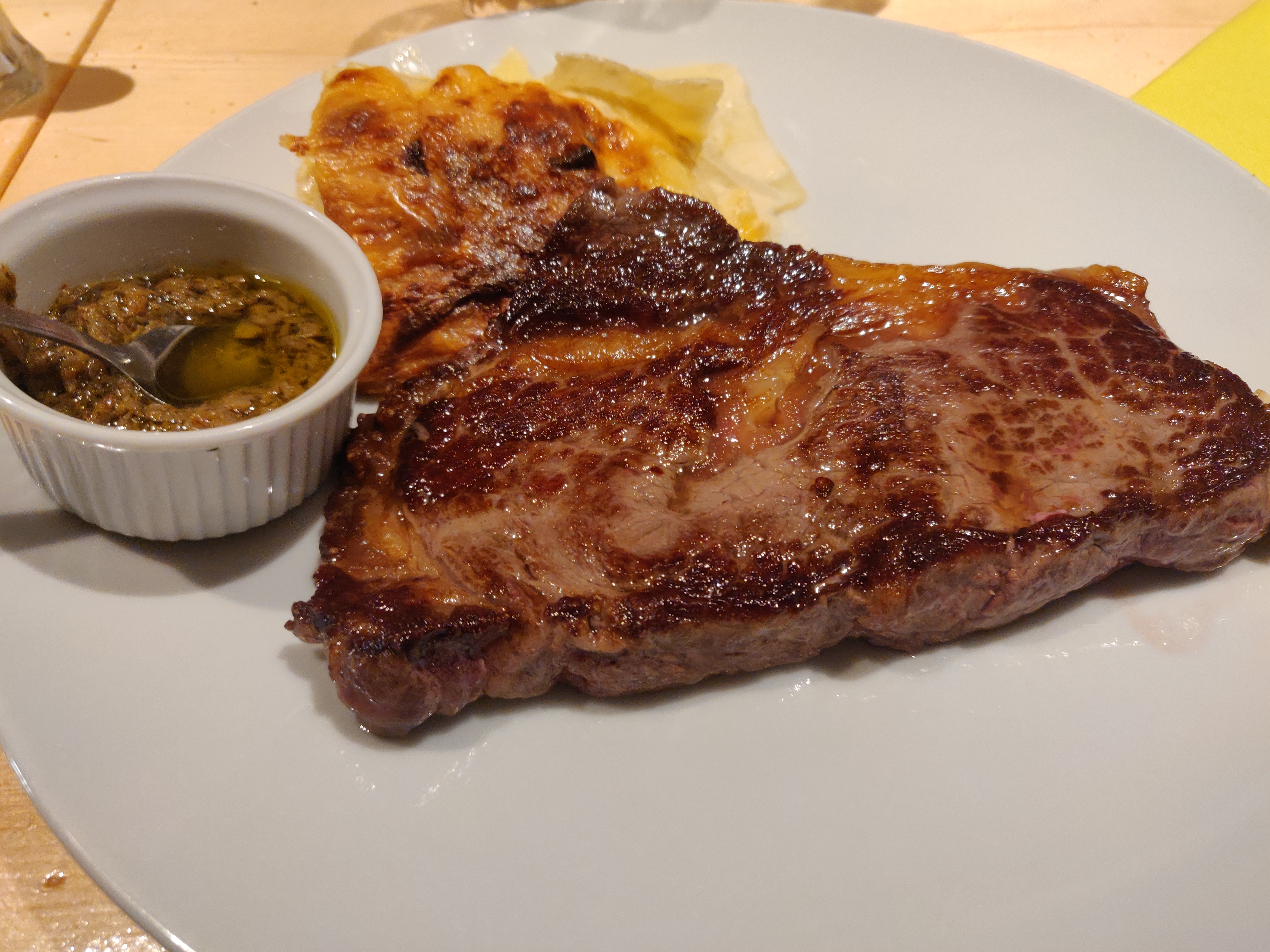 Excellent. La viande est de bonne qualité et la cuisson respectée. Le gratin dauphinois est vraiment fondant et à du goût. La sauce au poivre est bonne mais aurait pu être un peu plus forte, ce la dépend des goûts. Dommage que sur la table qu'il n'y ait pas de moulin avec du bon poivre, surtout quand on voit la qualité de la viande. A refaire !