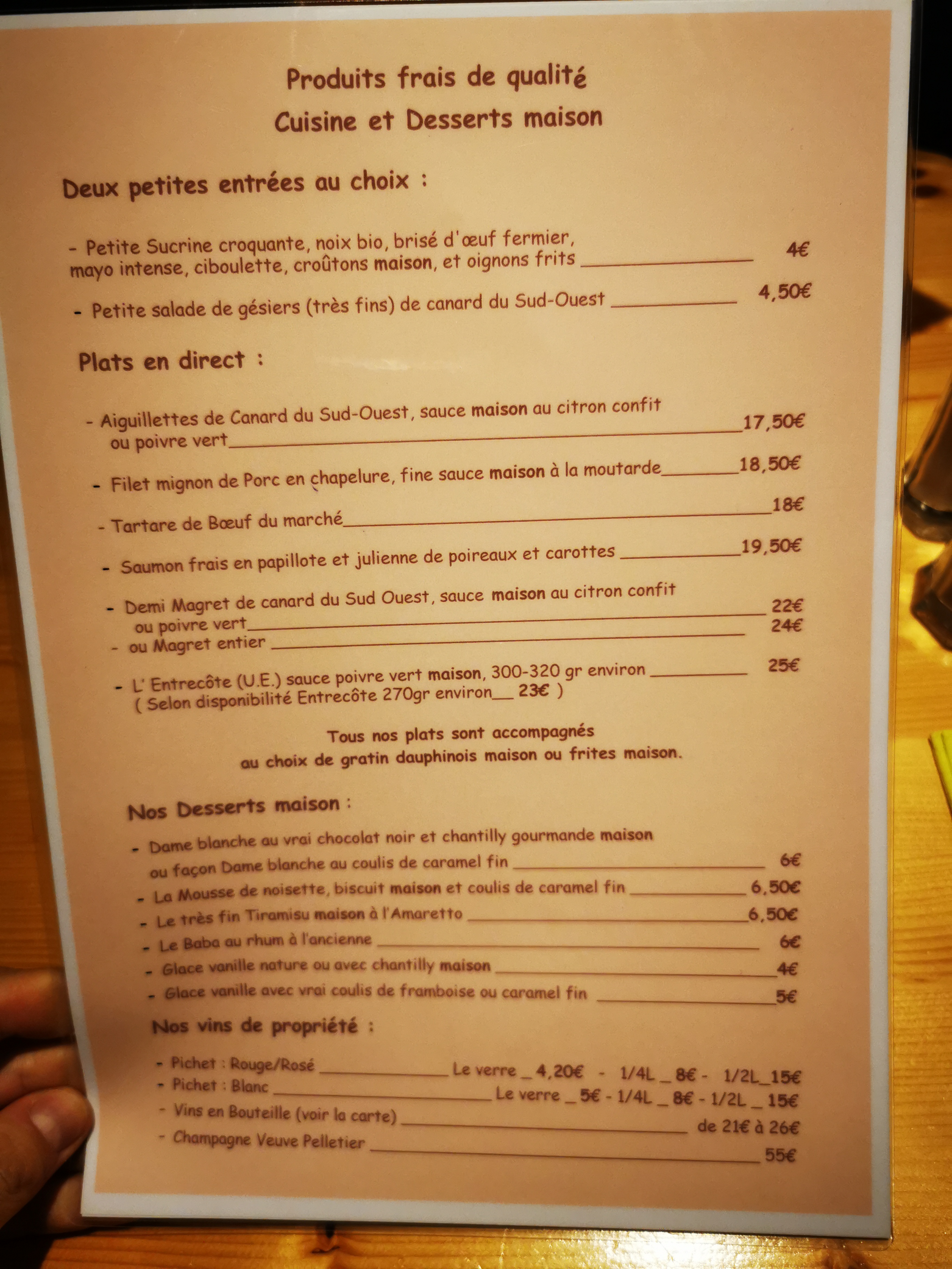 Un bel endroit où on y mange bien à l'intérieur avec le chef qui nous vend du rêve surtout avec le gratin dauphinois qui était excellent et qui nous explique bien les plats proposés sur la carte en prenant son temps. On est bien accueilli le service est rapide. La réservation est fortement recommandée le restaurant se remplit vite. Il vaut mieux réserver avant l'ouverture du restaurant par téléphone car une fois que le service a démarré ils sont moins disponible à répondre au téléphone. Je recommande fortement ce restaurant 😉👍