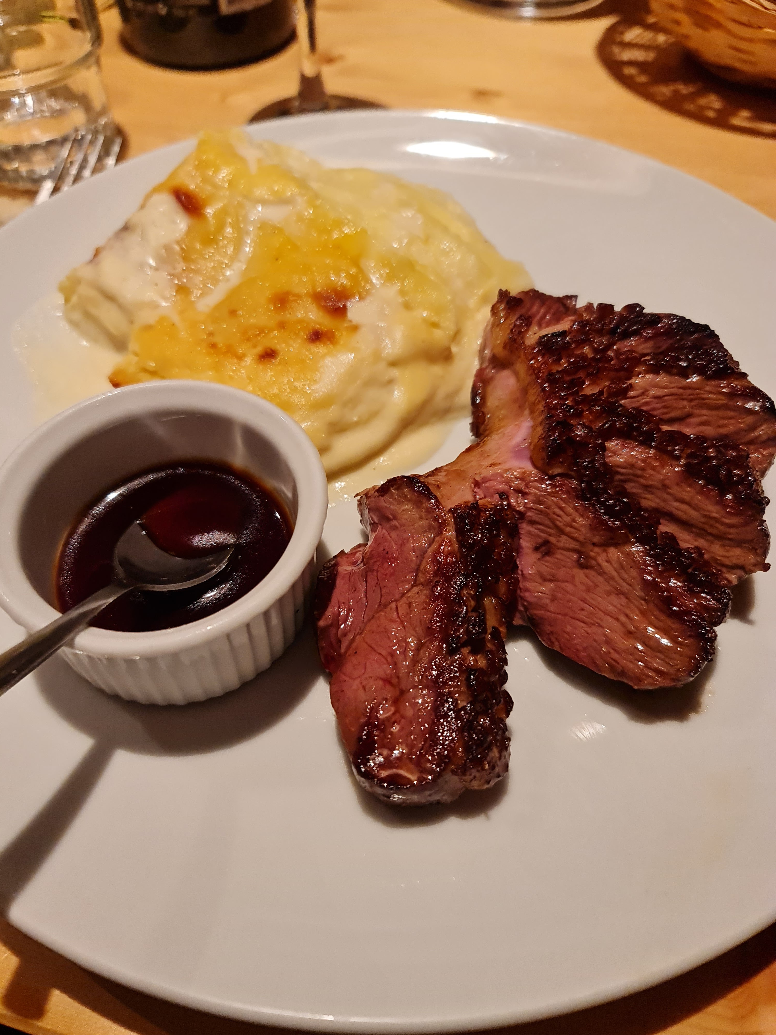 Bon rapport qualité prix concernant les plats ! Le magret entier était à 24€ et était parfaitement cuit (un peu steaké c’était top) 😍. Je rejoins les autres avis sur le gratin dauphinois : il était à tomber (ainsi que le pain d’ailleurs). Les entrées seraient peut être à revoir (un peu trop simples à mon goût) ainsi que les frites mais rien de bien méchant.