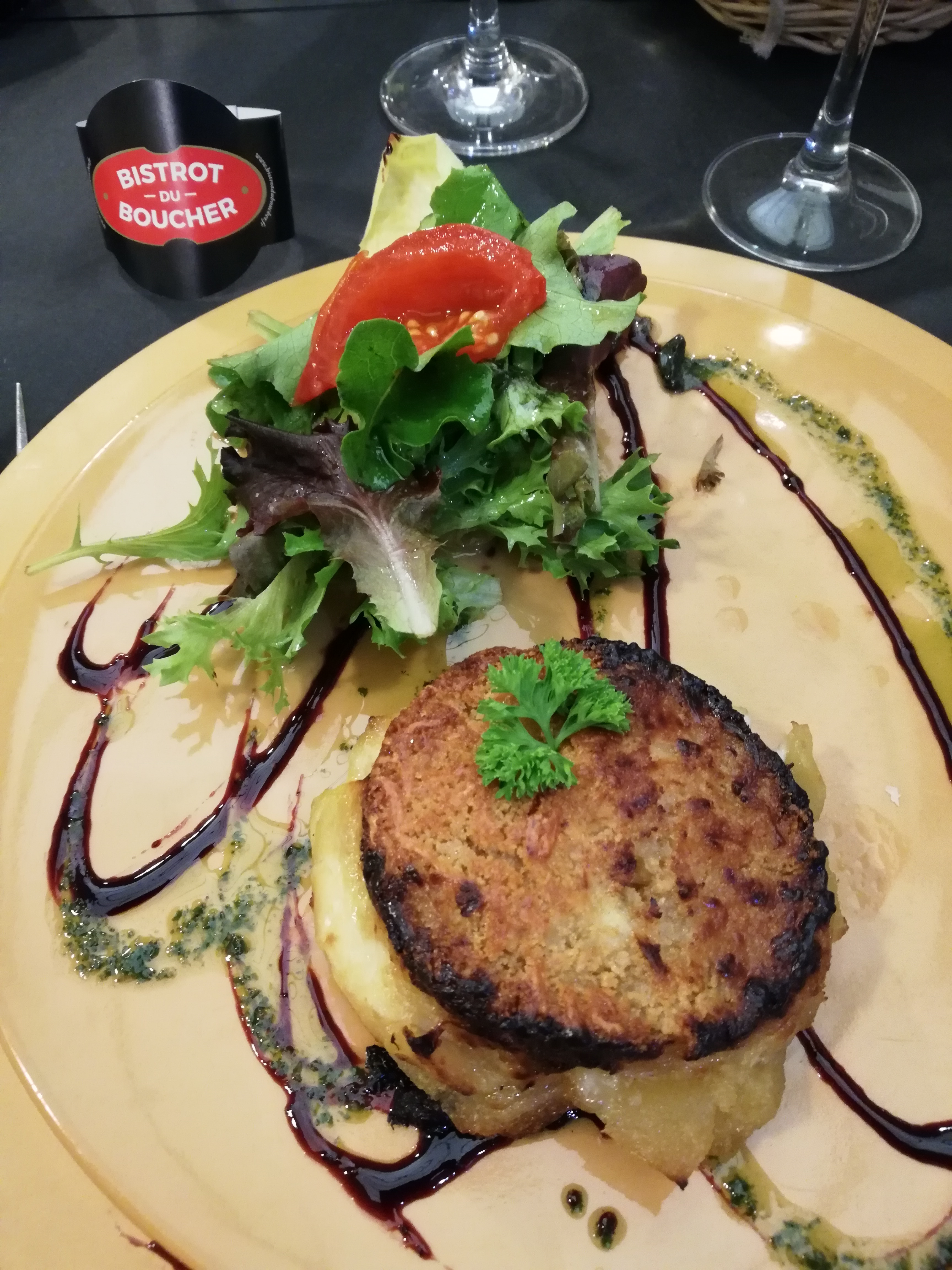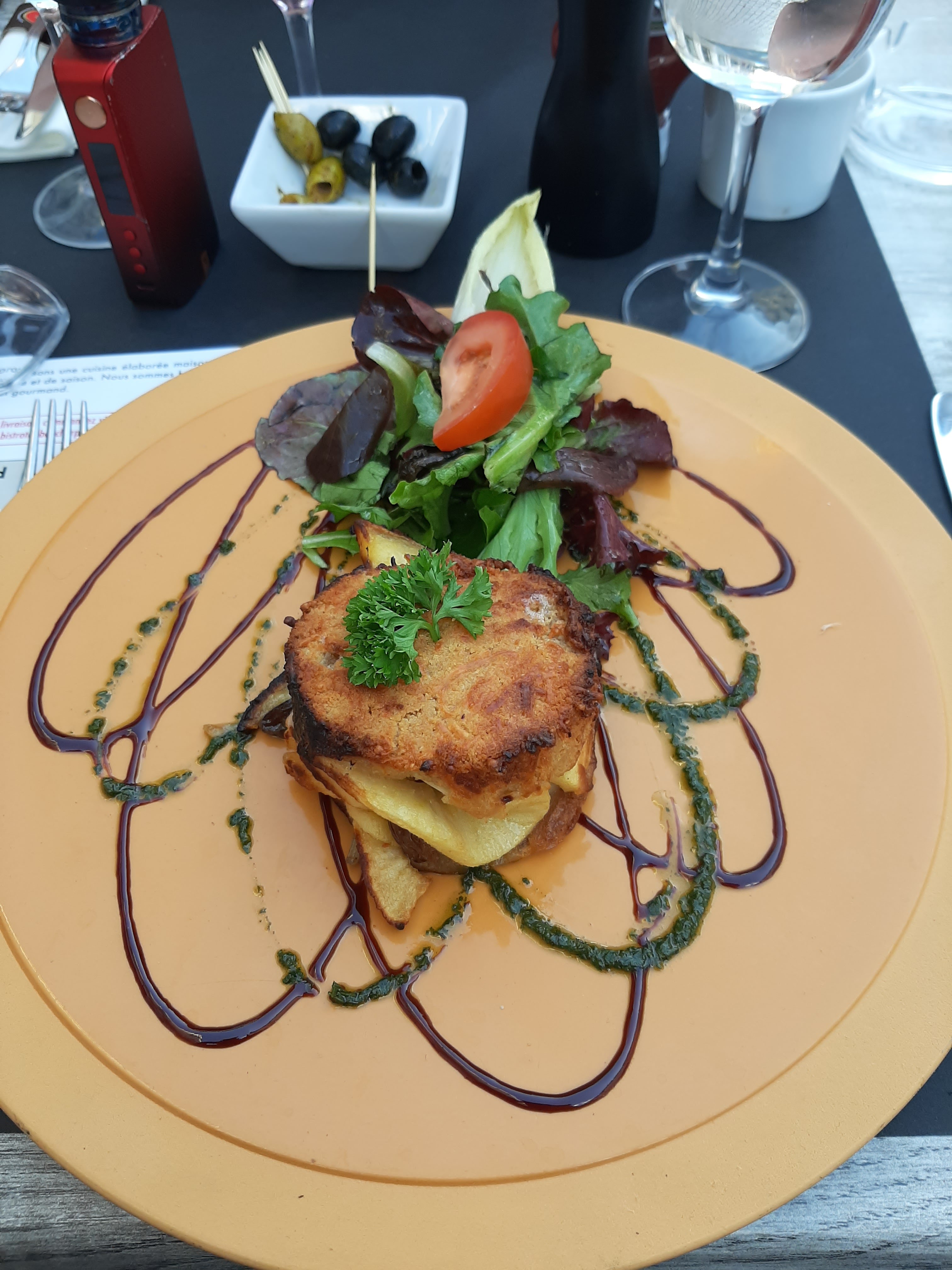 Dîner en terrasse mais ce que j'ai vu de l'intérieur du restaurant me semblait très jolie. Propre. Cadre chaleureux. Le personnel et a ce qui s'apparente être la patronne très souriant(e), accueil très bon. Pour le repas je conseil le crumble au chèvre chaud avec de la pomme et raisin. Et le burger est tout bonnement excellent loin d'un burger que l'on a l'habitude de voir. Niveau prix très étonné pour la qualité/quantité. Et les pommes frites un régale.