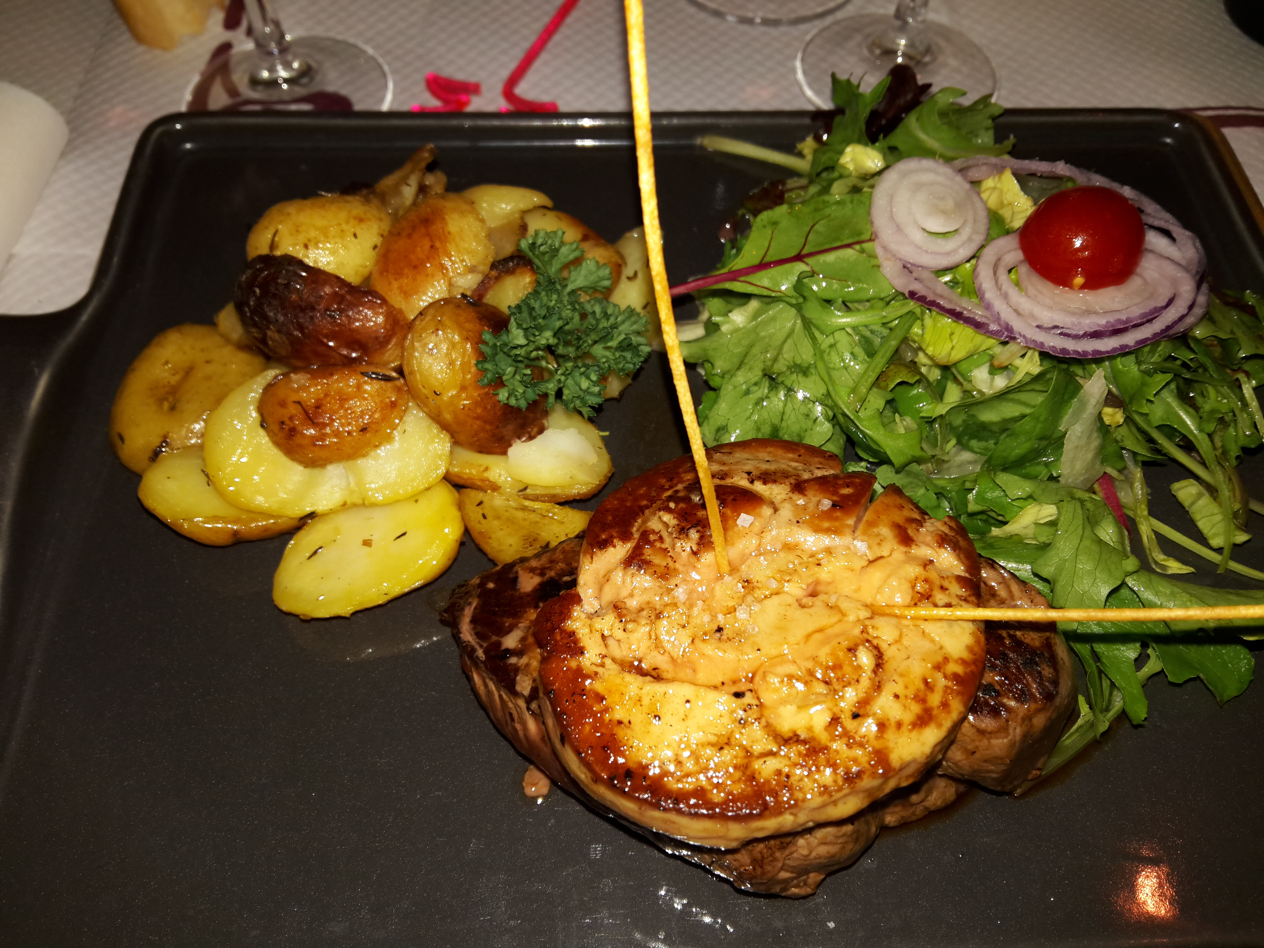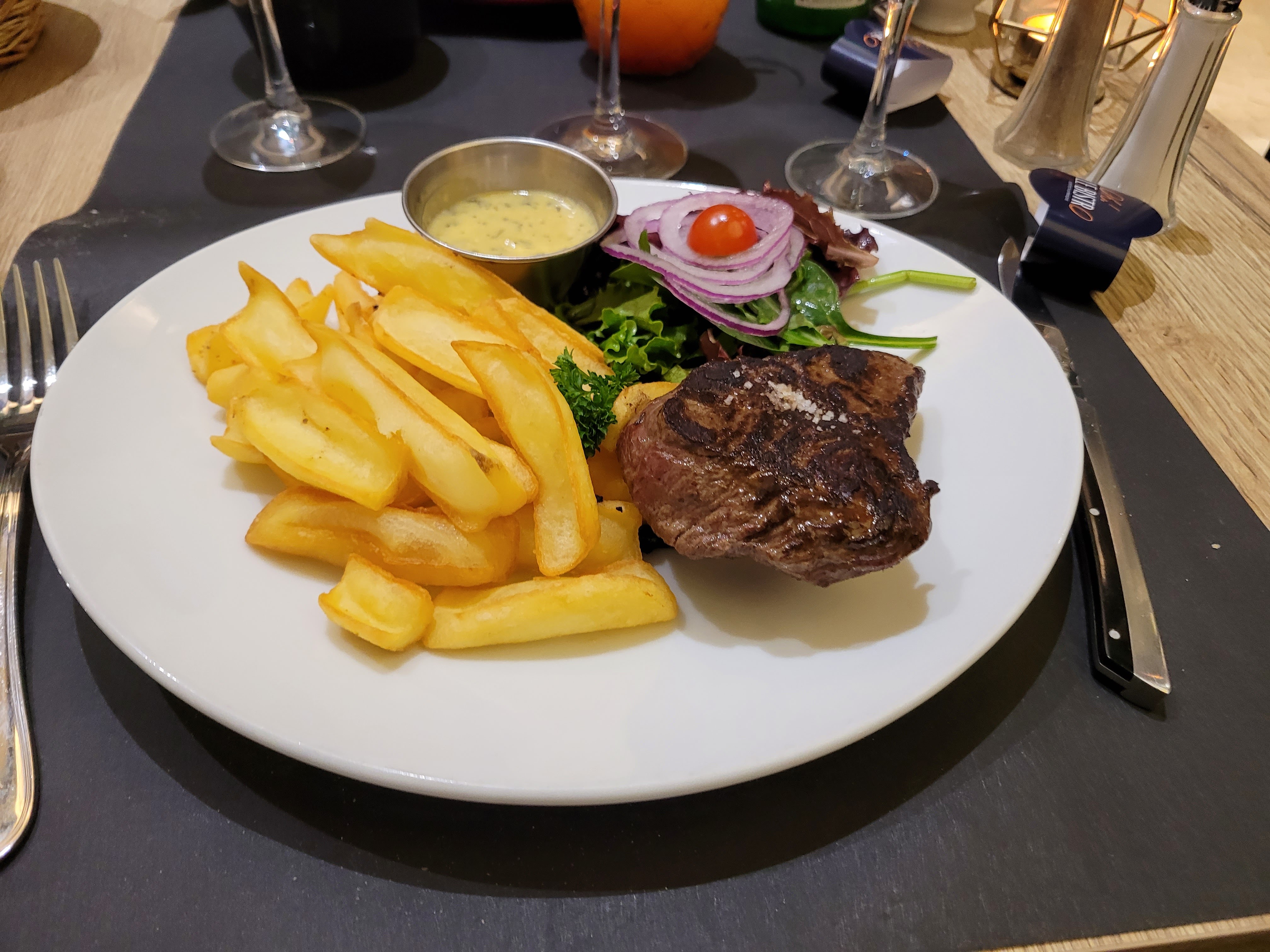Tout d'abord je vous recommande de réserver pour mangé il y a souvent beaucoup de monde , nous avons été très bien servi par notre jeune serveuse, l'entrée au escargots et tout simplement délicieuse je vous recommande fortement, et l'entrecôte était très bonne mais un peu plus m'aurait mieux satisfait mais je suppose qu'elle devait faire le poids indiqué ? J'ai pu goûter l'entrée au fois gras qui était délicieuses merci pour ce bon moment à bientôt