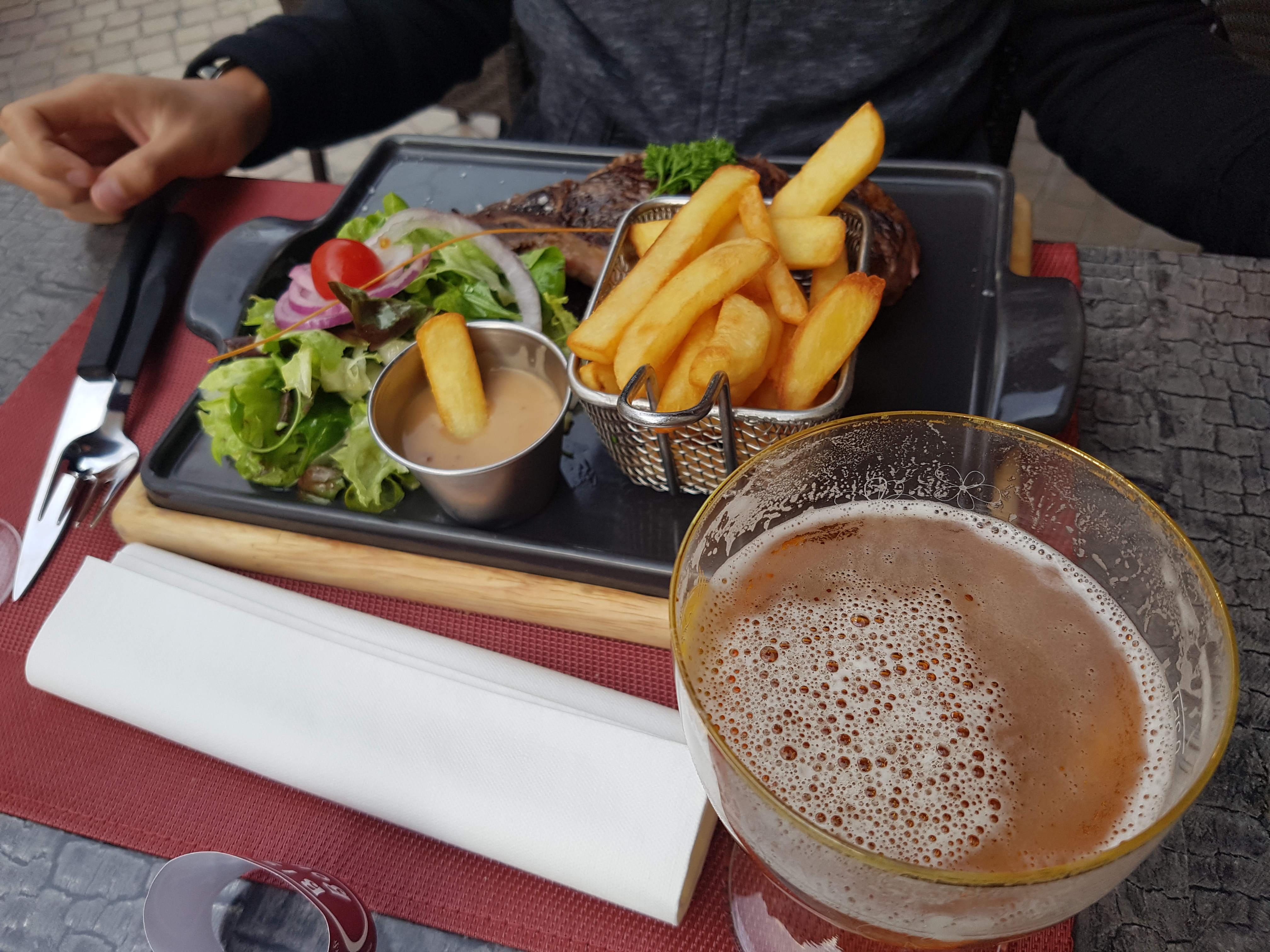 -tartare qui n’a pas de goût. Nous avons du réclamer les condiments (Worcester sauce, etc) pour rajouter du goût. Dans la plupart des restaurants où nous mangeons du tartare, ces condiments sont amenés par défaut. - la salade qui était servie avec nos plats était défraîchie. Nous l’avons signalés à la serveuse qui a admis que en effet la salade n’était pas belle. Aucun geste commercial de leur part. Nous avons réclamés, ils ne voulaient rien faire. Ils ont finis par nous donner une remise de 3 et quelques euros mais il a fallu réclamer. Pas de professionnalisme alors que c’est une partie du plat que nous n’avons pas pu manger mais que nous avons payés!