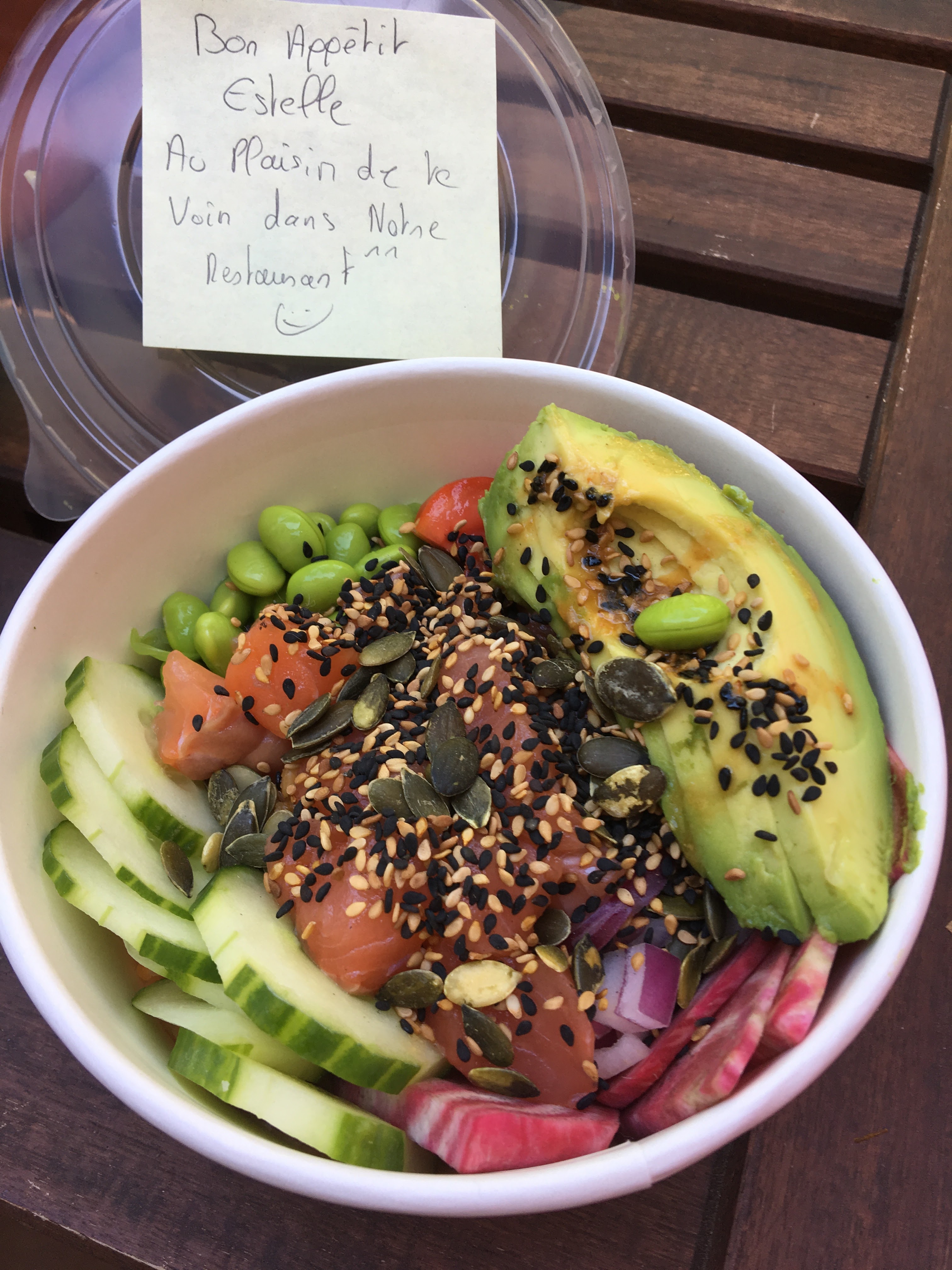 En livraison au bureau. Poke à composer avec un grand choix d'ingrédients. j'ai pris un poke bowl regulier avec une base de lentilles (a la place du riz) et un supplément avocat pour 13.90 euros. Produits frais, très bon et suffisamment copieux. Avec en plus un sympathique petit mot 😀. Je recommande. Merci à bientôt
