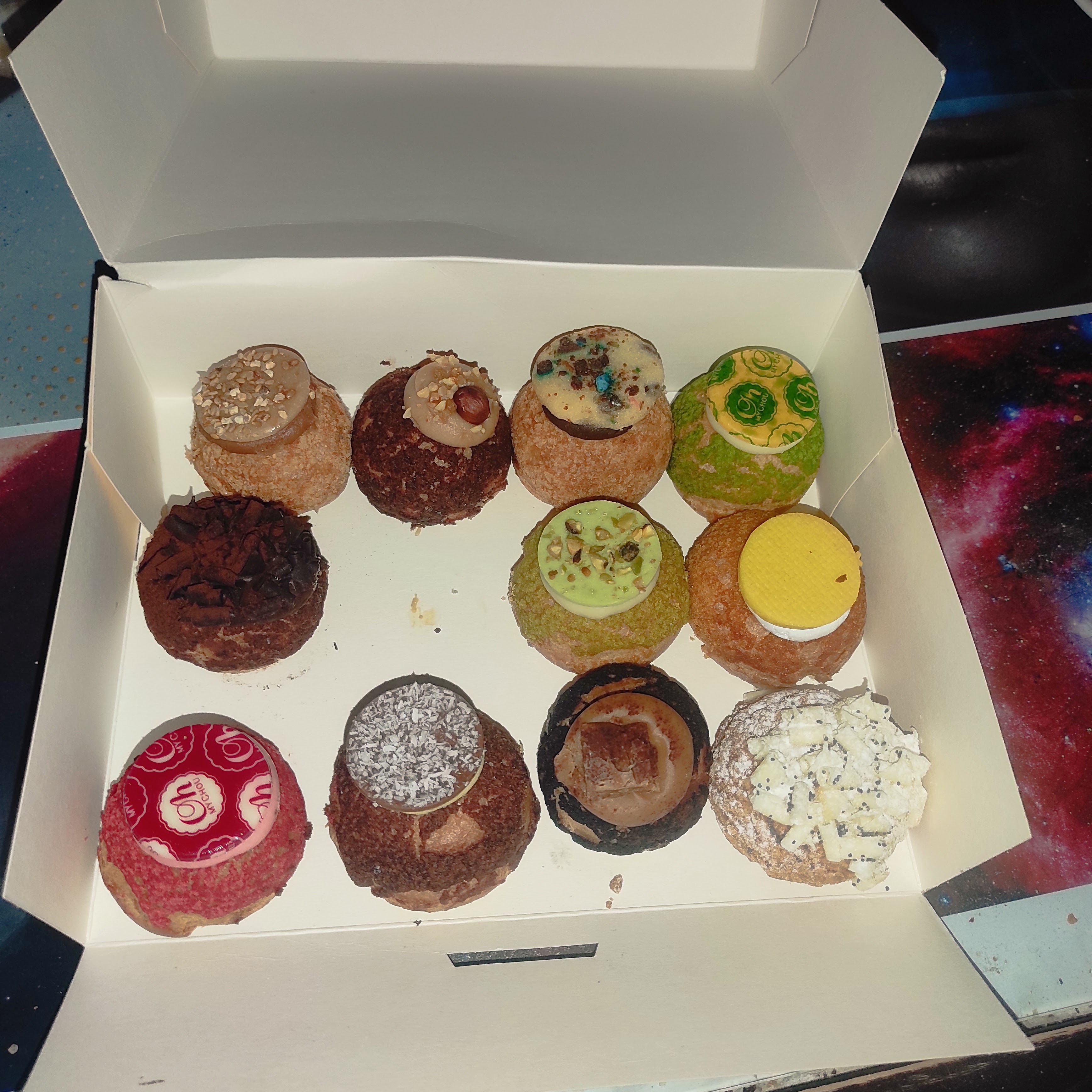 Nous avons acheté une grande boite de choux pour pouvoir gouter à des parfums différents nous en avons adoré certains et d’autres moins. Cela n’est qu’une question de goût ! Toutefois nous nous questionnons sur la fraicheur de certains choux🤔 Excellent accueil d’un jeune homme