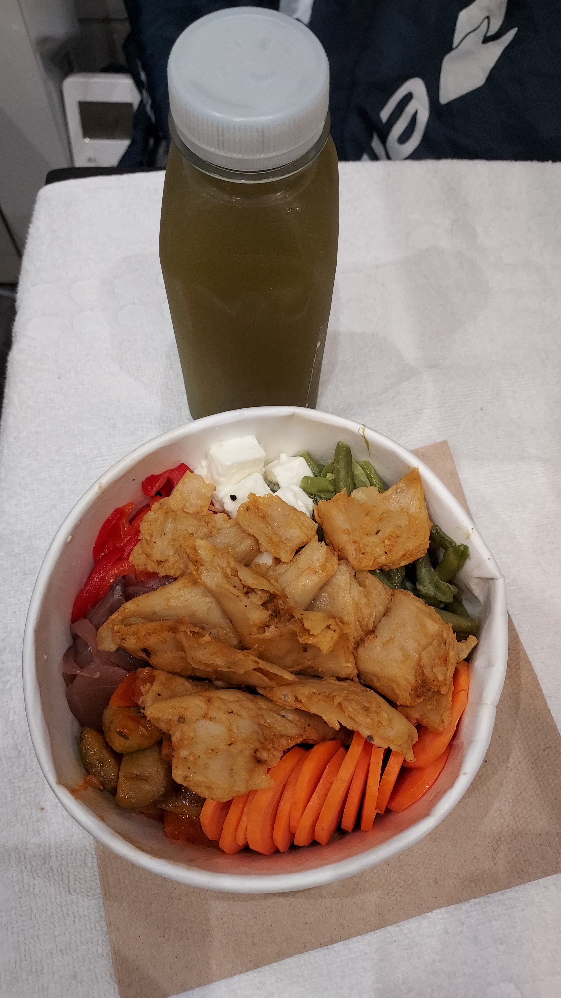 Le contenant est trop rempli donc il est difficile de mélanger les ingrédients avec la sauce et de déguster le poke sans en mettre partout. Les produits sont bons mais pas assez choix de sauces et dommage qu’il n’y ait pas de salade verte en base.