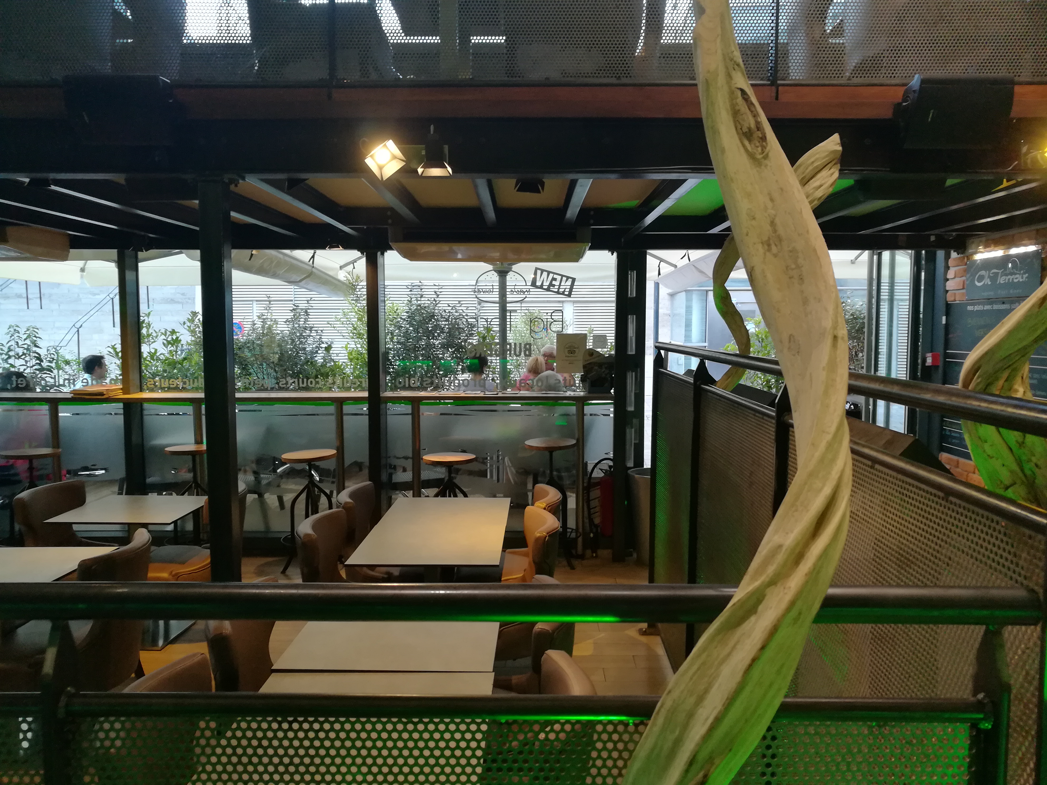 Le mur végétal fait son petit effet lorsqu'on rentre la première fois dans l'établissement. On commande sur une borne le plat, puis en libre service son dessert et la boisson. On se laisse guider devant la cuisine et la caisse. Nous pouvons manger sur une terrasse, ou à l'intérieur : sur le balcon (avec une vue très sympa sur le mur végétal d'un côté, de l'autre le jardin de la charpenterie, ou bien en bas. Le personnel est très professionnel et convivial. La nourriture est excellente. Ça coûte certes plus qu'un MacDo mais alors là différence est juste hallucinante. À faire et à refaire.